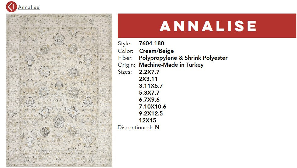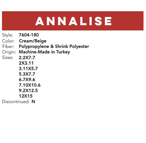 The Annalise collection is made of polypropylene and shrink polyester, machine-made in Turkey. The collection features traditional designs that add a layer of elegance to any room. The traditional look is combined with Cream/Beige that compliment a variety of home décor styles. Thanks to its composition, this rug is soft to the touch, but also holds up well in high-traffic areas.