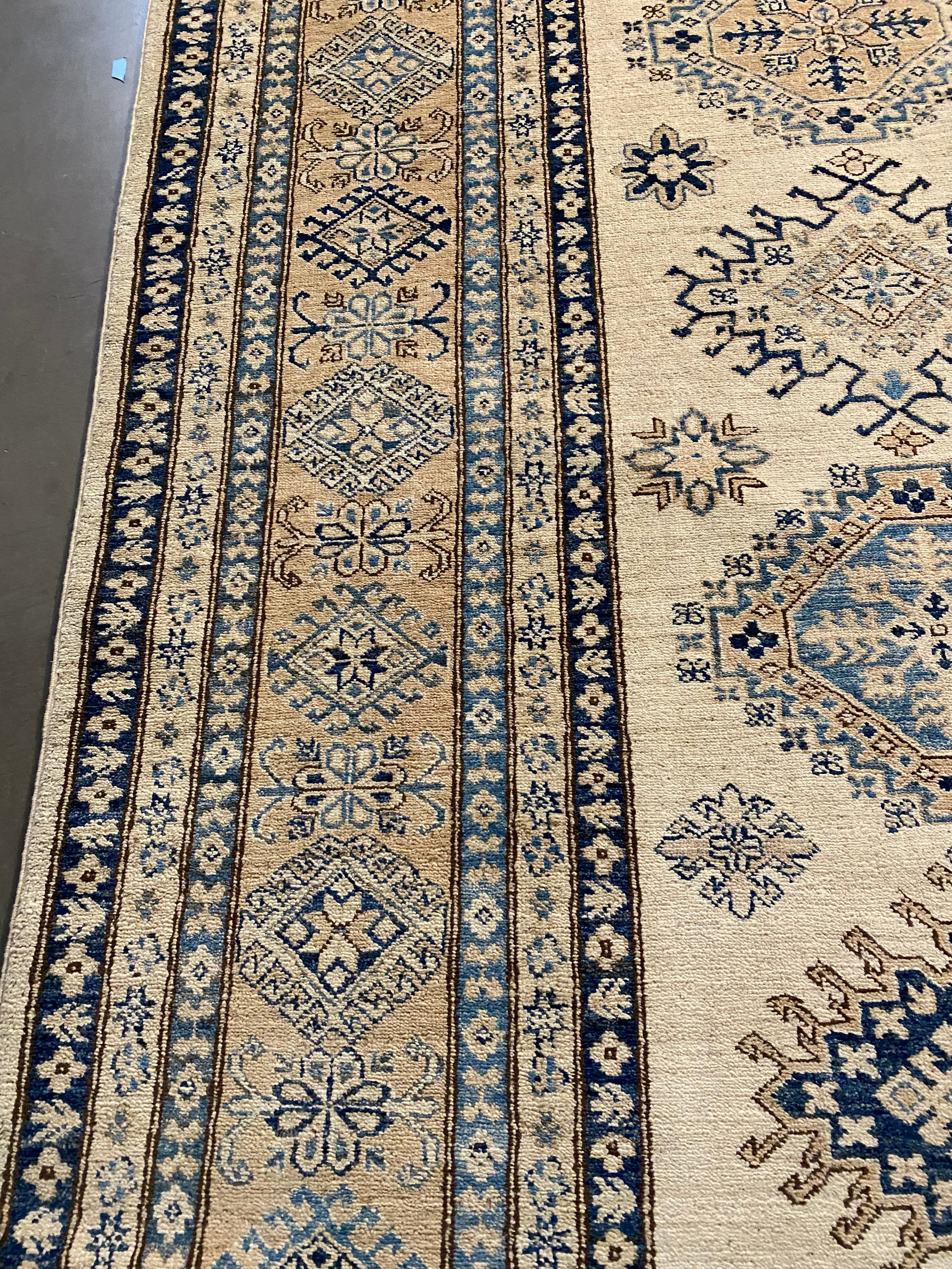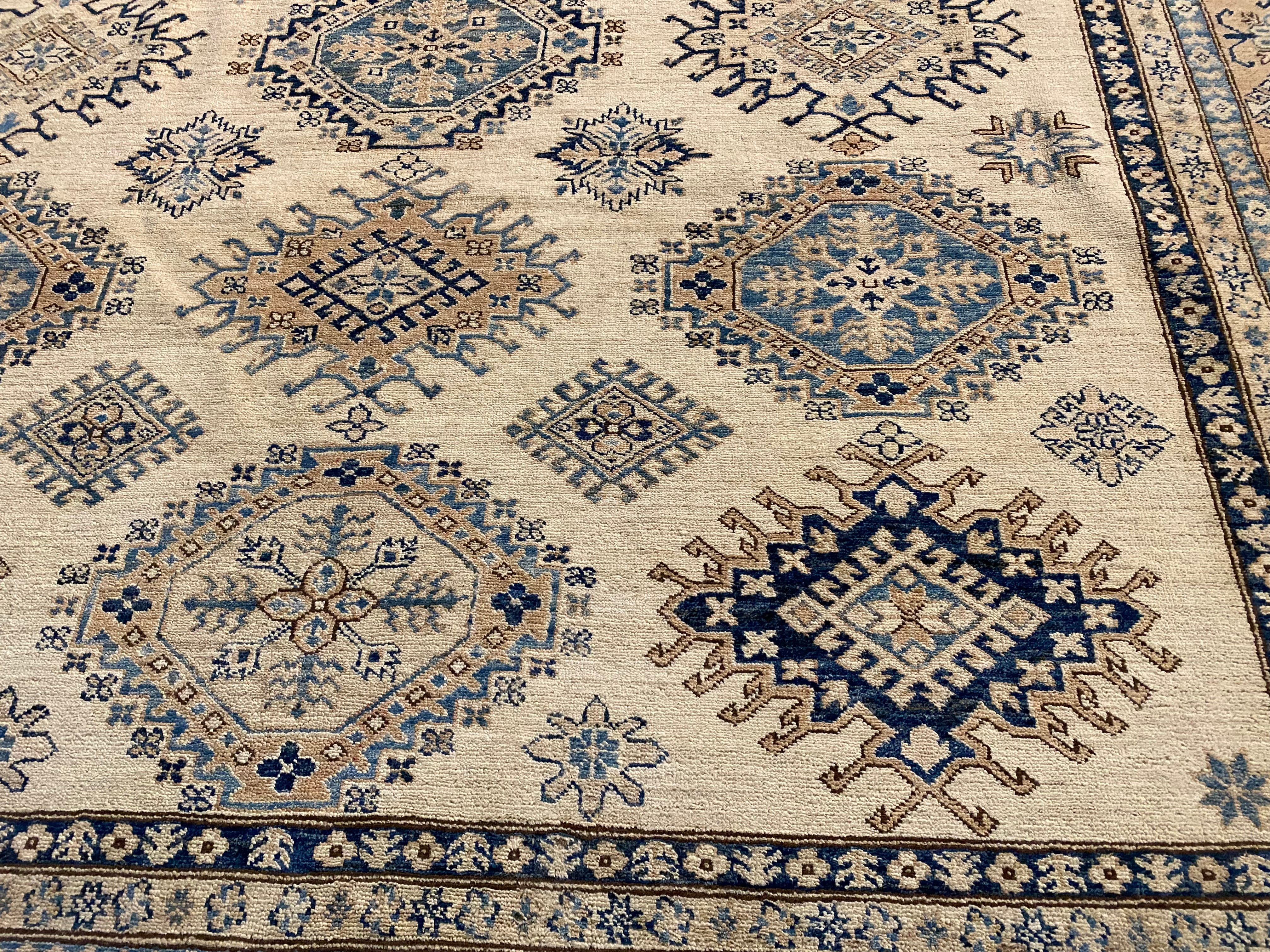9'.1"x12'.2" Super quality Kazak Rug, hand spun and hand knotted rug in Pakistan 100% Vegge Dye natural wool Pile , in Decorative, Ivory, grey and shades of blue colors.