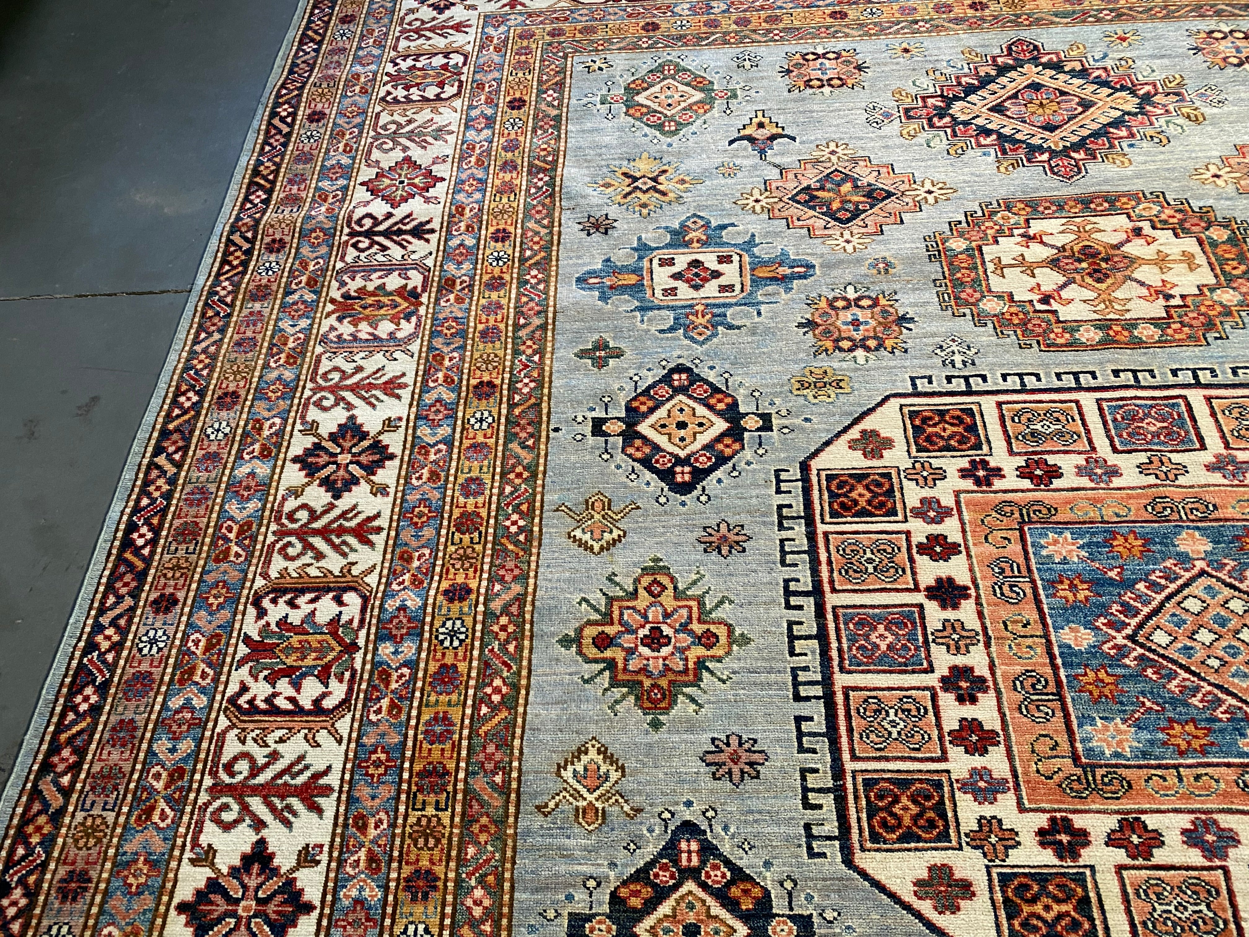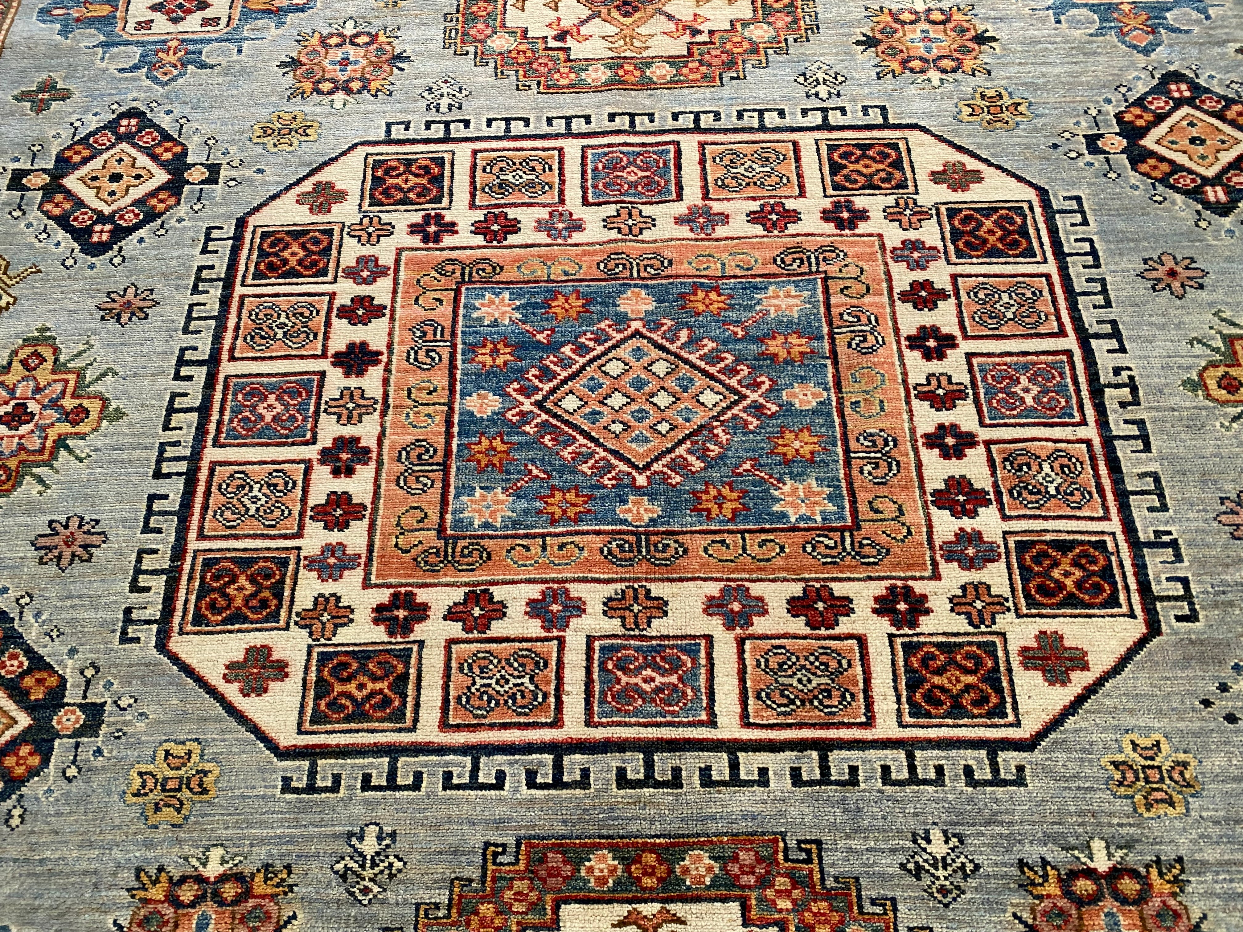 8'.2"x10' Super quality , Fine Kazak Rug, hand spun and hand knotted rug in Pakistan 100% natural Vegge Dye wool with beautiful Sheen Pile , in Light Blue , Ivory and multi pastel happy colors.