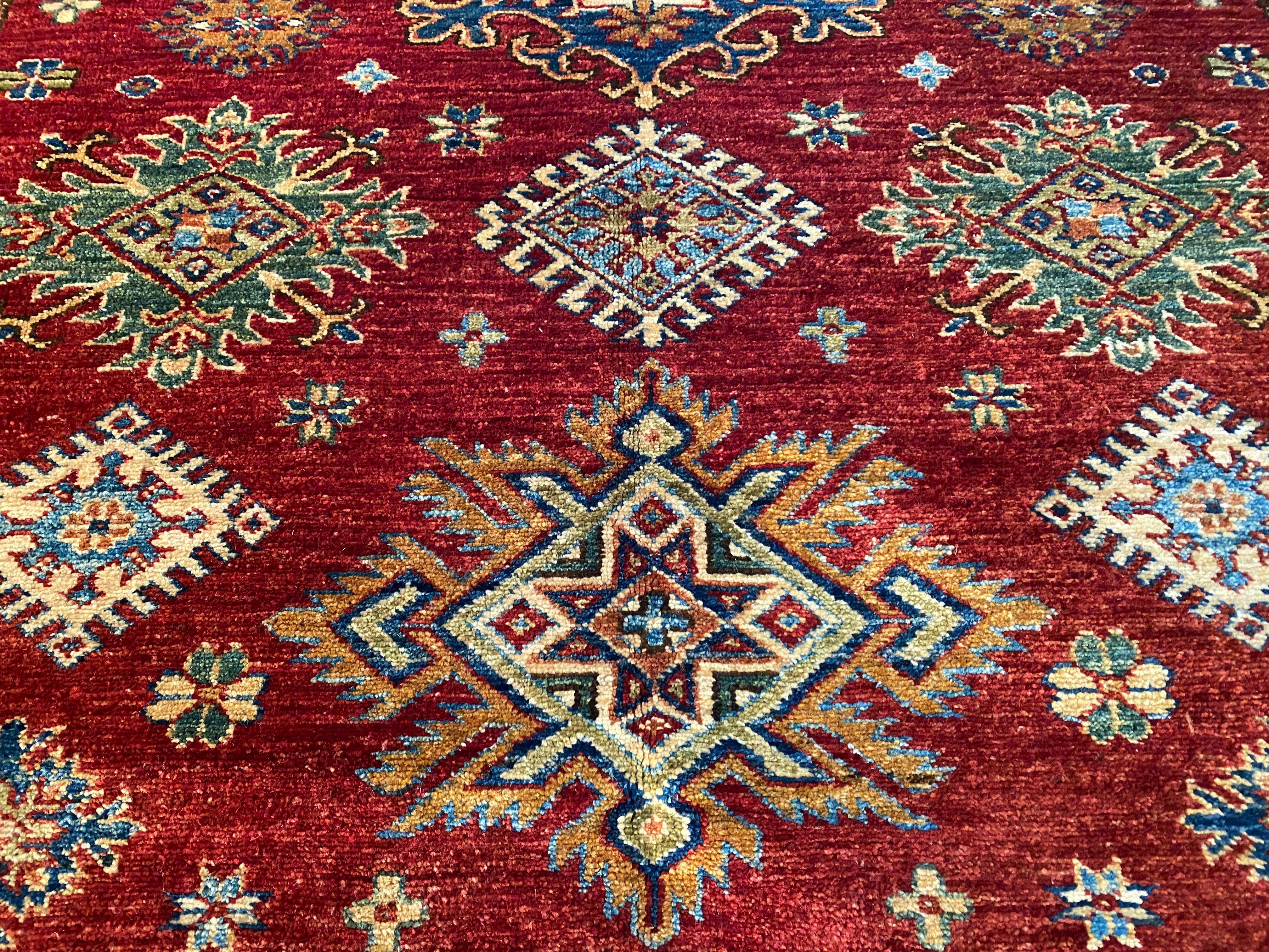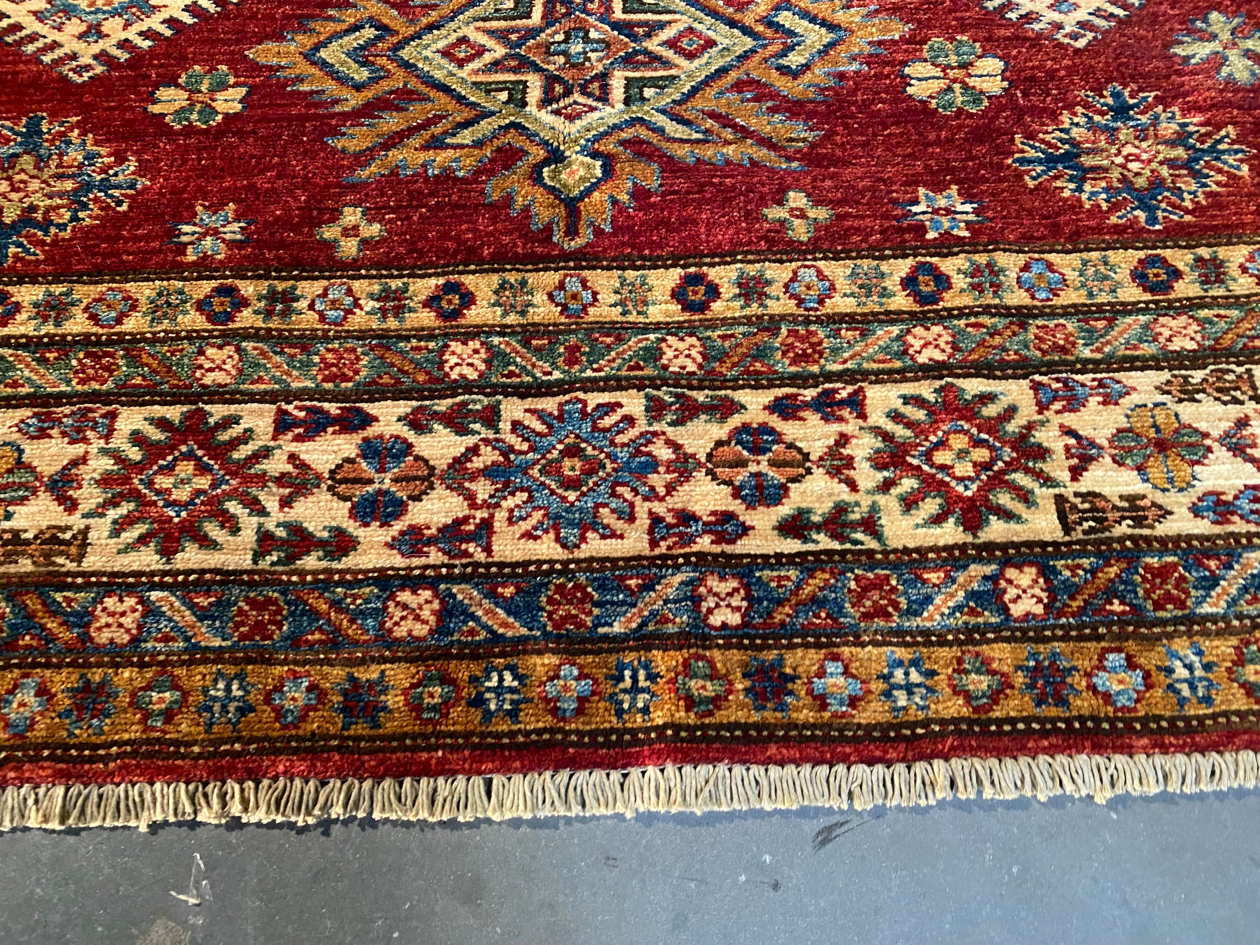 5'.1"X6'.8" Super quality Kazak Rug, hand spun and hand knotted rug in Pakistan 100% natural Vegge Dye wool pile, in Vivid Red , Ivory and multi accent colors.