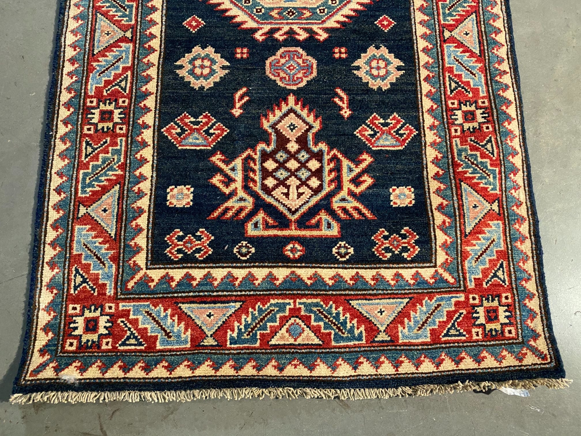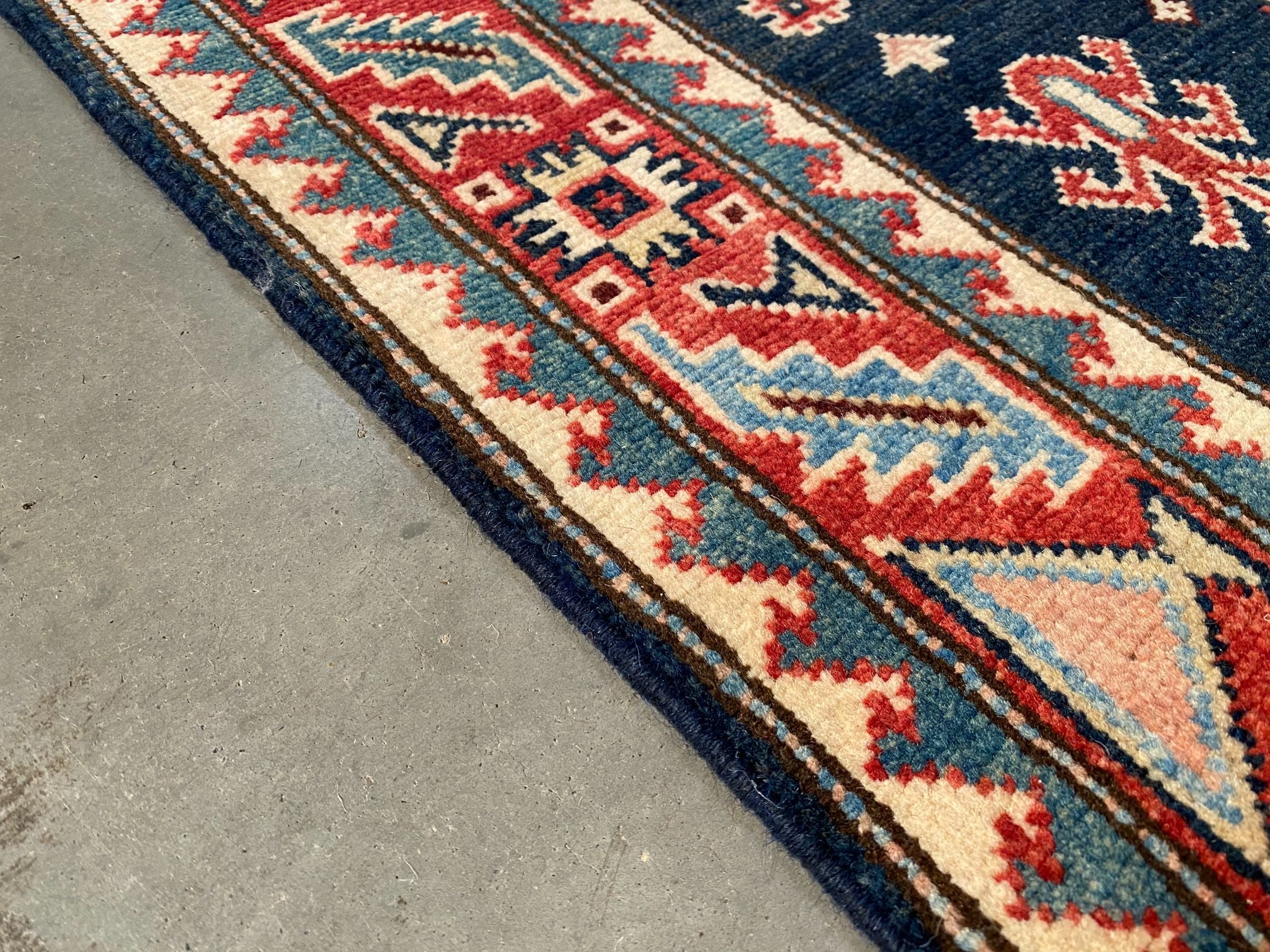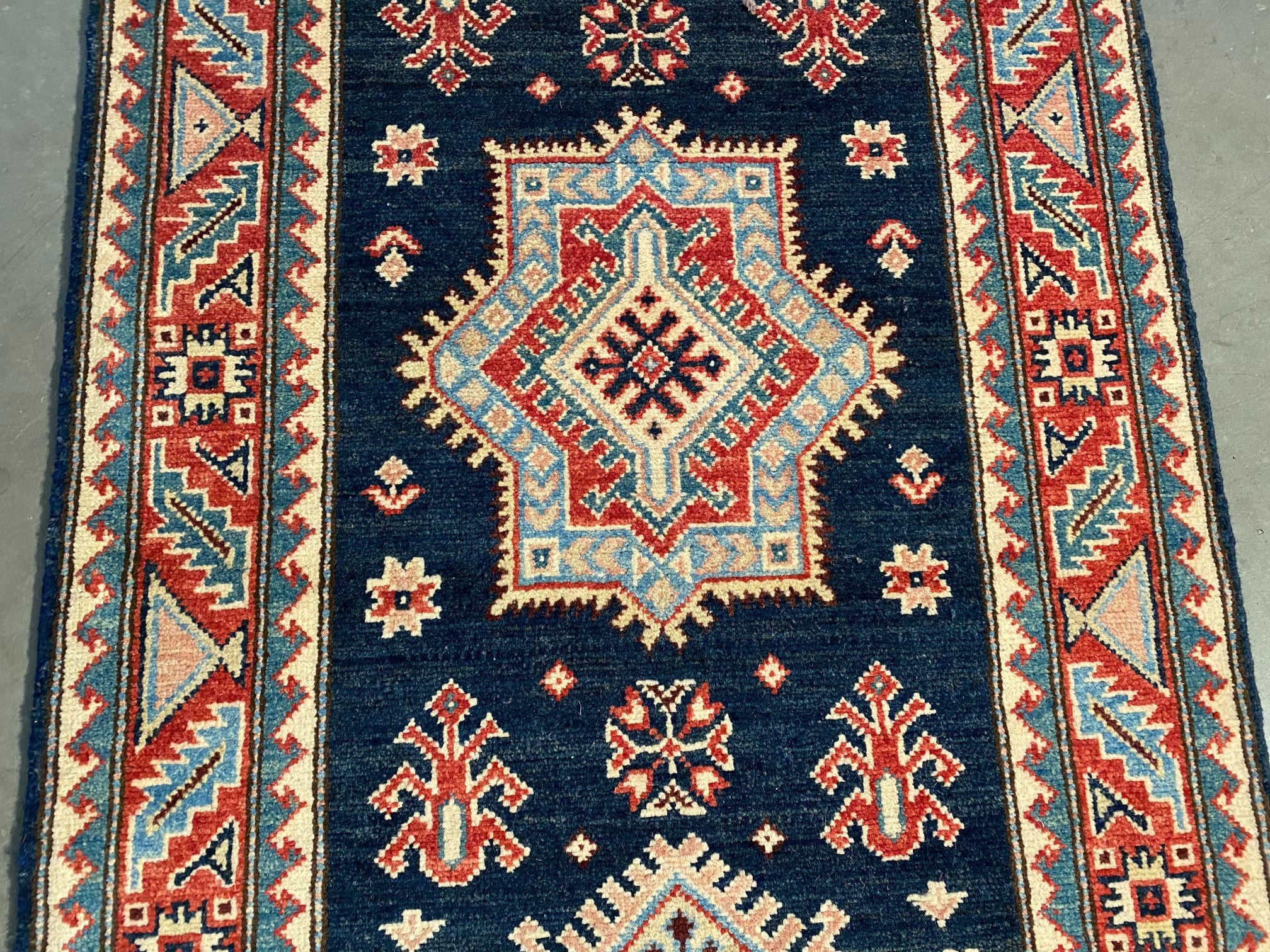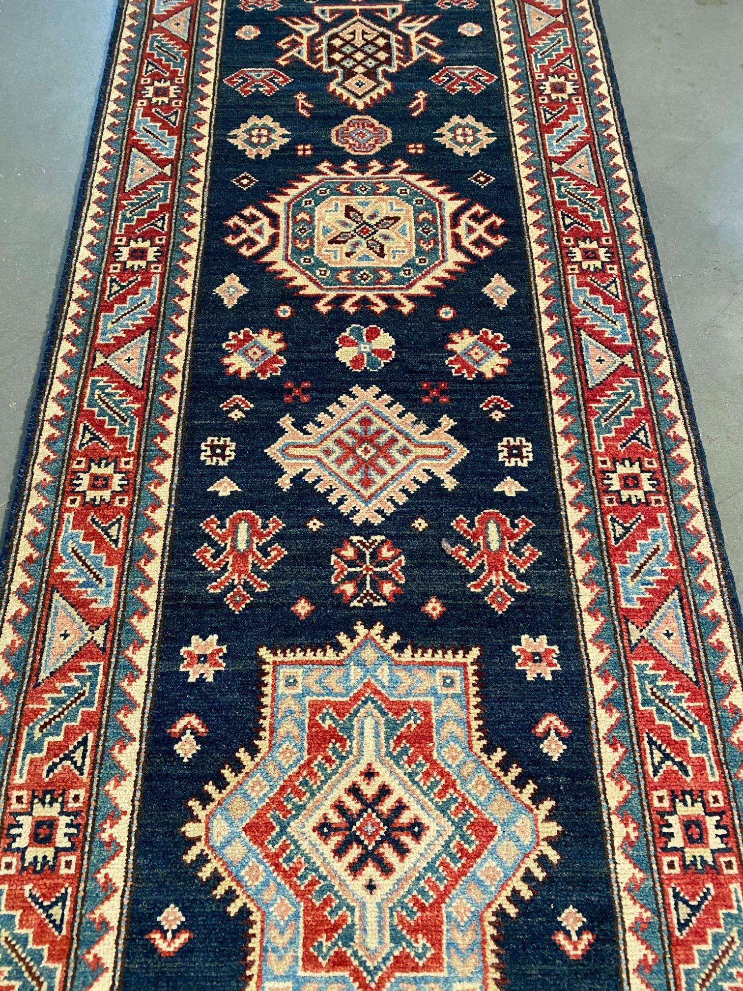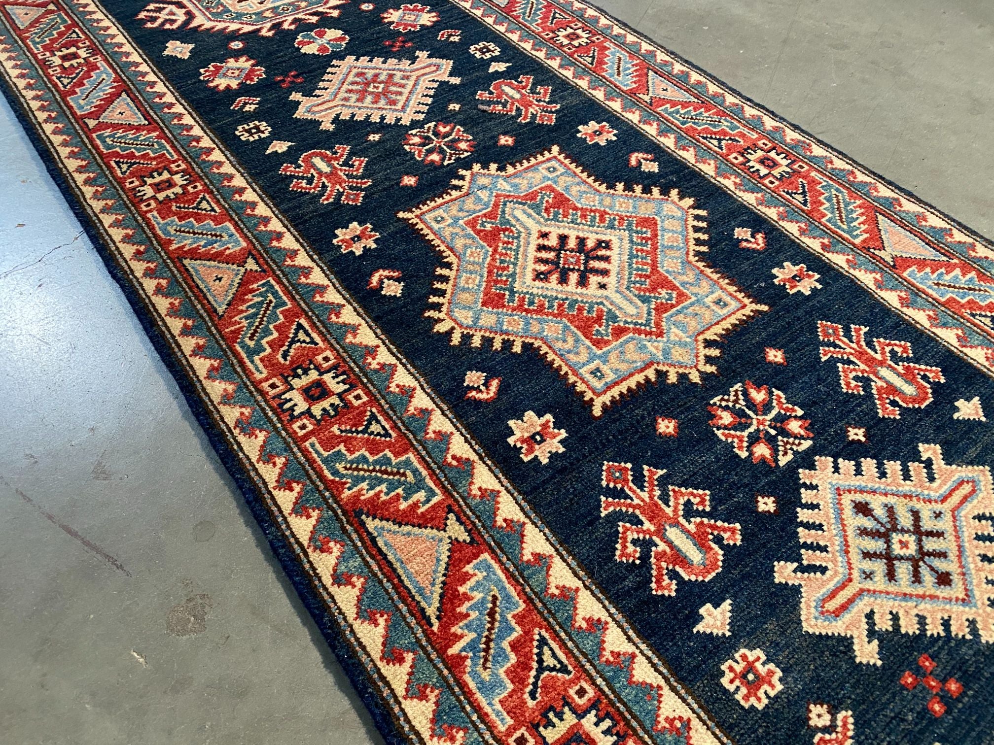 2'.7"X 7'.7" Hand Knotted 100% Veggie Dye Natural wool Pile Geometric pattern Kazak runner in decorative Deep Navy Blue and multi accent colors Hand Knotted in Pakistan.
