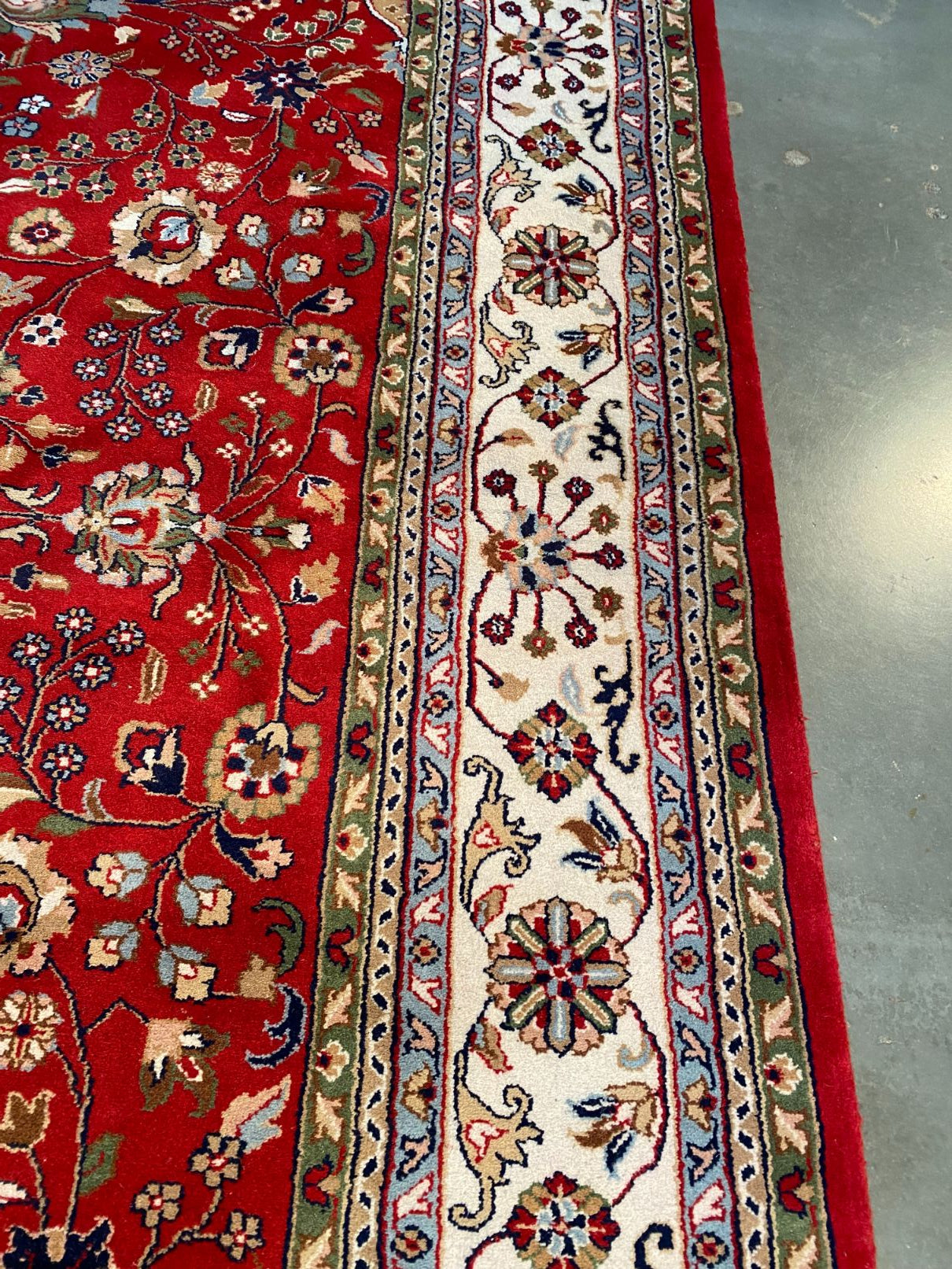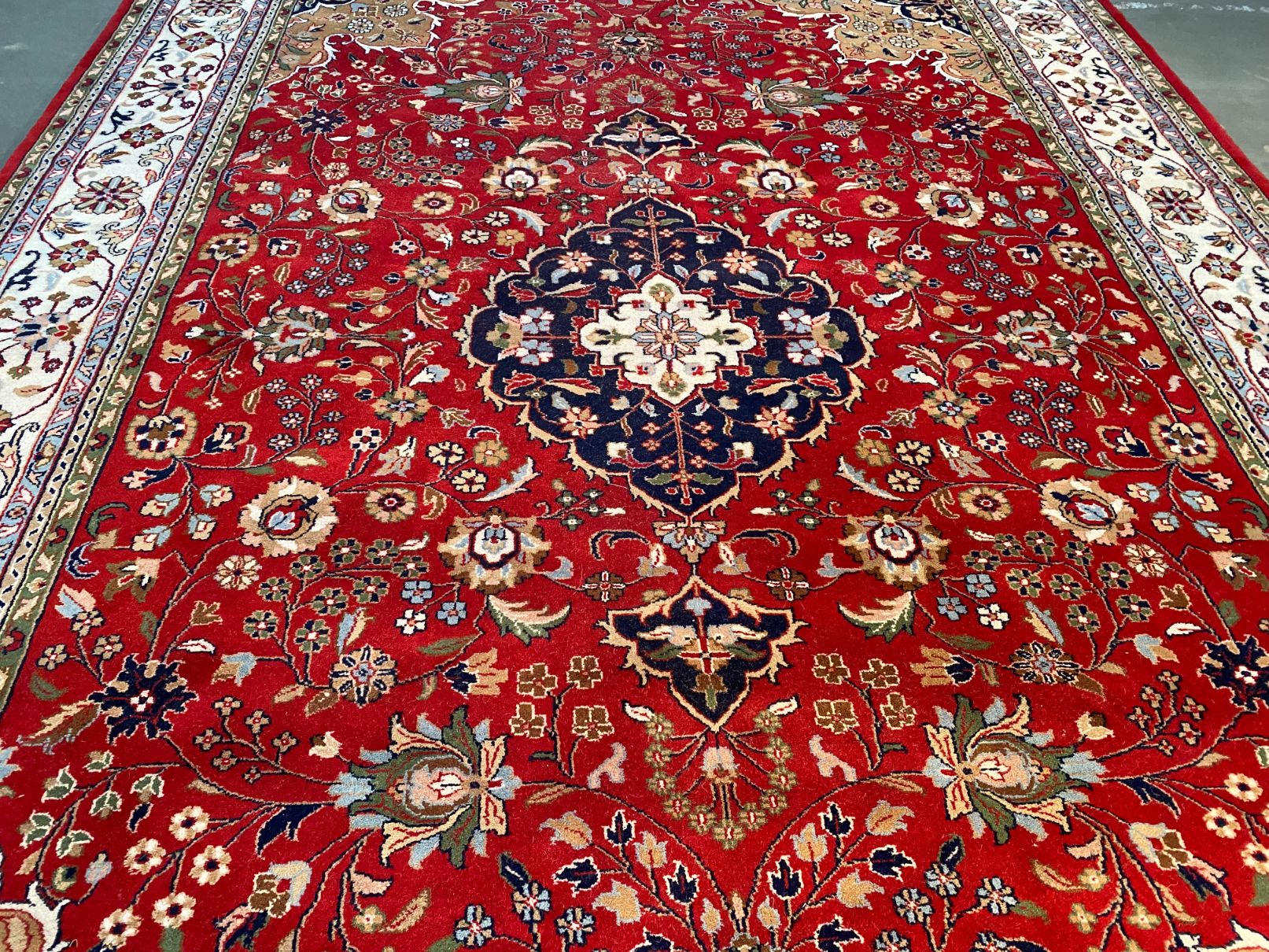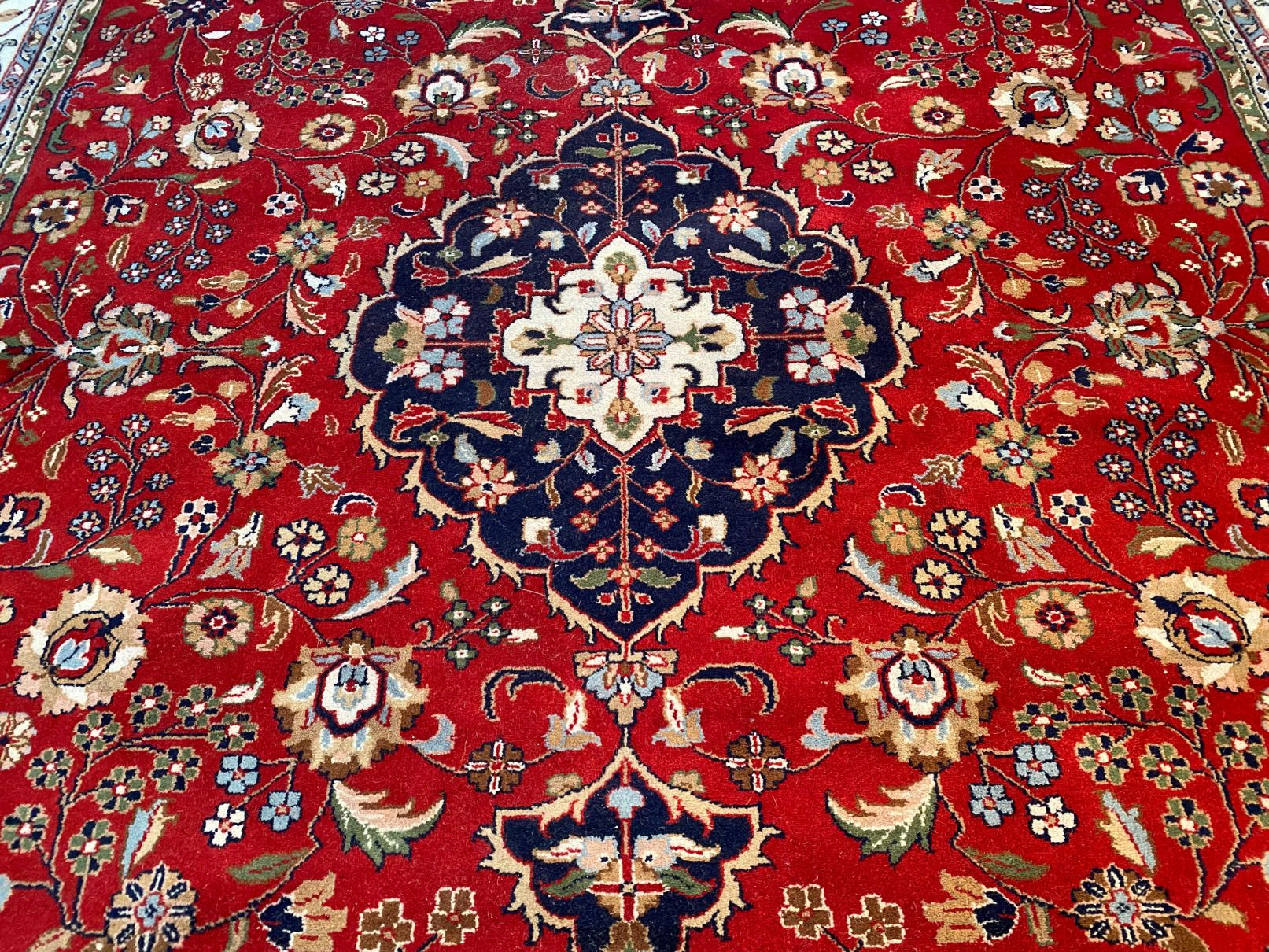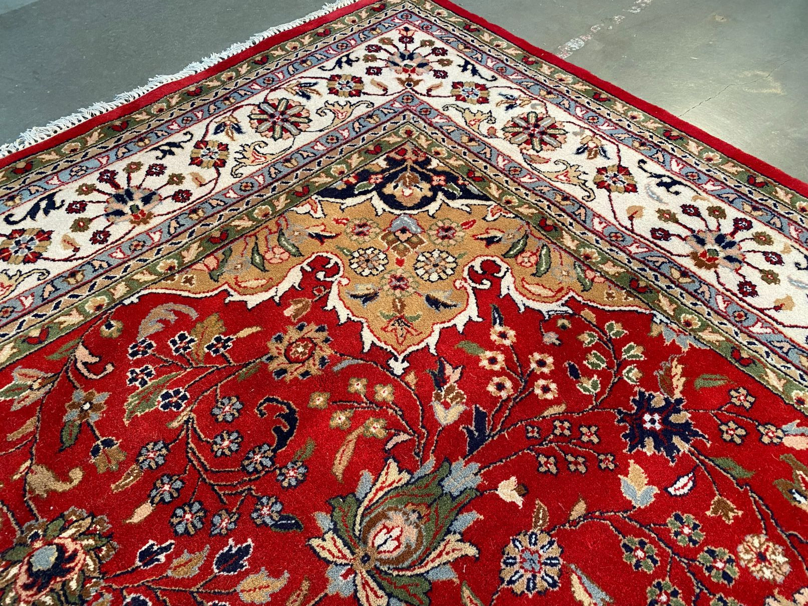 8.5x11 Persian Kashan design rug, 100% fine Vegge Dye wool pile, very heavy and thick pile , in Vivid red, Ivory, green and multi accent colors, hand knotted in India.