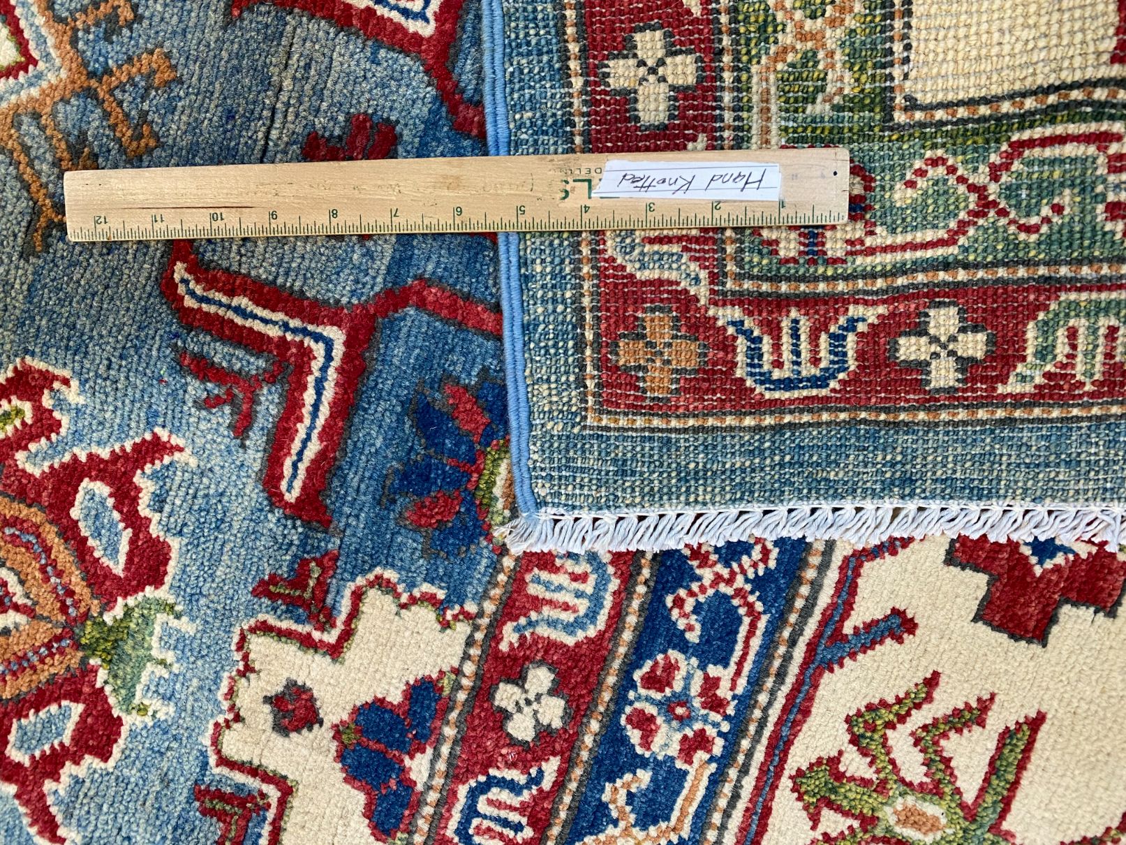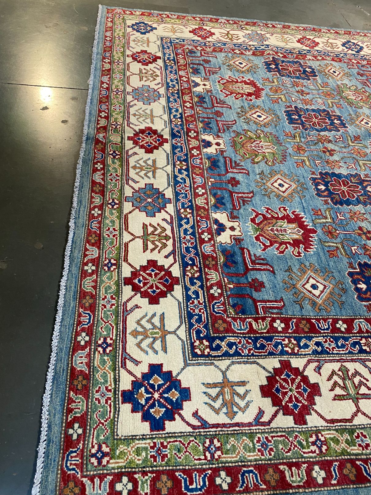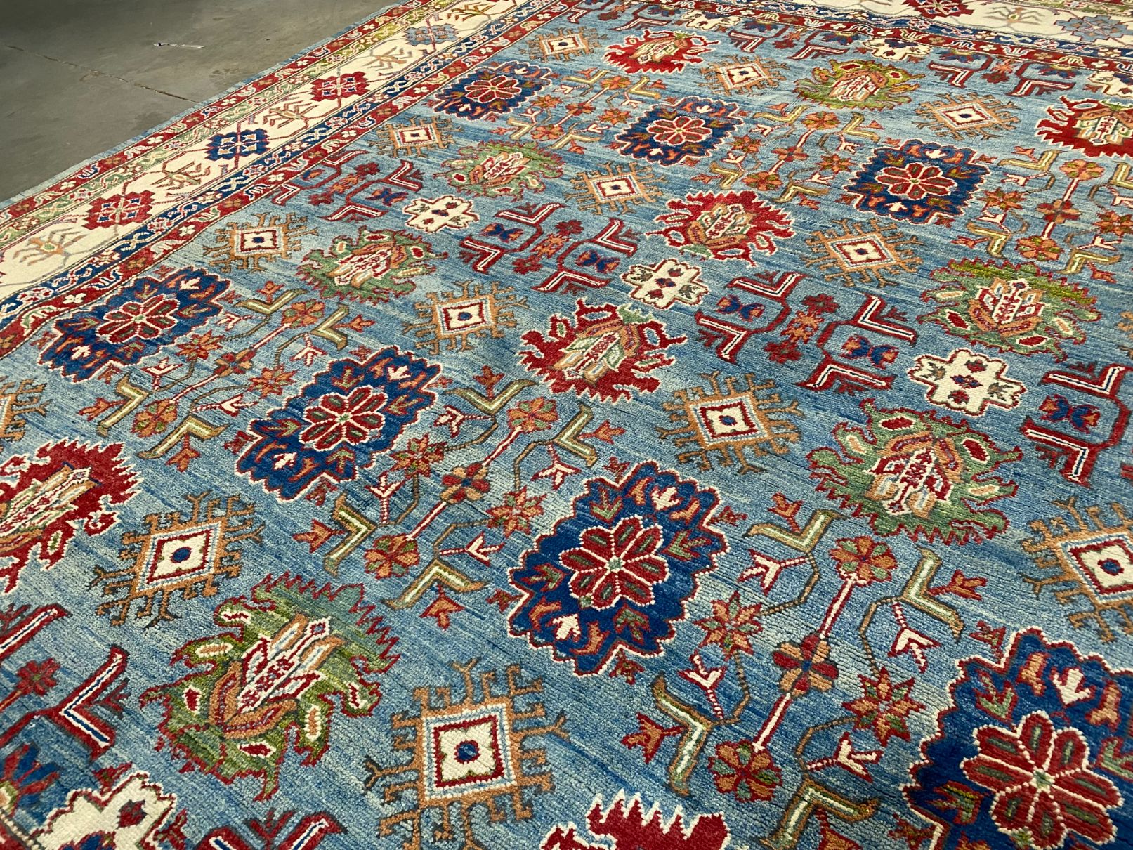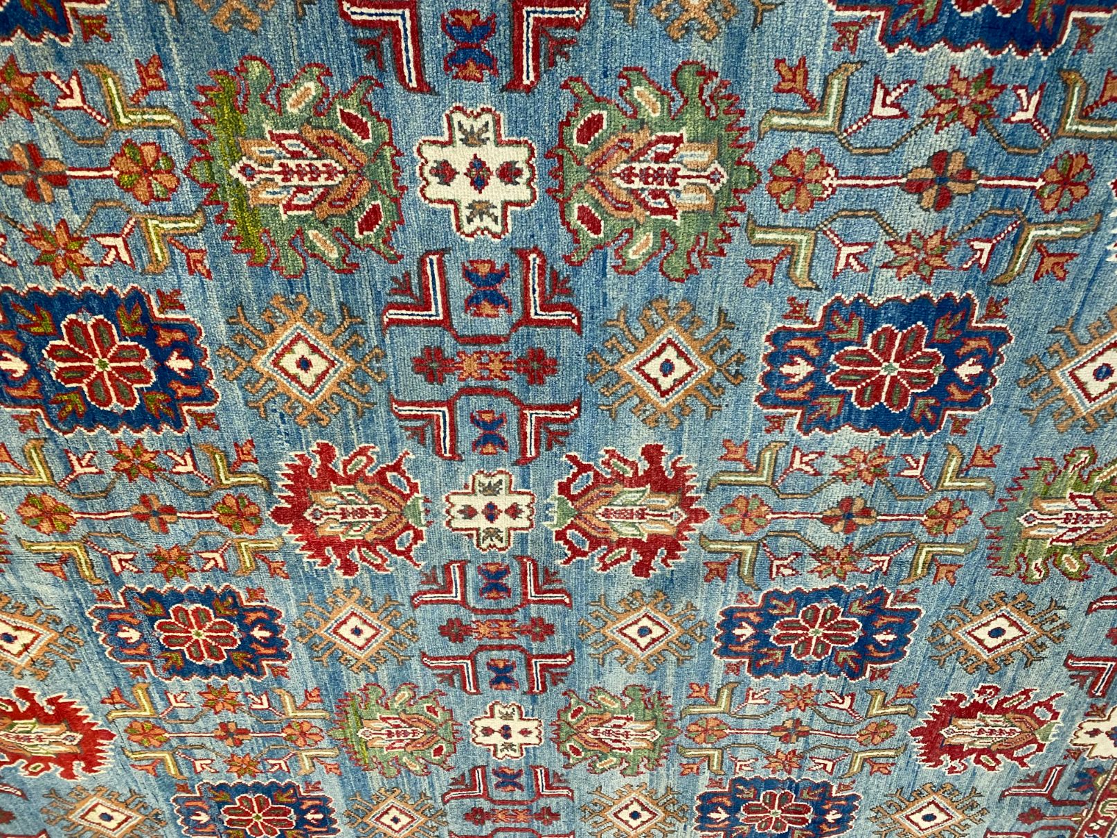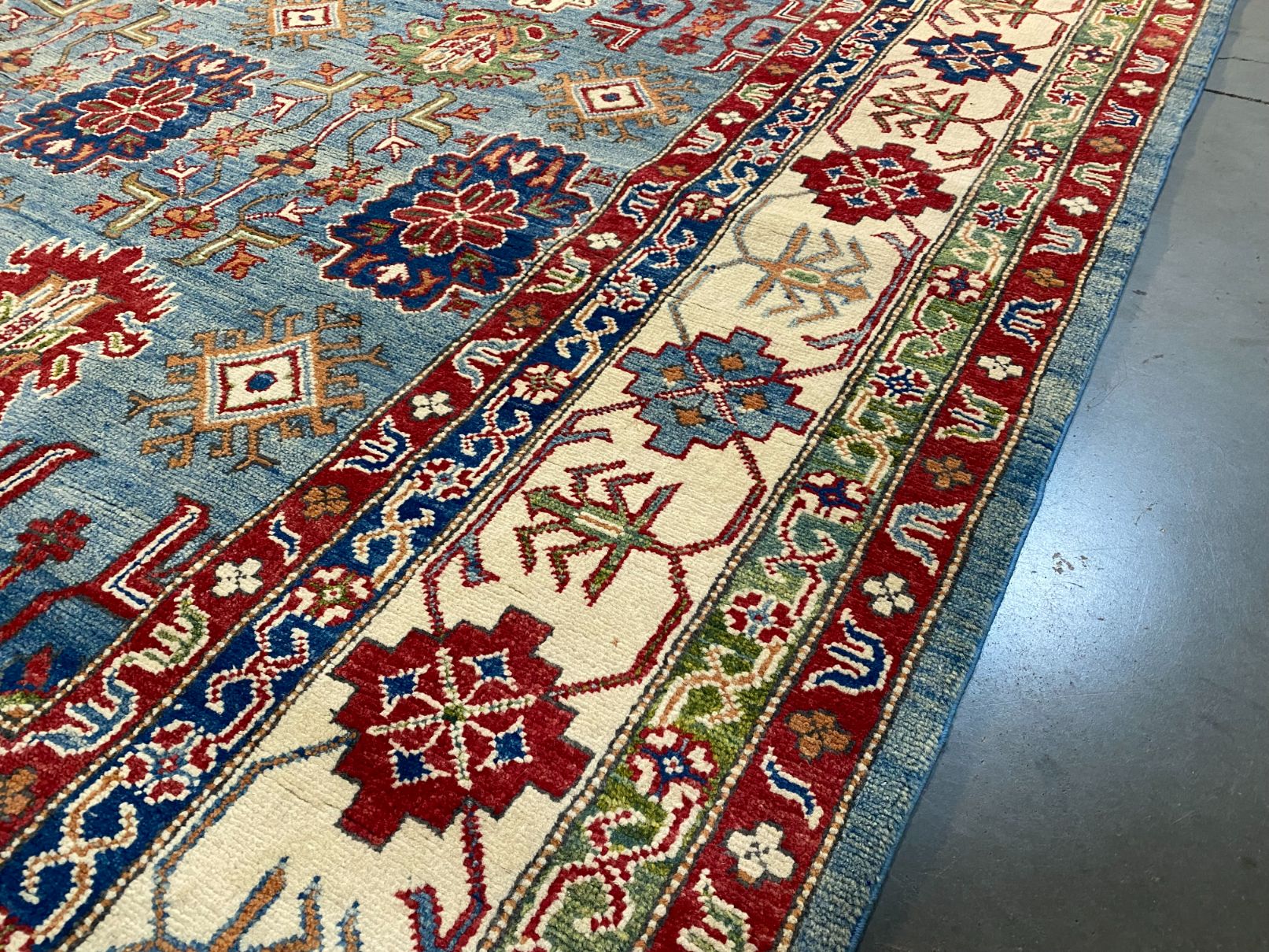 8.4x9.9 Hand Knotted 100% Veggie Dye Natural hand spun wool Pile Geometric pattern super Kazak rug high sheen in decorative blue and multi accent colors Hand Knotted in Pakistan.