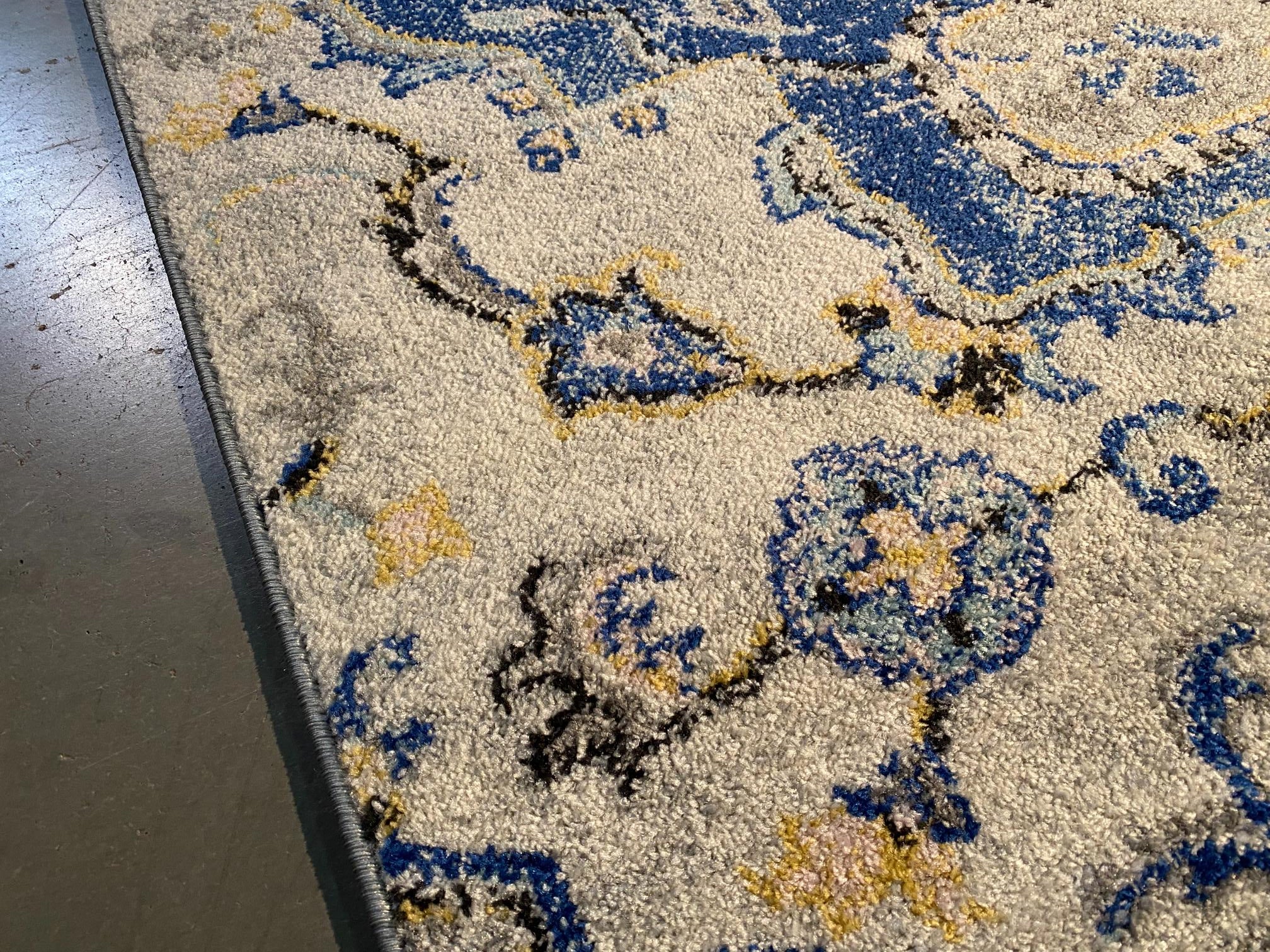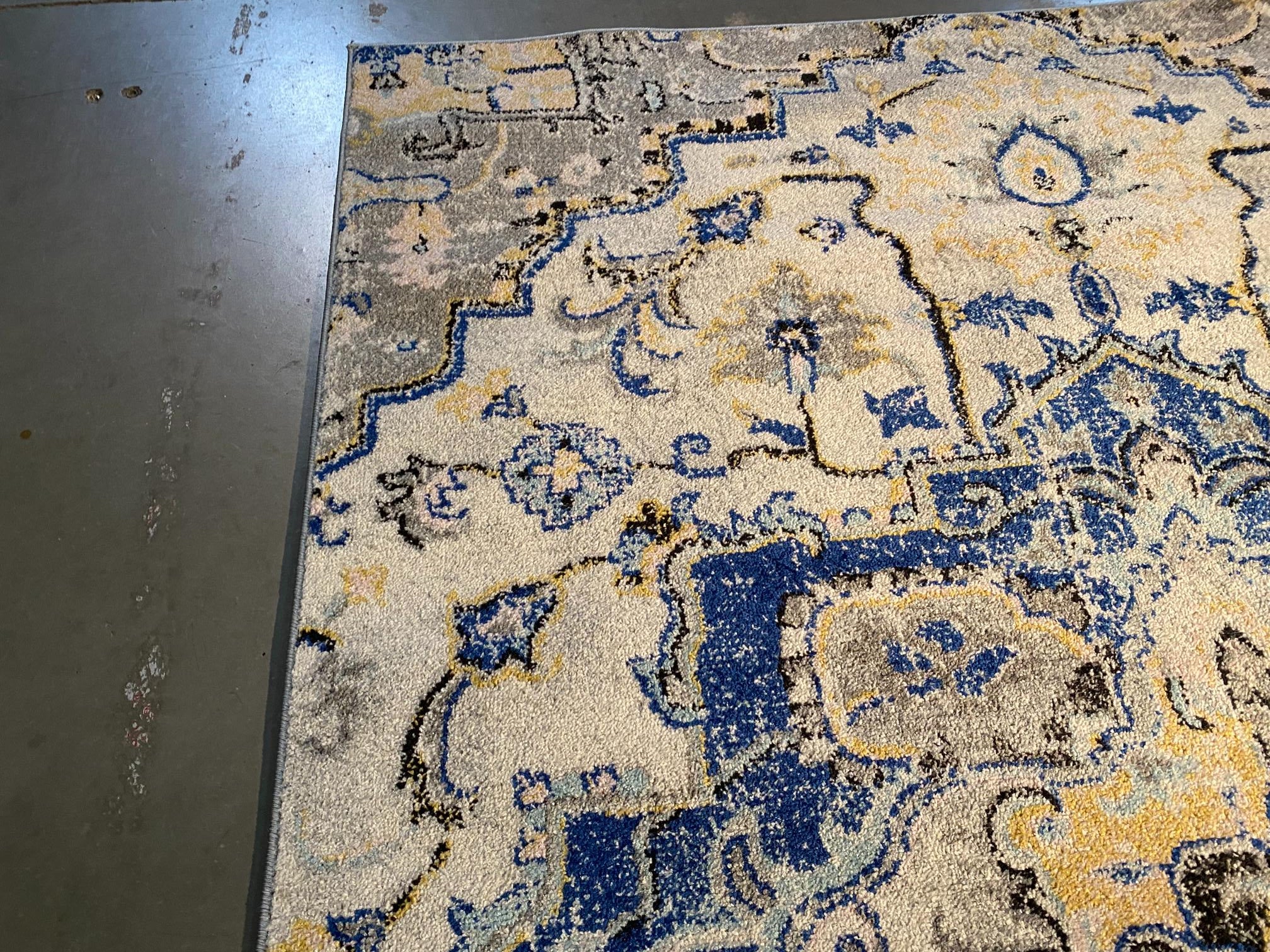 Decorative colorful Classic Medallion design rug , Textured Pile in Ivory, blue and hint of gold yellow and multi accent colors , premium quality. Machine made in Turkey, soft durable and easy care heatset olefin pile, colorfast and stain resistant.