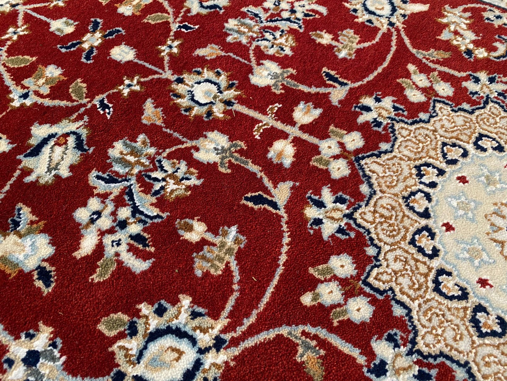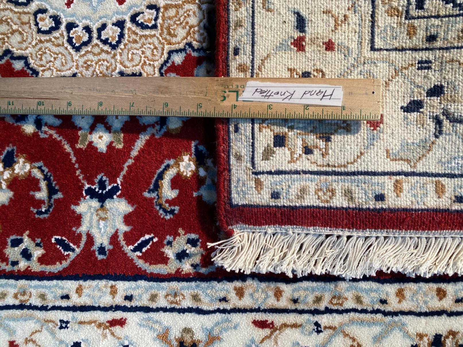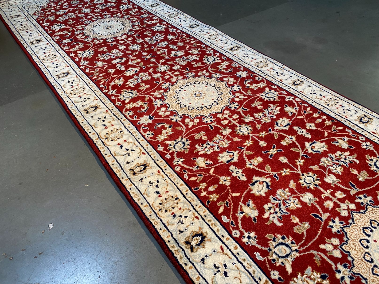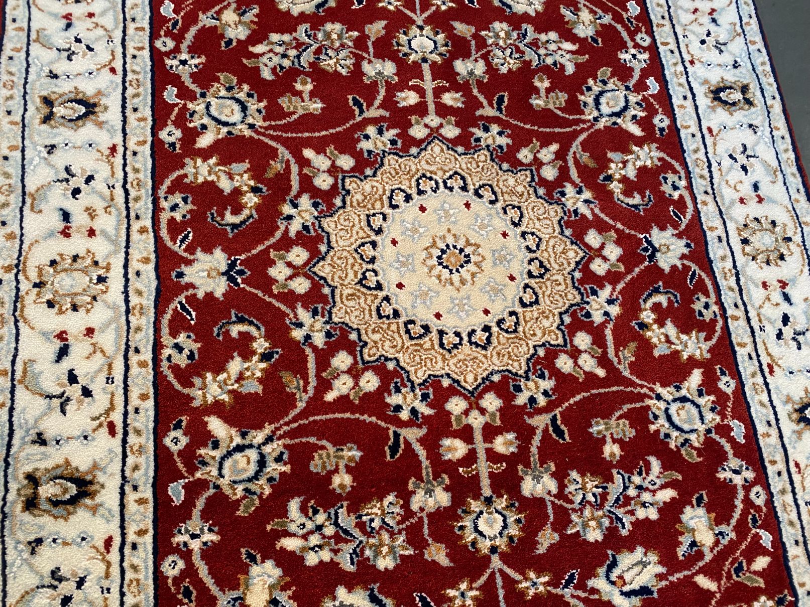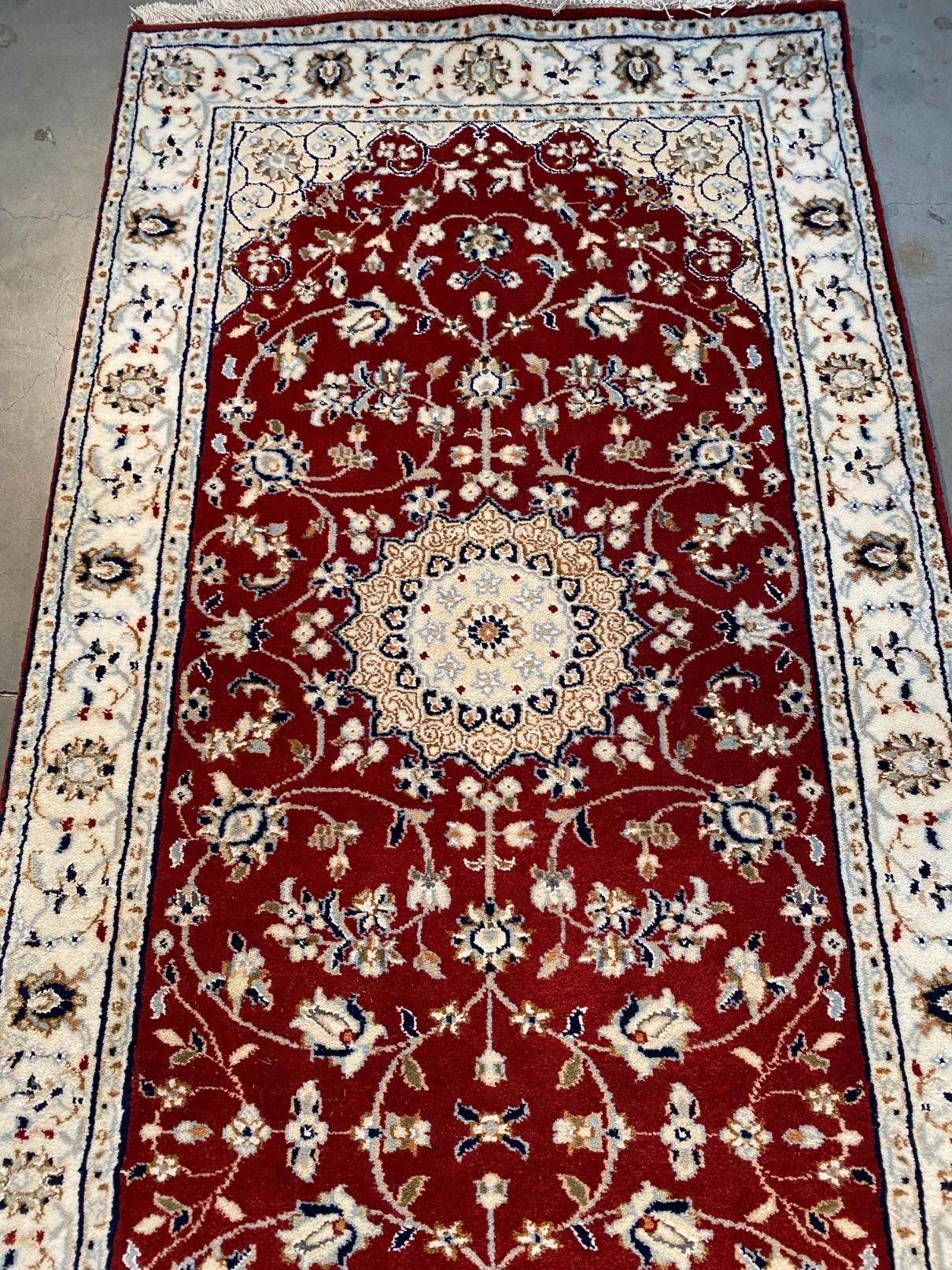 2.8 x10.2 Persian Nain design silk and wool runner, in Red, Ivory and multi accent colors, vege dye natural wool and silk high light pile,cotton foundation,hand knotted in India.