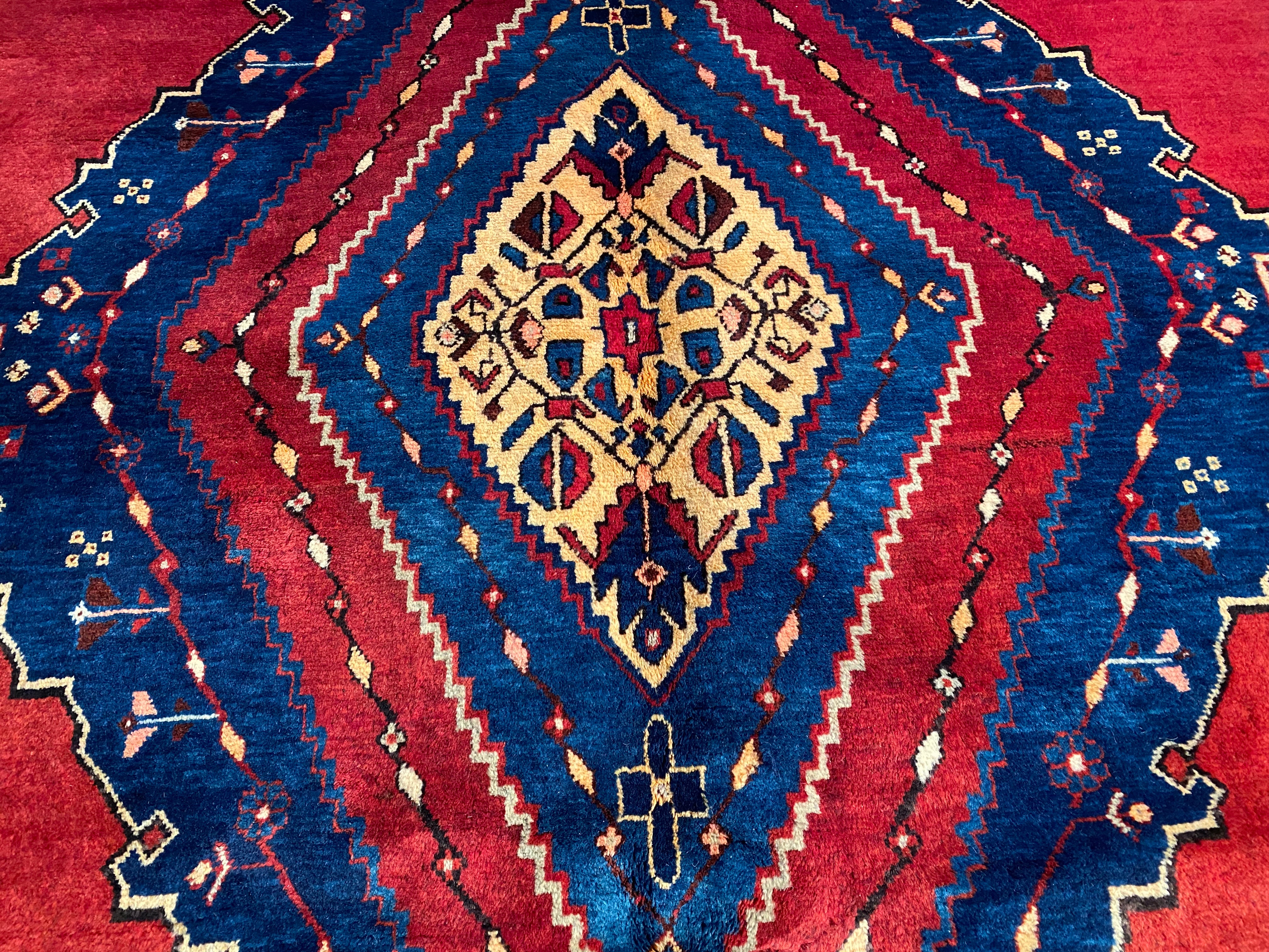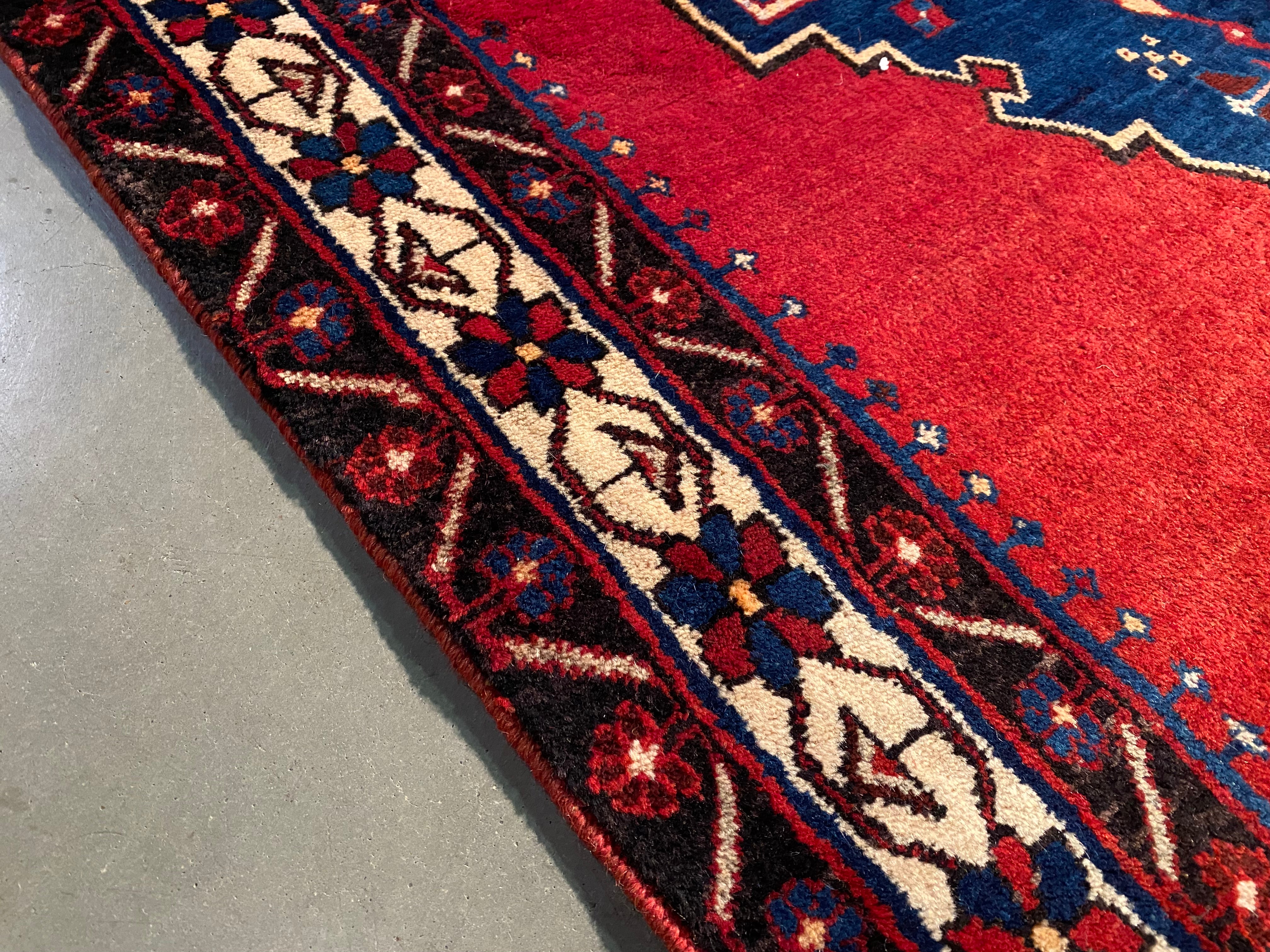 5'.5"X7'.5" Persian Hamedan ,unique in size and design ,in red , royal blue, navy and multi accent colors, Vege dye Hand Knotted in Iran 100% Natural wool pile.