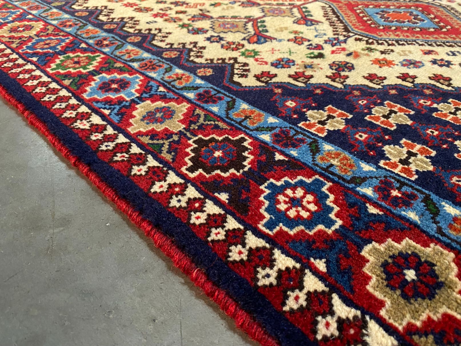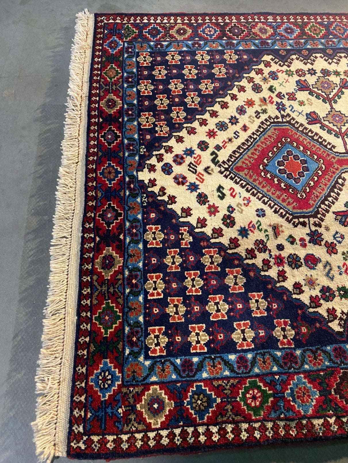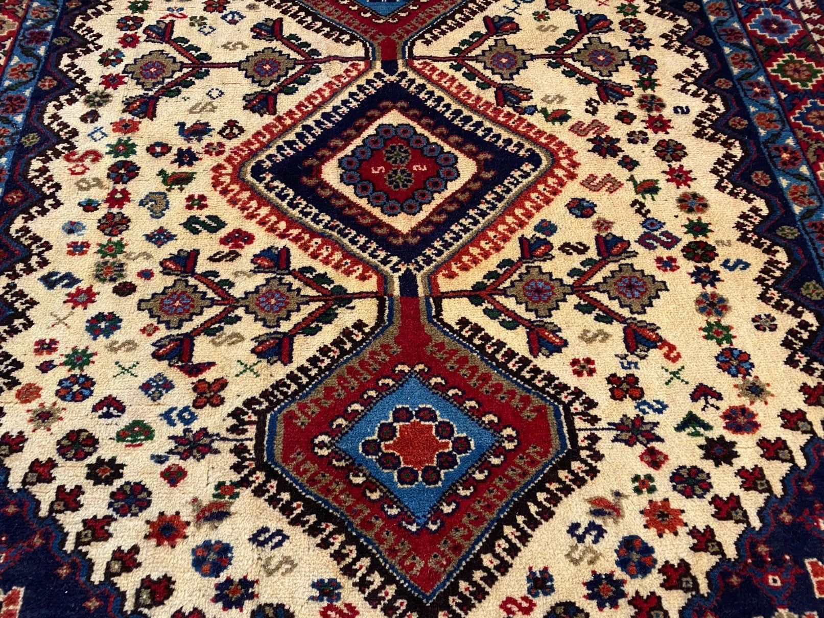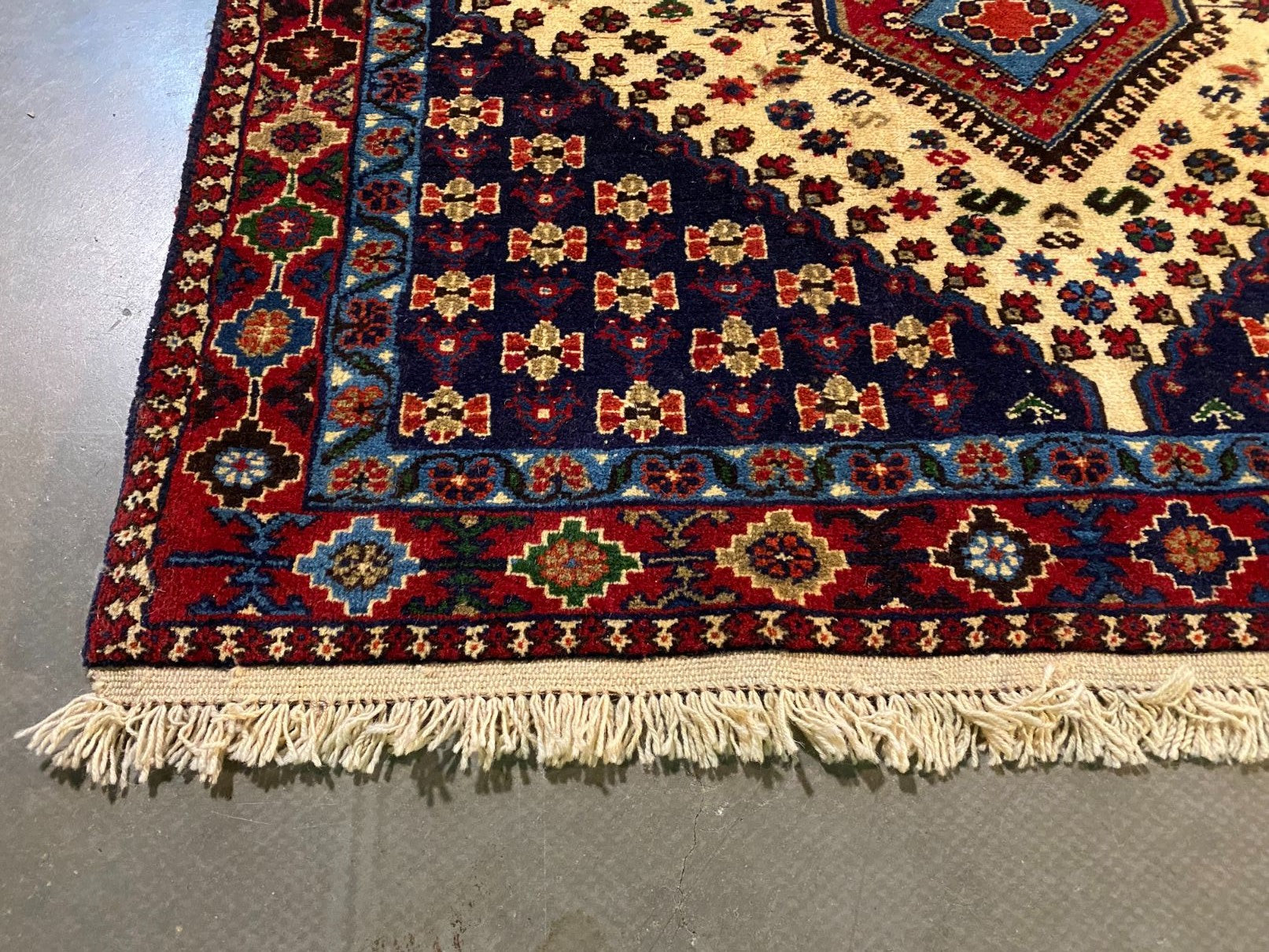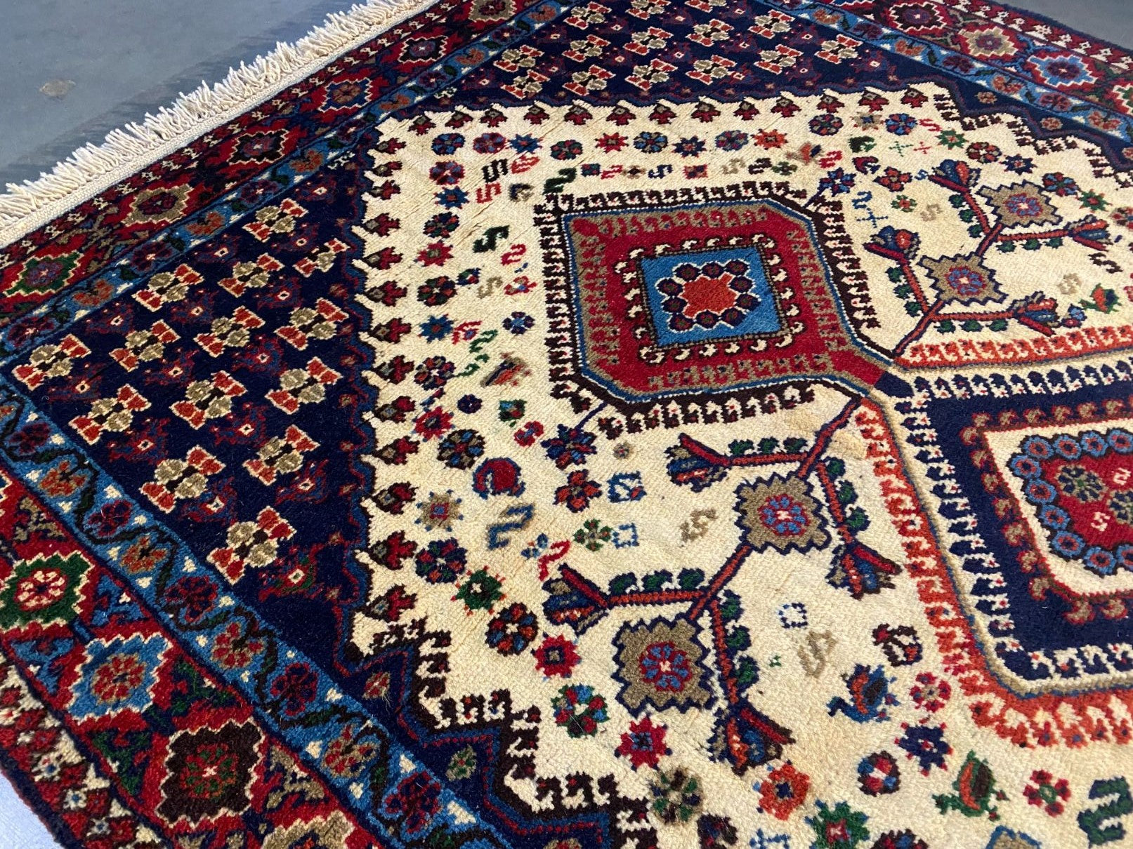 Authentic Fine Persian Yalameh Rug excellent condition 100% Vegge dye Natural wool pile on Wool foundation Ivory , red, navy blue colors Hand Knotted in Iran 3'.8" X5'.1".