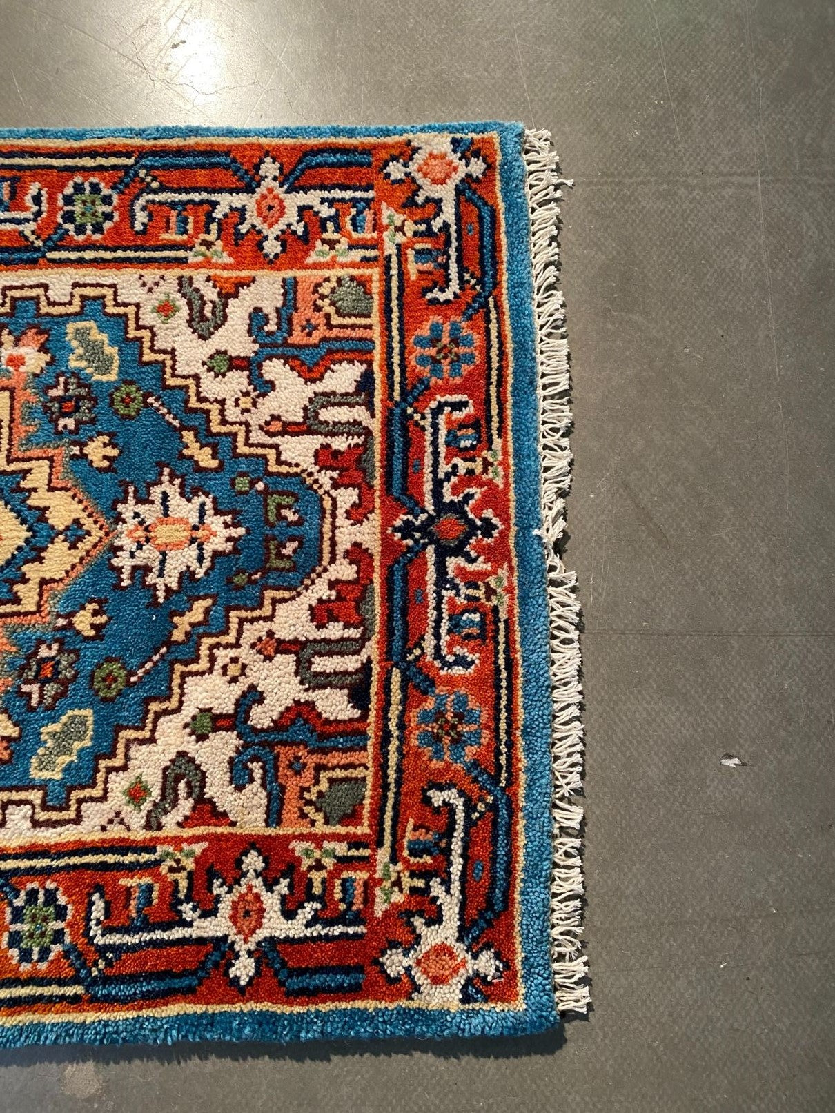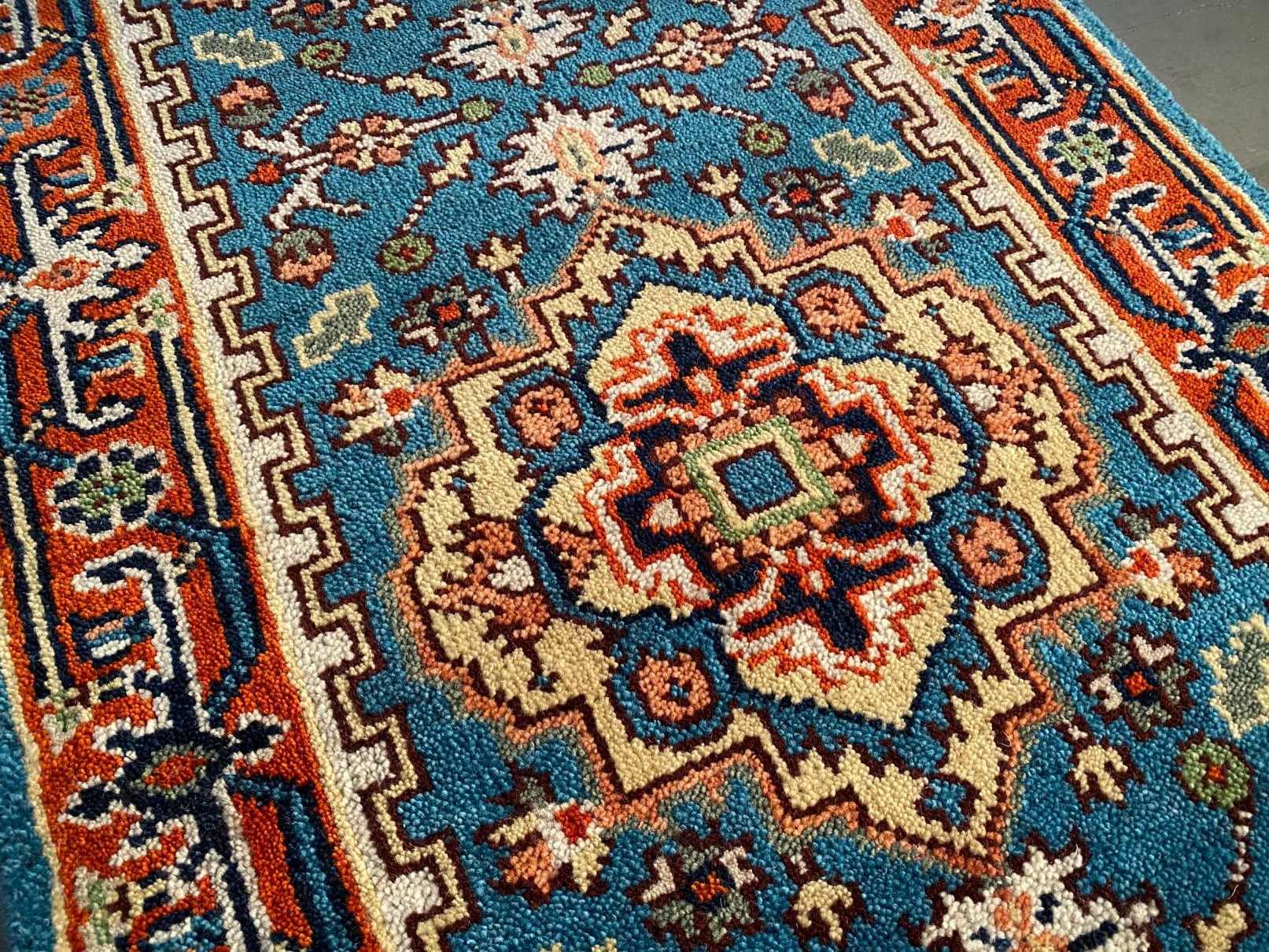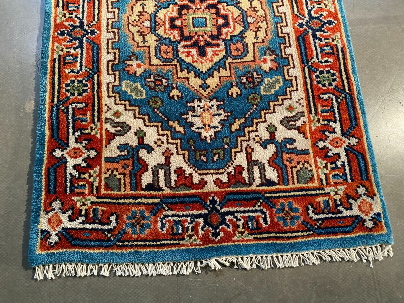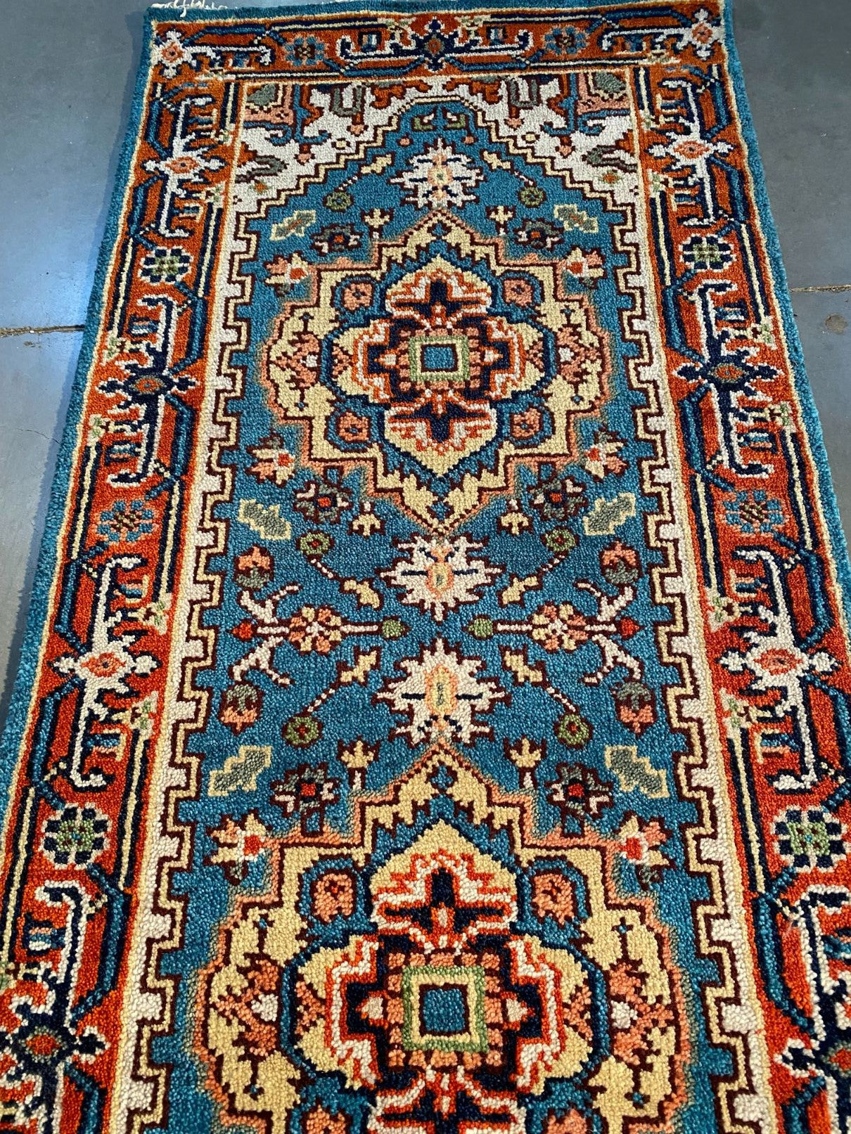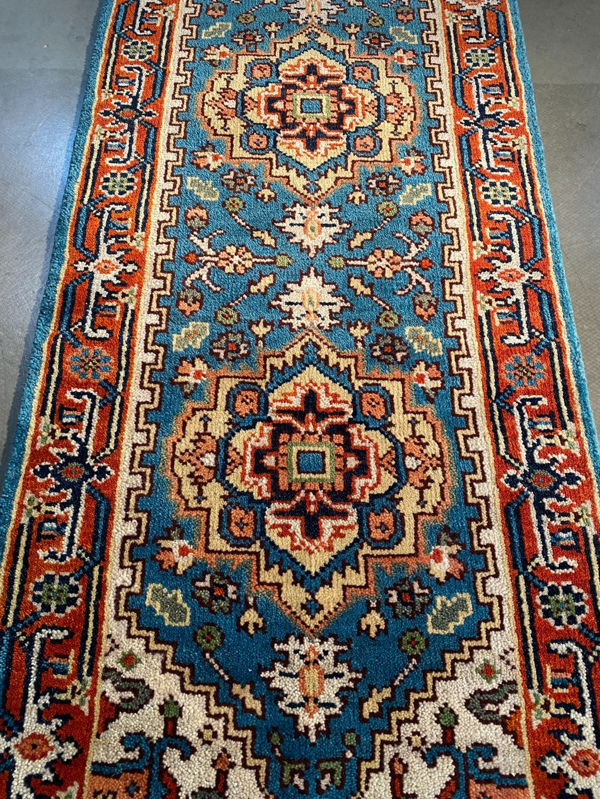 2'.6"x8' Traditional-medallion Serapi design runner made of 100% natural wool and veggie dye pile, heavy and dense Blue, Ivory, rust and multi other colors hand-knotted in India.