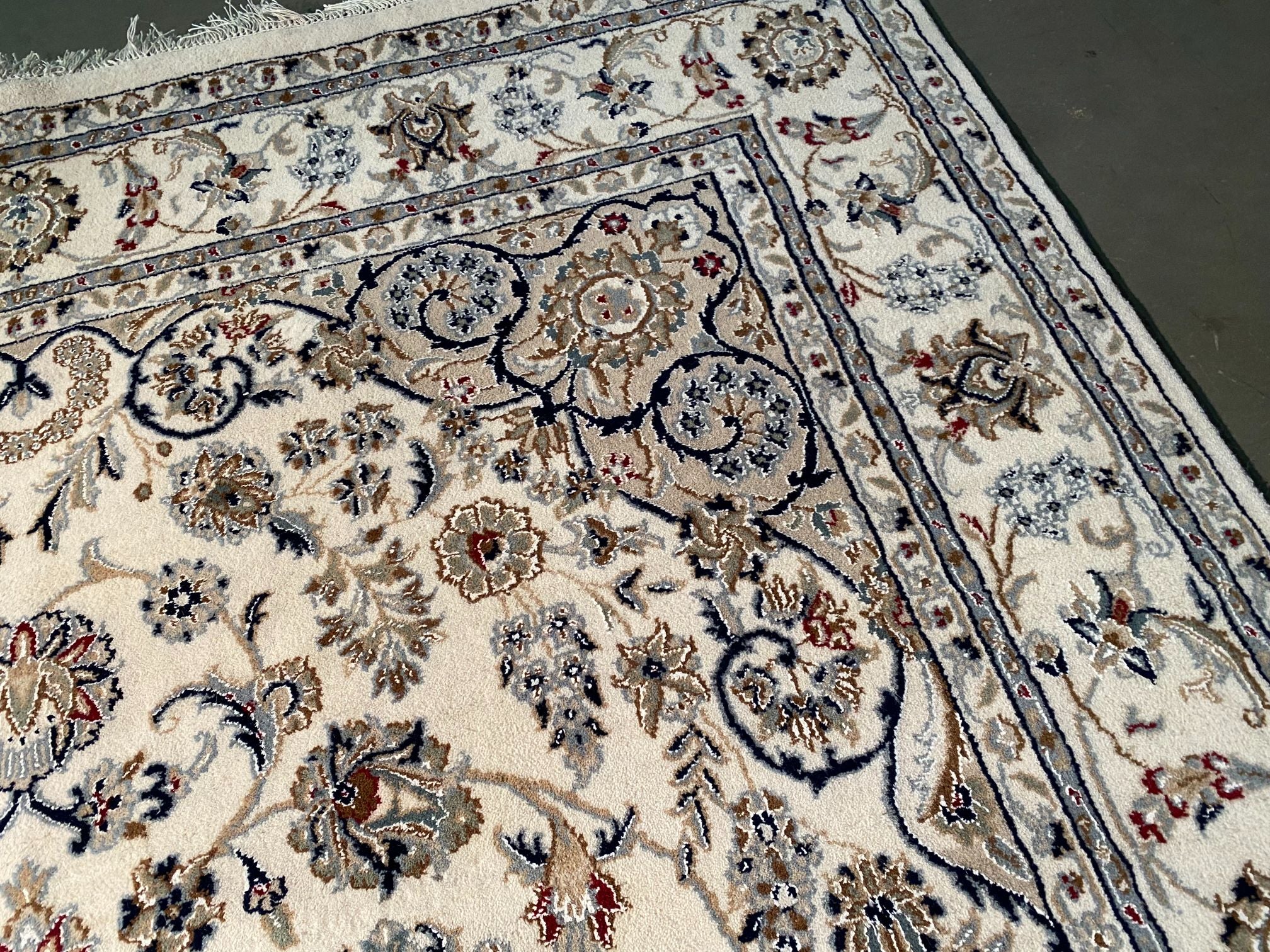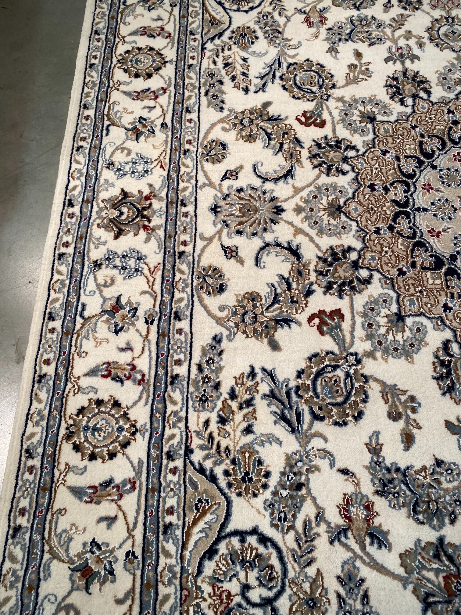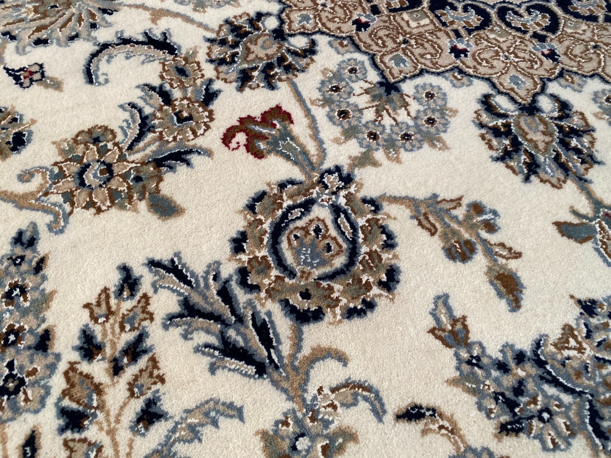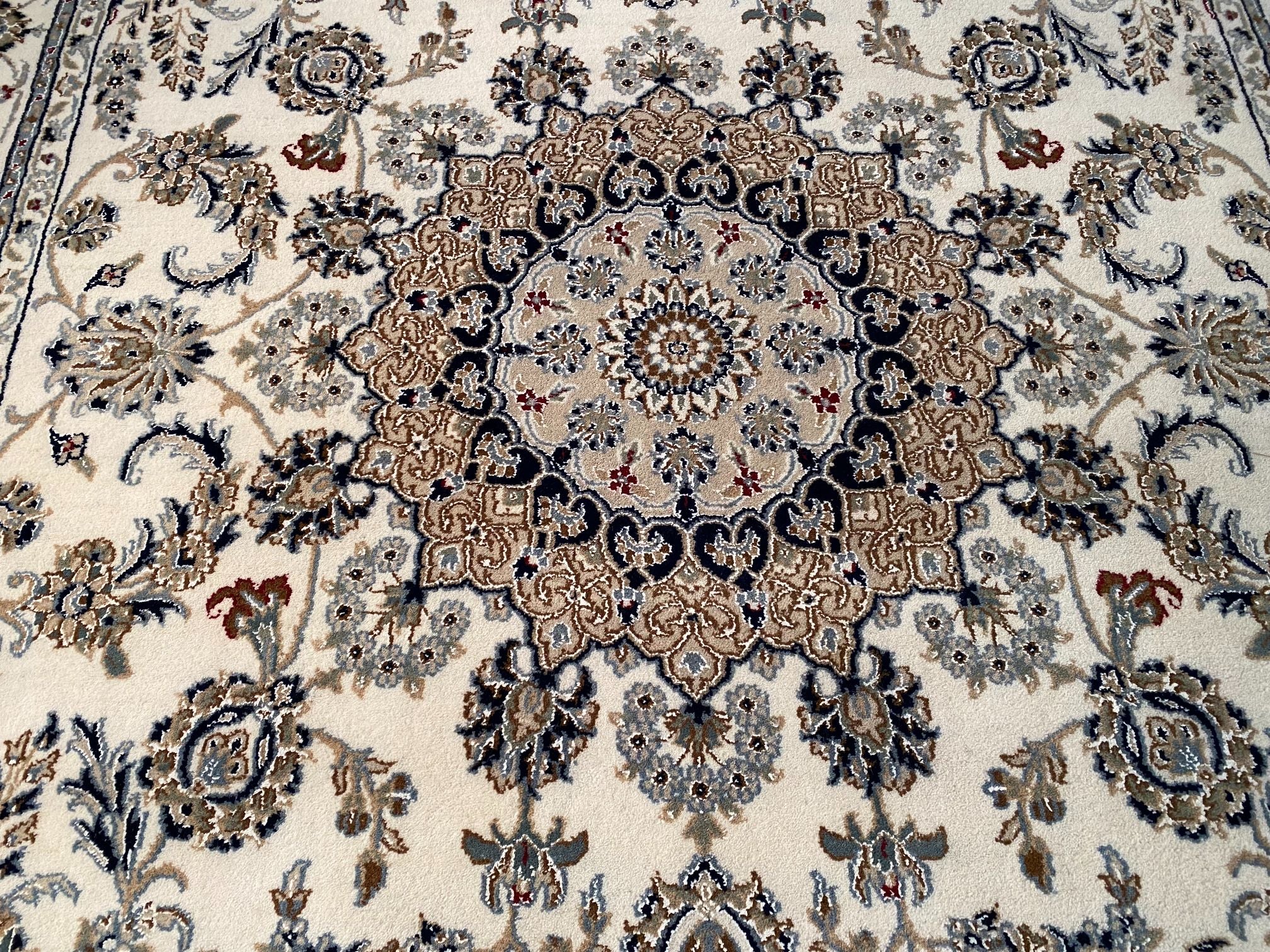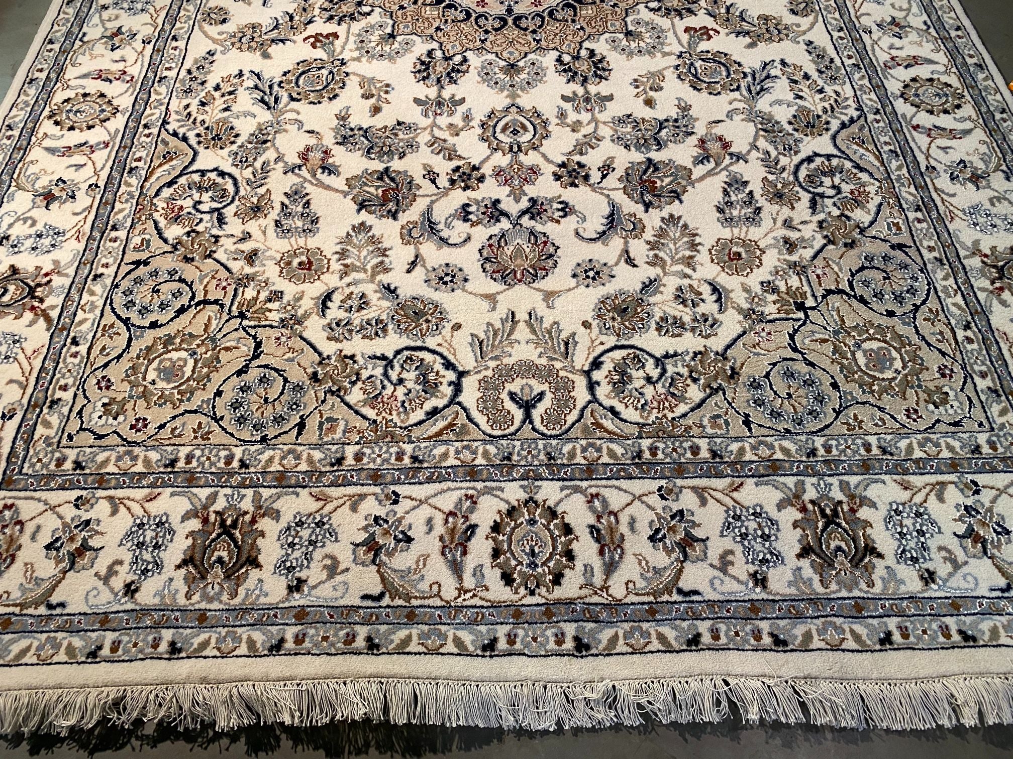 5.8x9.1 Persian Kashan design silk and wool rug , in Ivory, shades of light and dark blue and multi other accent colors, vege dye natural wool and silk high lighted pile,cotton foundation,hand knotted in India.