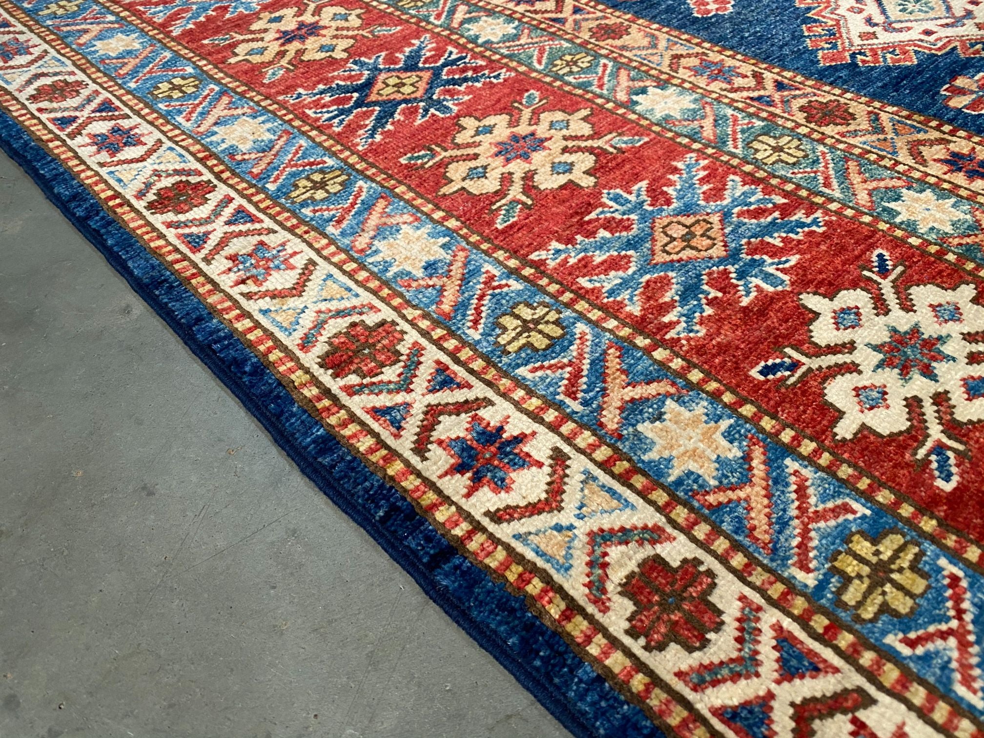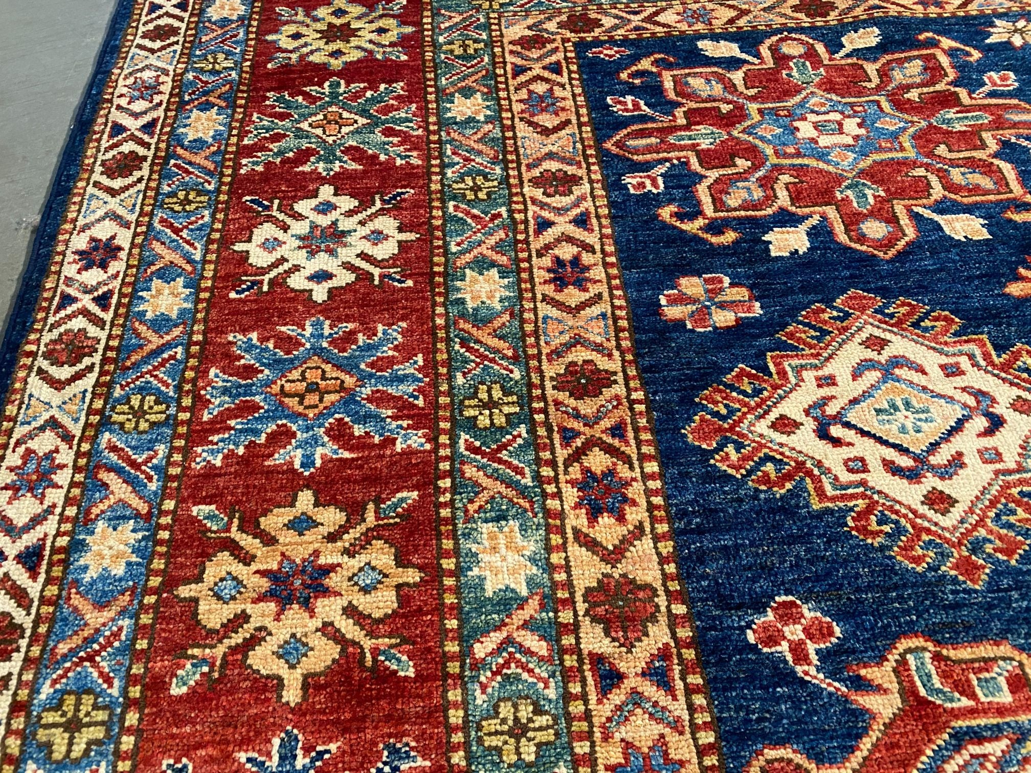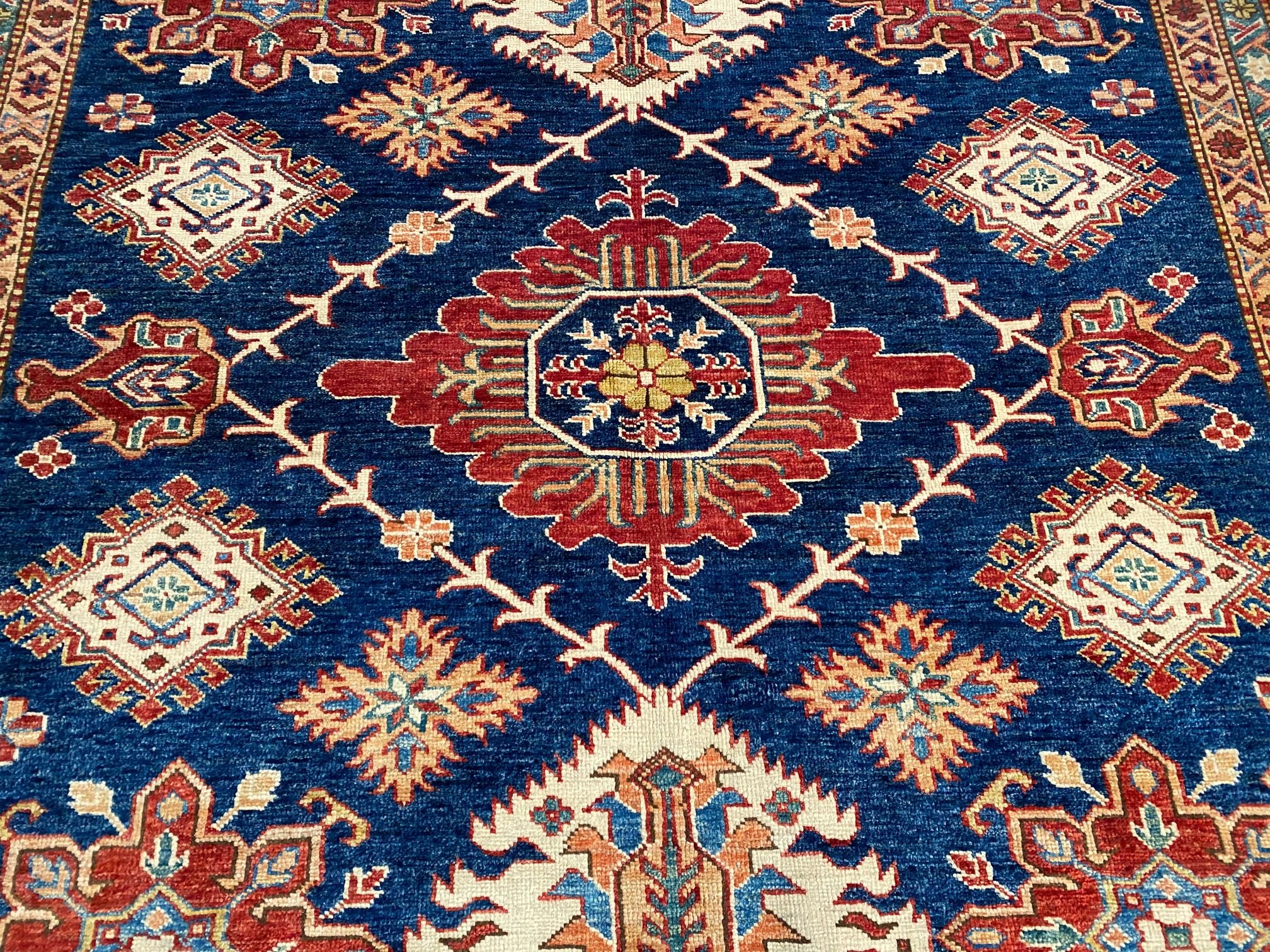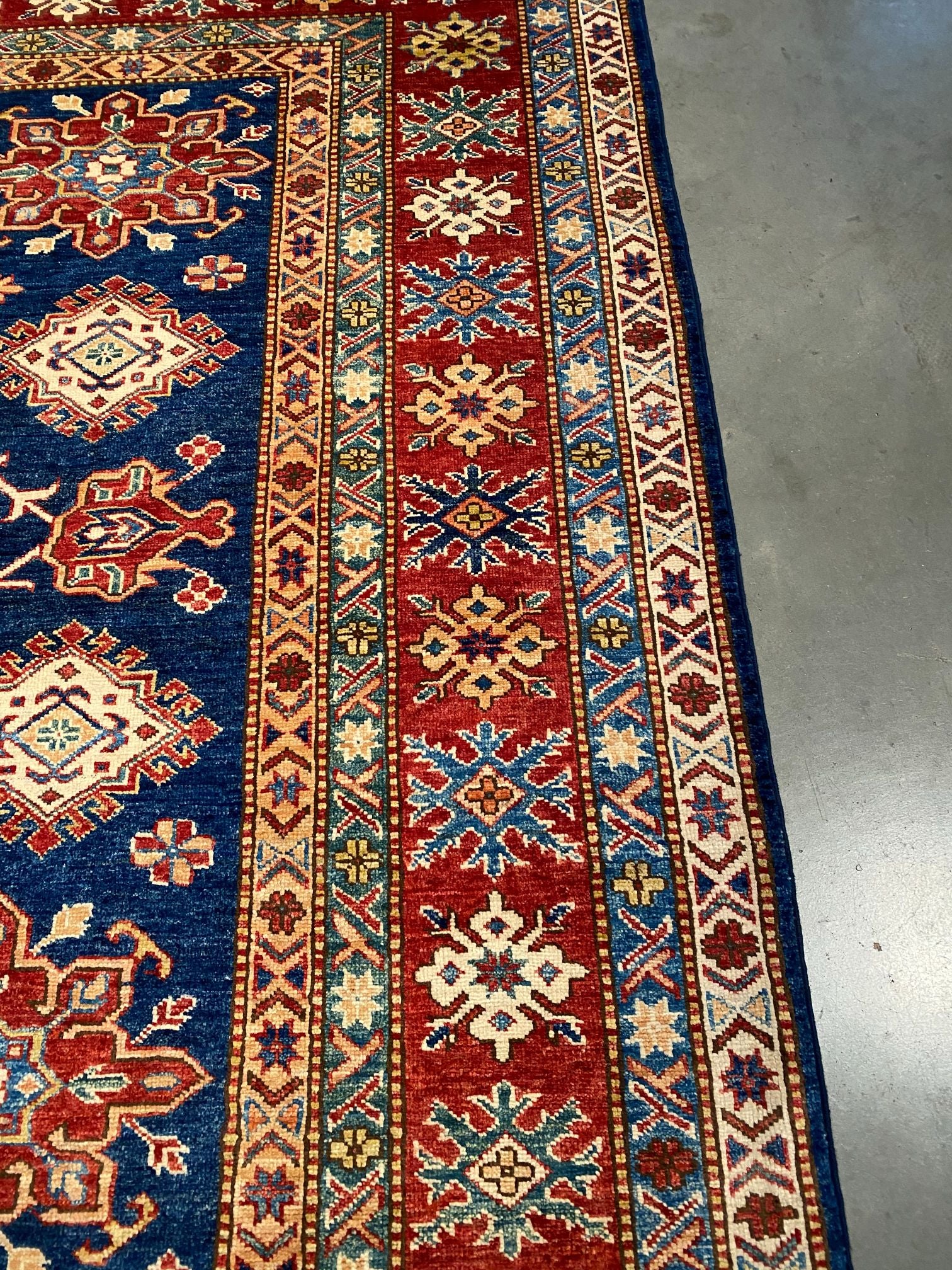 6'.7"X6'.5" Super Kazak square rug, hand spun and hand knotted rug in Pakistan 100% natural wool with sheen pile, in vivid Navy Blue , Red , Ivory and multi accent colors.