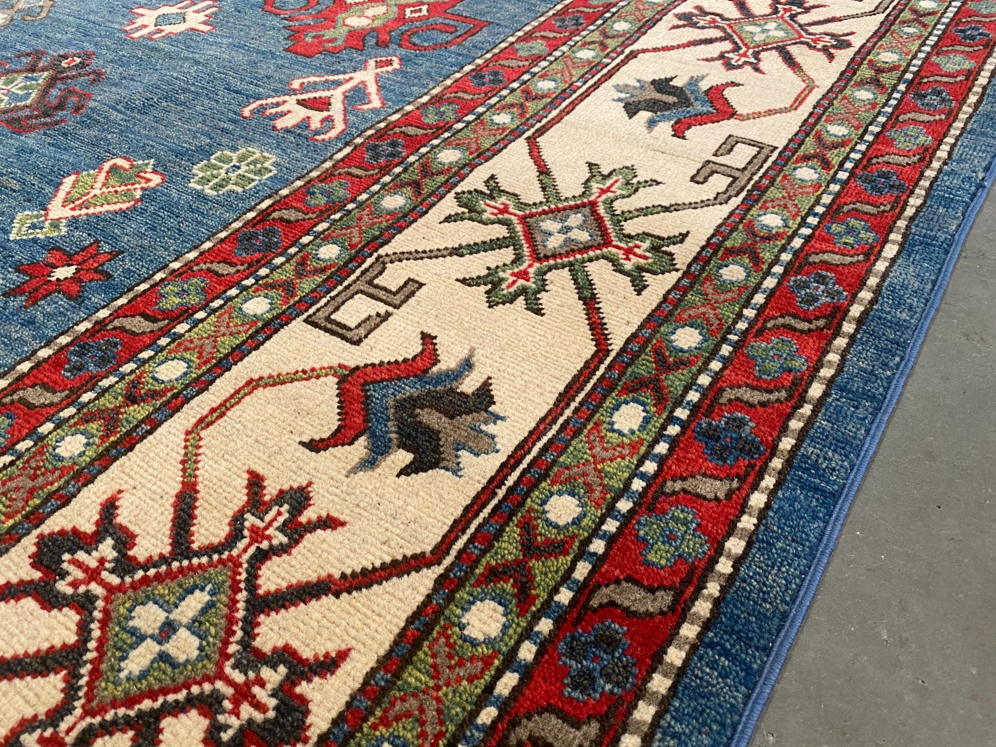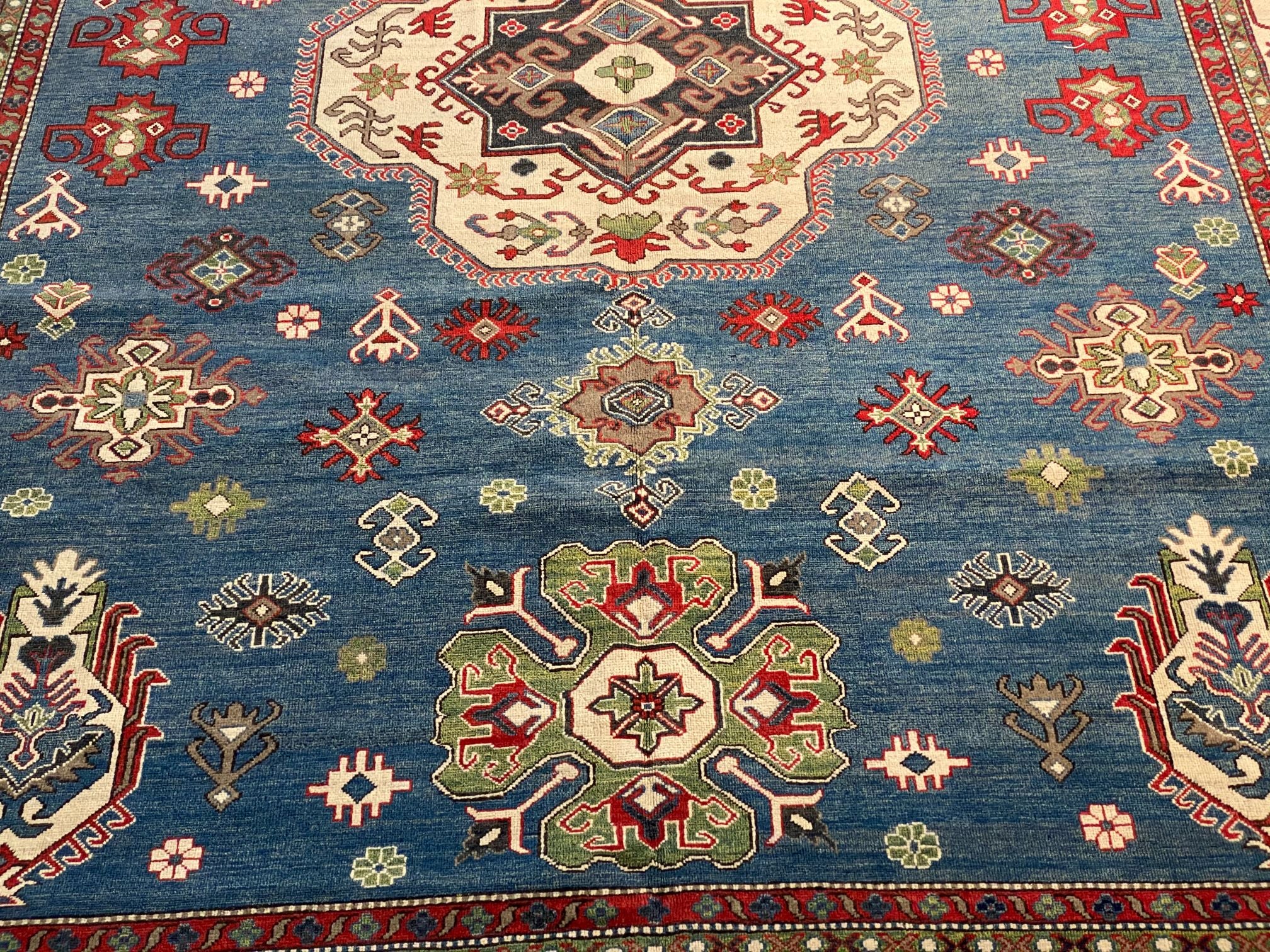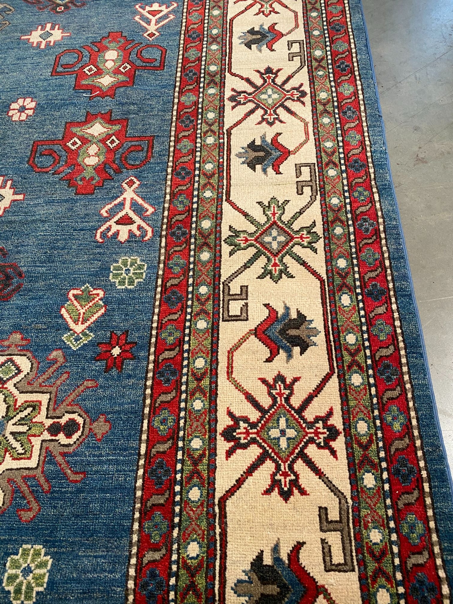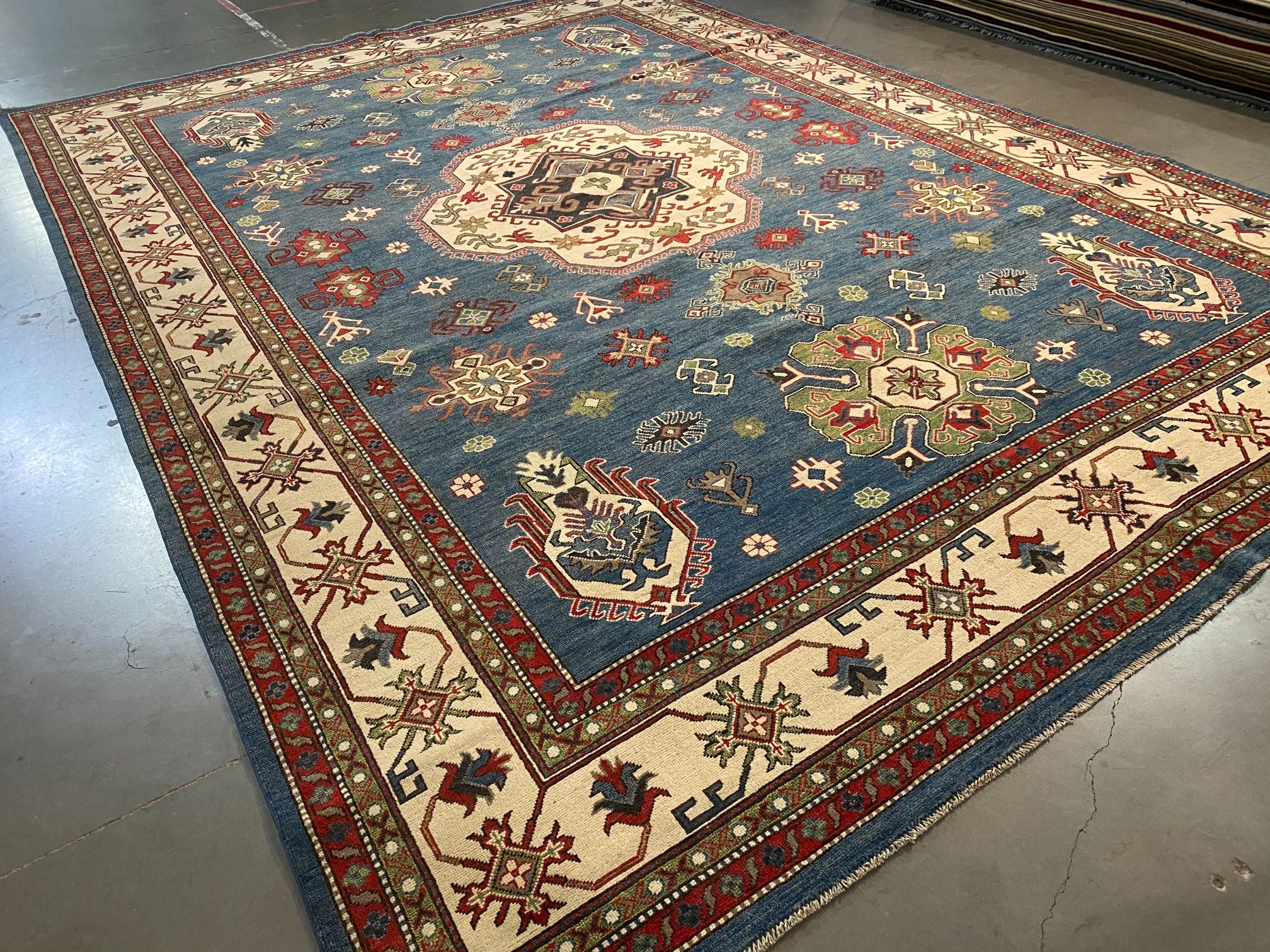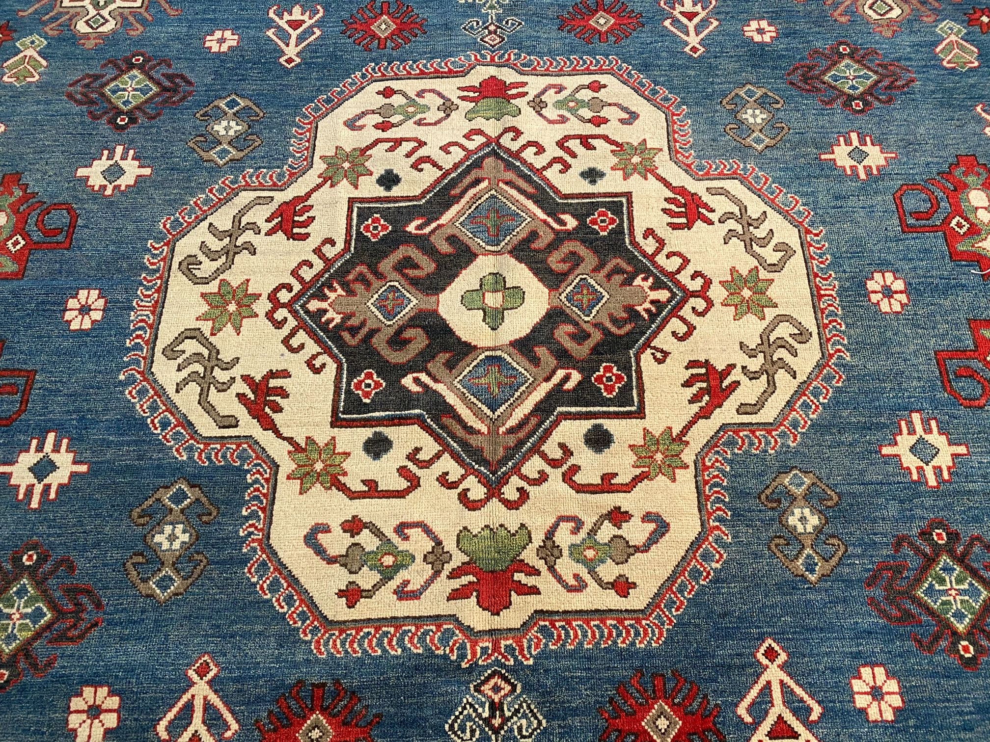 10x13.9 Hand Knotted 100% Veggie Dye Natural hand spun wool Pile. Super Kazak rug high sheen in decorative Royal Blue, ivory and multi accent colors Hand Knotted in Pakistan.