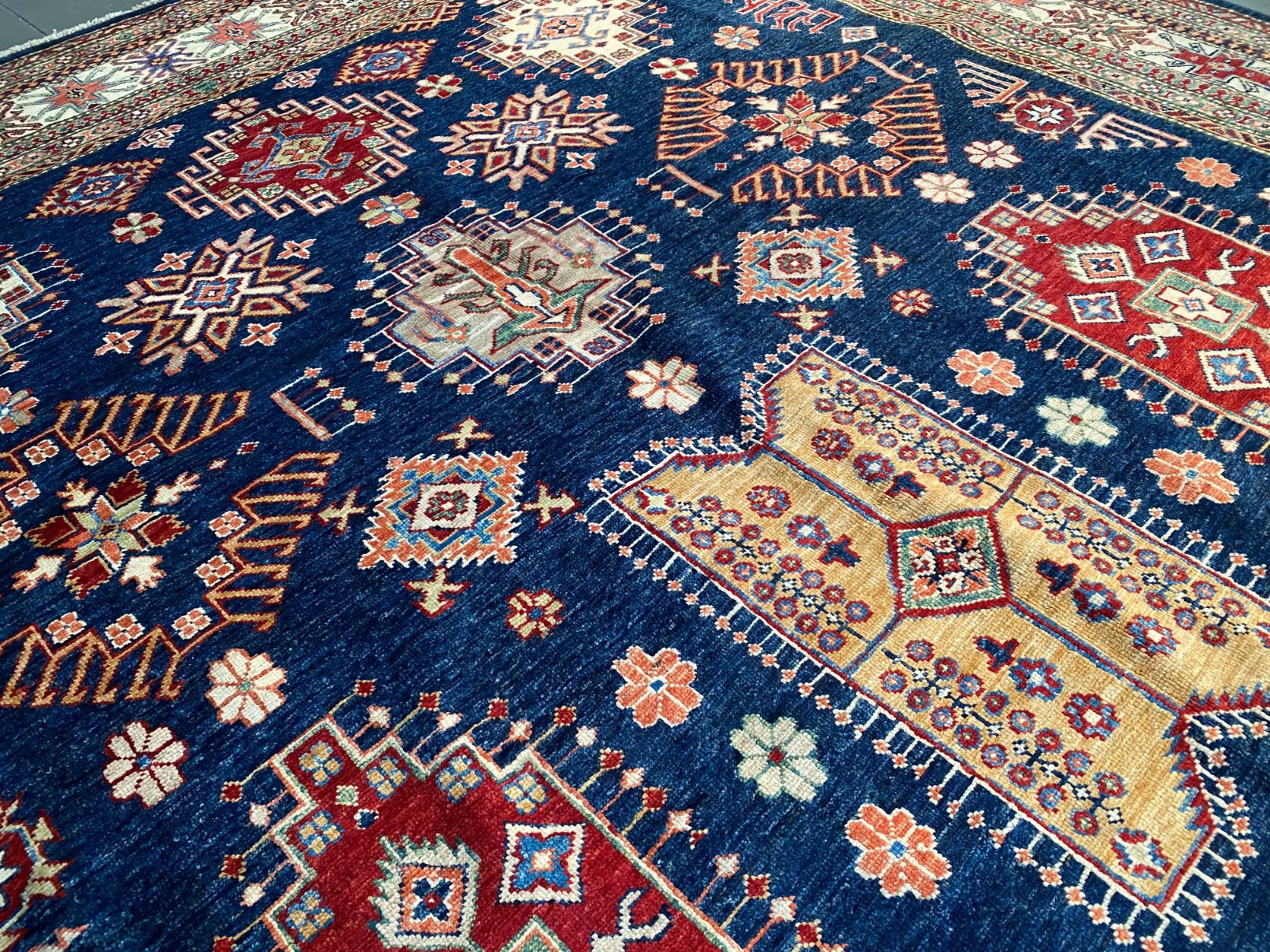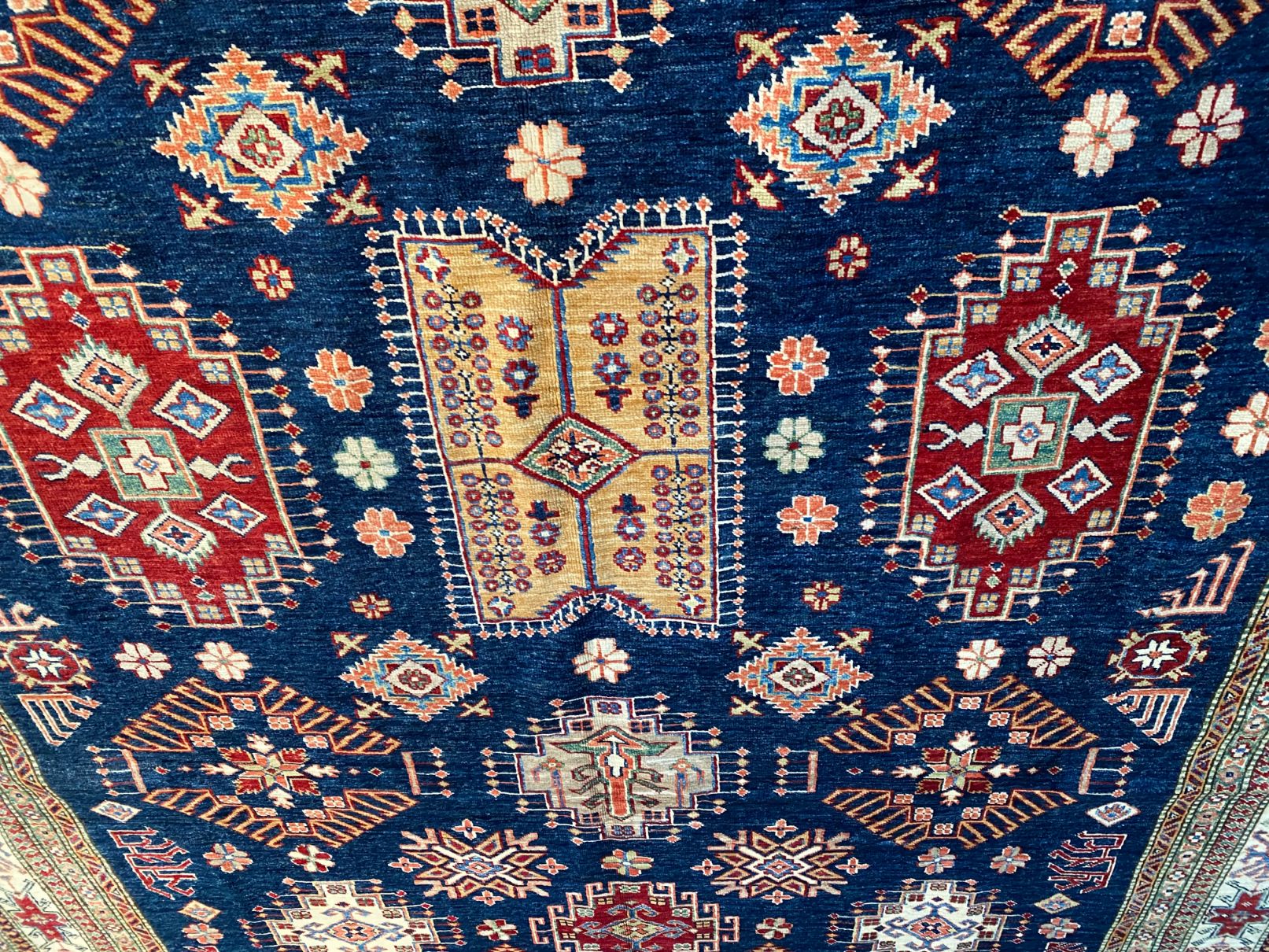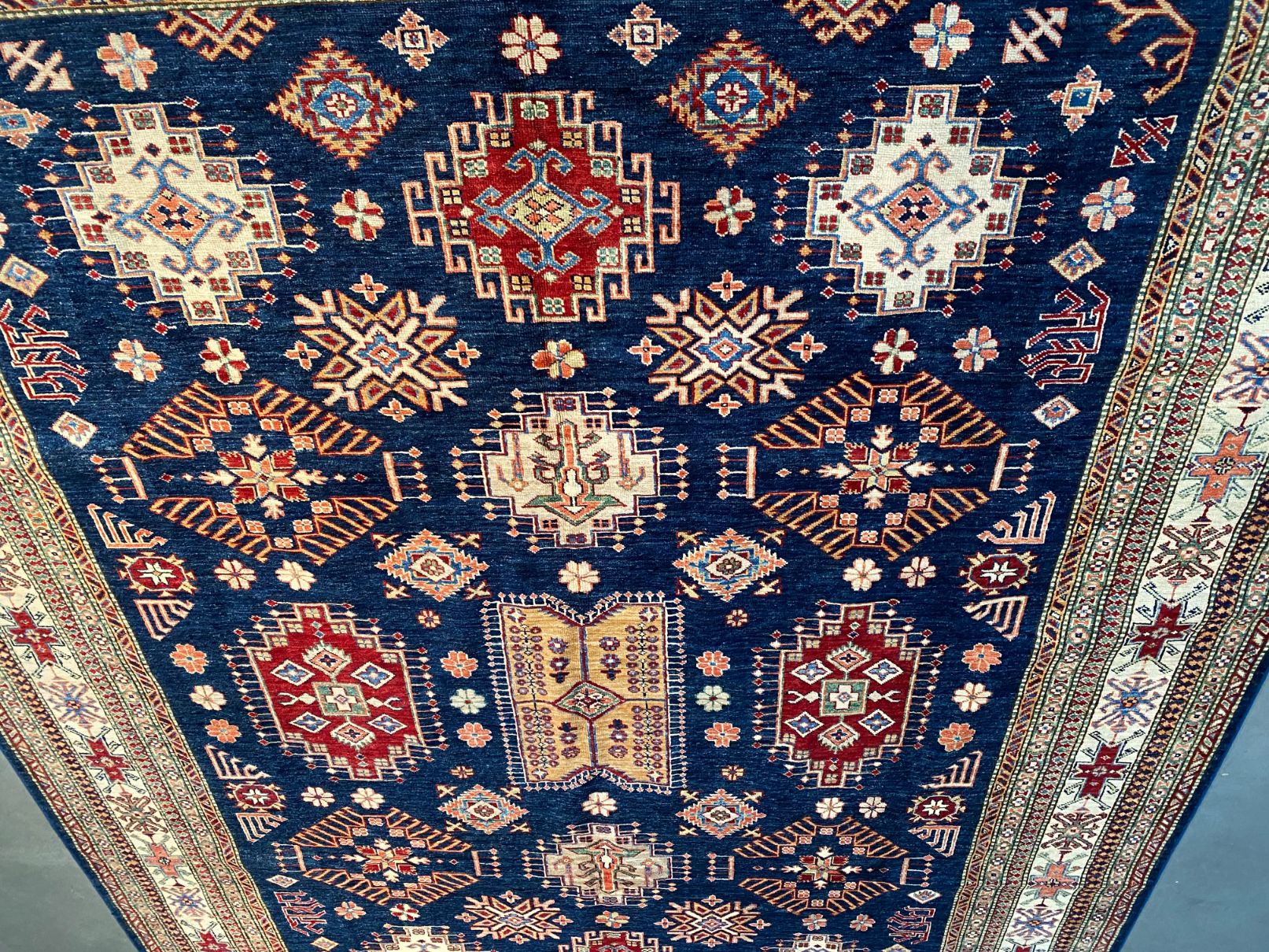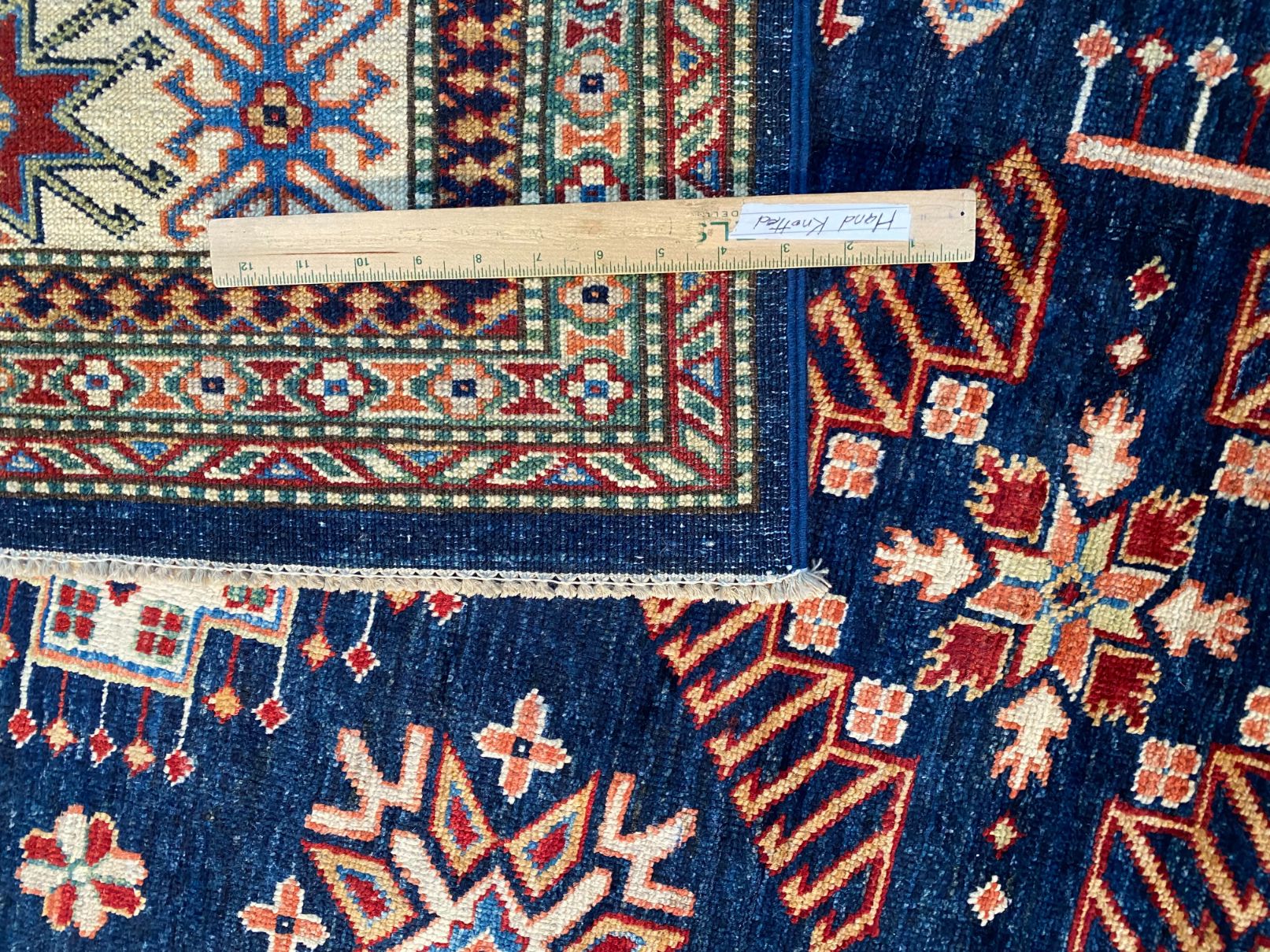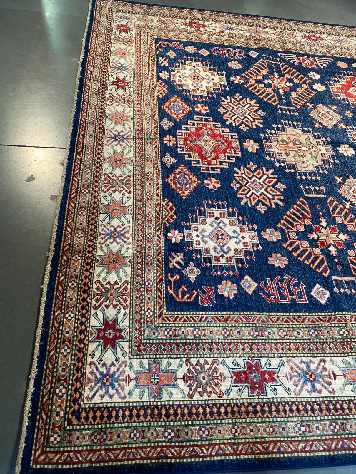 8x10.1 Hand Knotted 100% Veggie Dye Natural hand spun wool Pile Geometric pattern super quality Kazak rug high sheen in Navy blue and multi accent colors Hand Knotted in Pakistan.