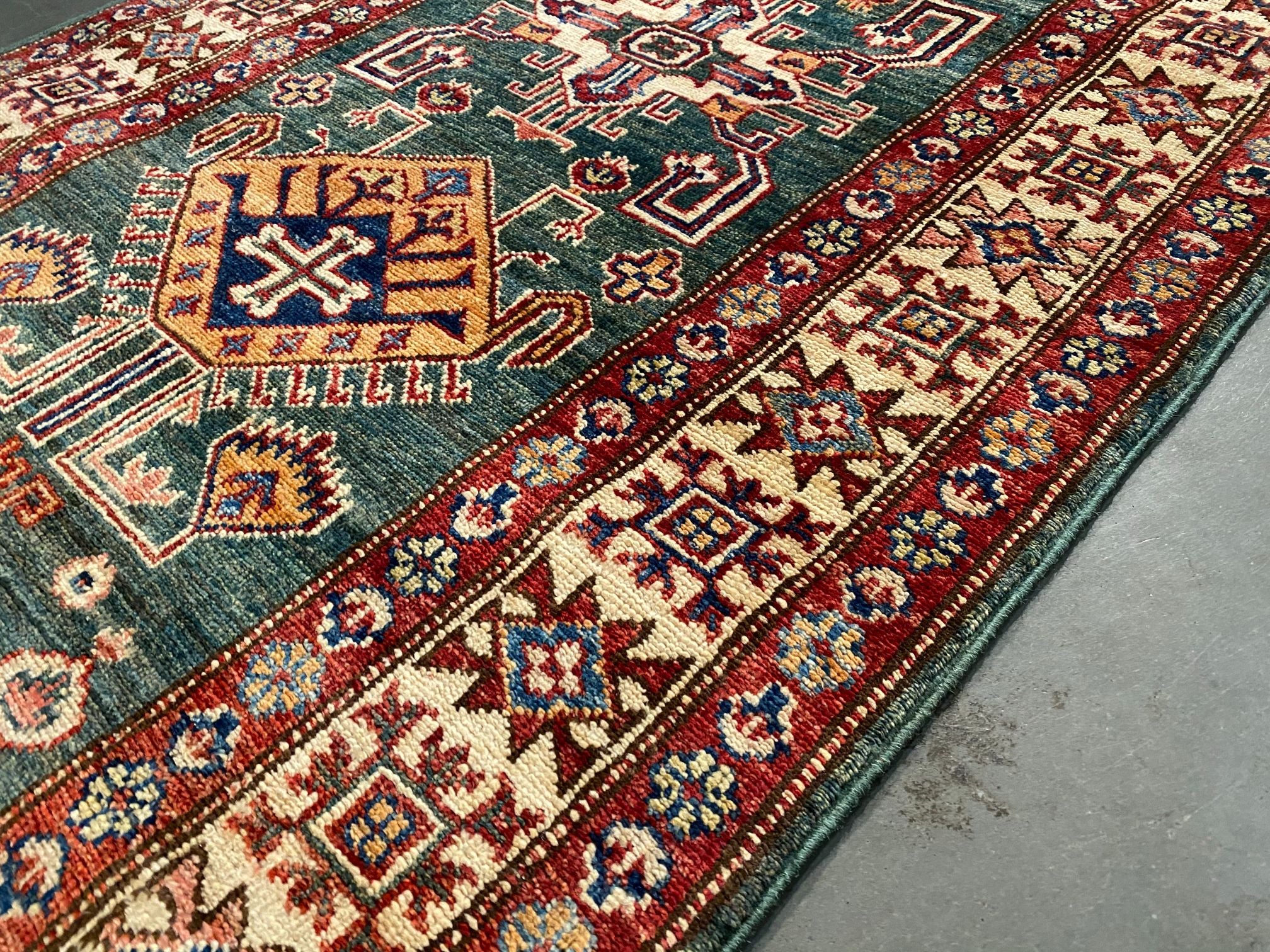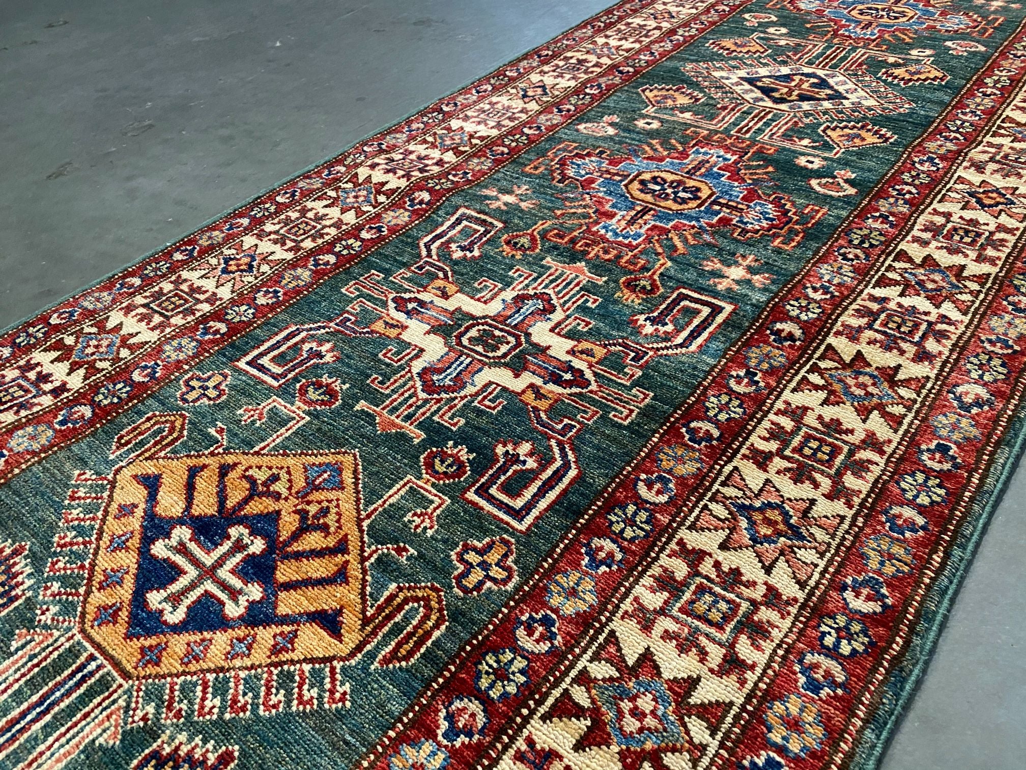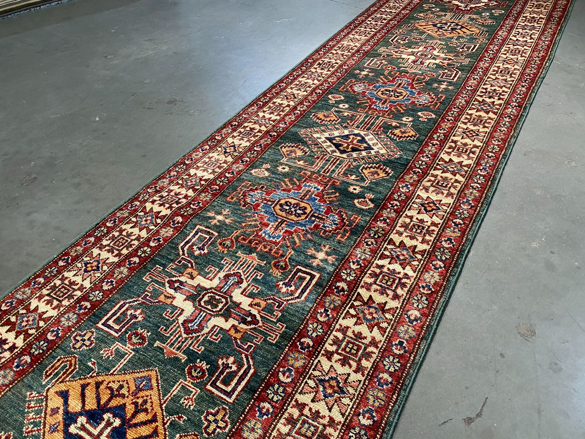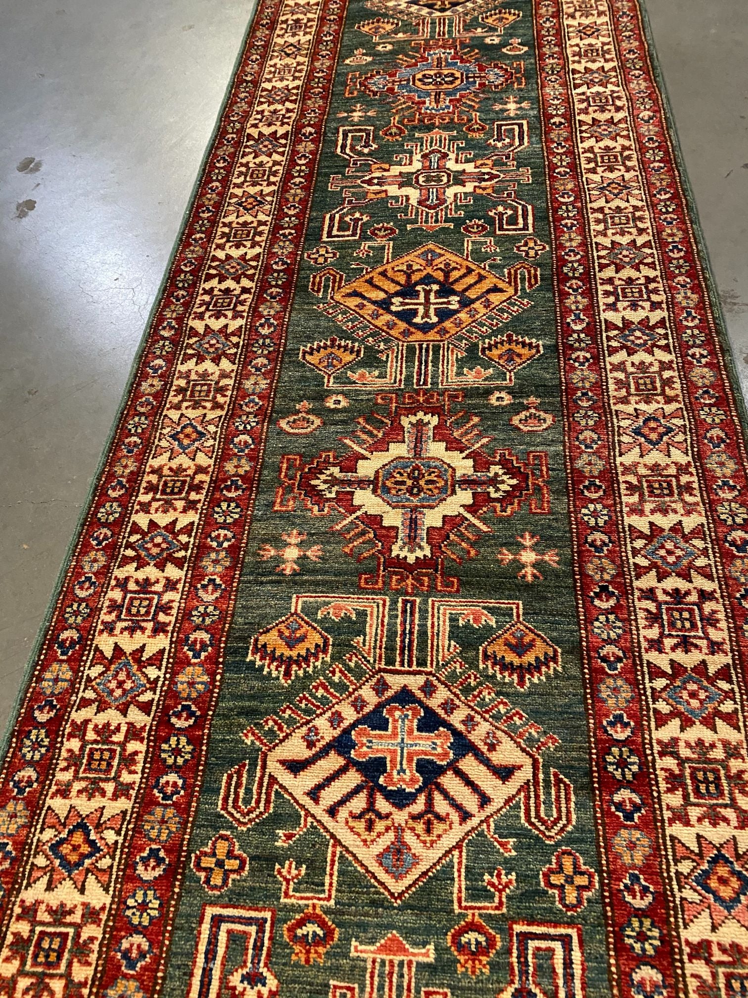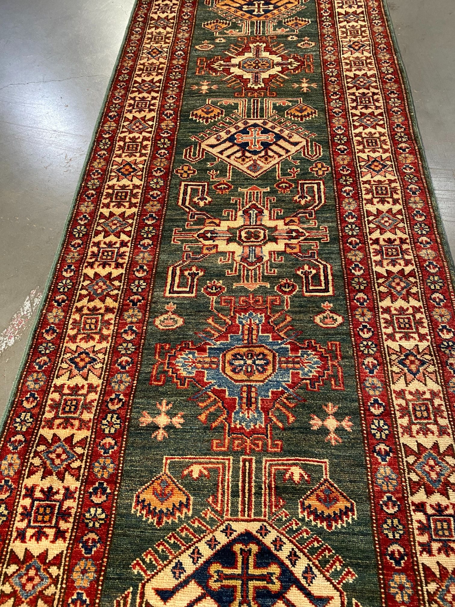 2'.8"x 20'.0" Super Kazak long runner, hand spun and hand knotted rug in Pakistan 100% natural wool with beautiful sheen pile, in rare Green and multi other accent colors.
