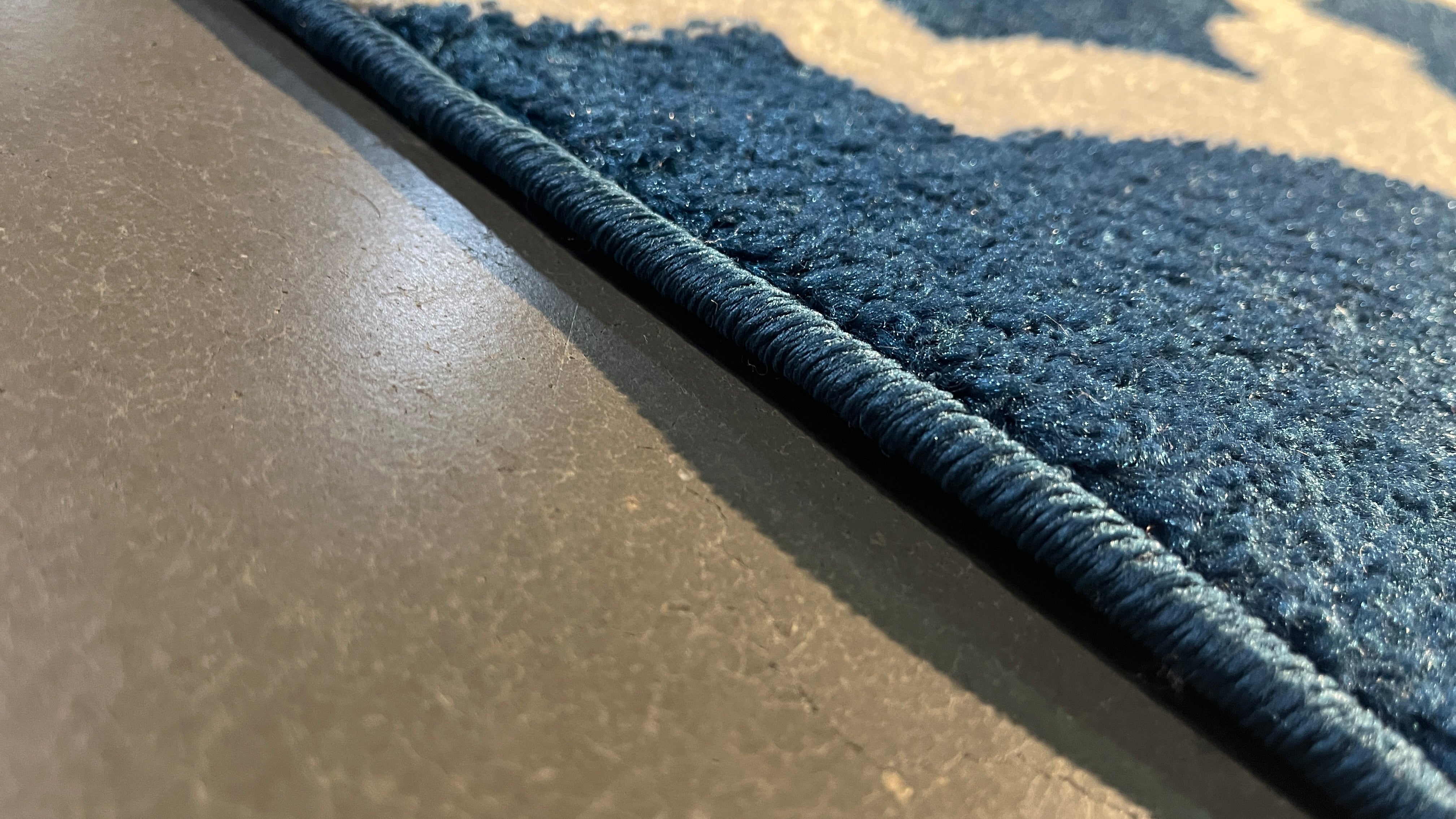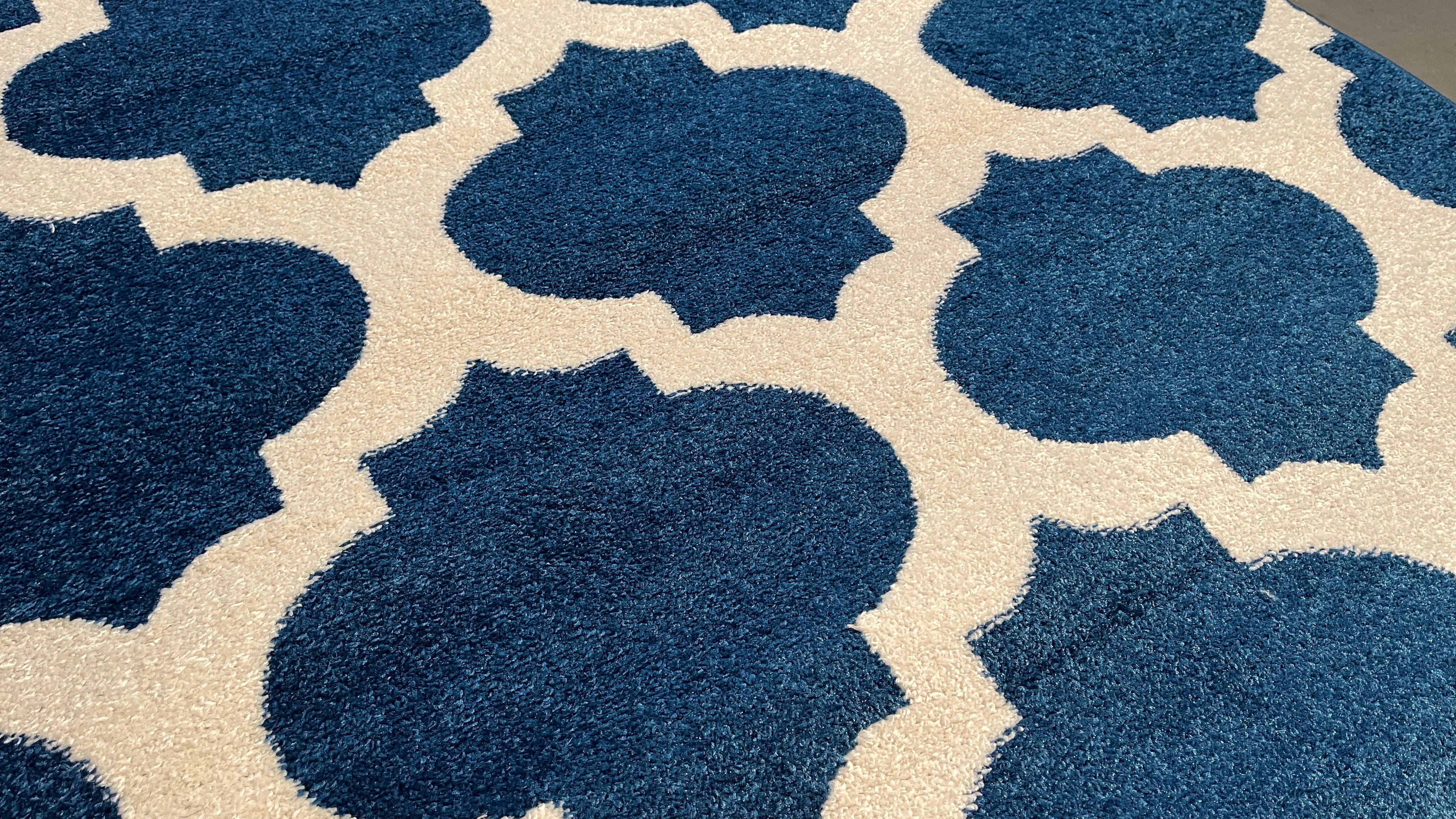 Decorative trendy style area rug in contemporary lattice moroccan design Navy Blue and Ivory colors, premium quality twisted ,textured machine made in turkey, made of durable and easy care wool like twisted yarn polypropylene pile, colorfast and stain resistant .