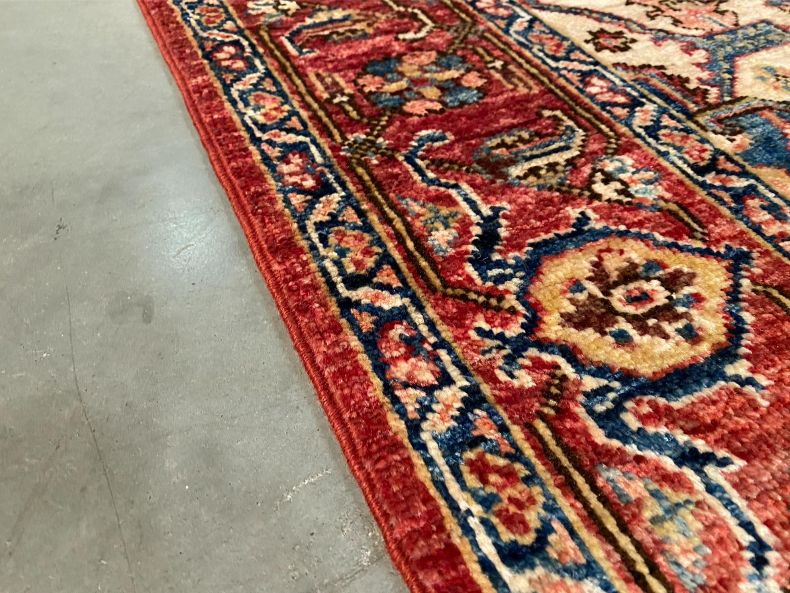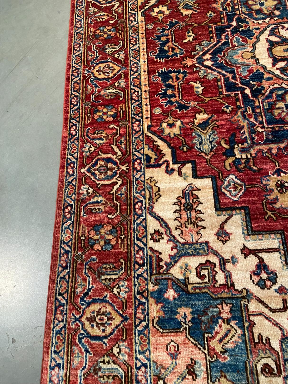 | 5'.1"x7' Super quality and weave Rug, hand spun and hand knotted in Pakistan 100% Vegge Dye natural wool pile with luxurious sheen , in Red , Navy blue Ivory and multi accent colors. |