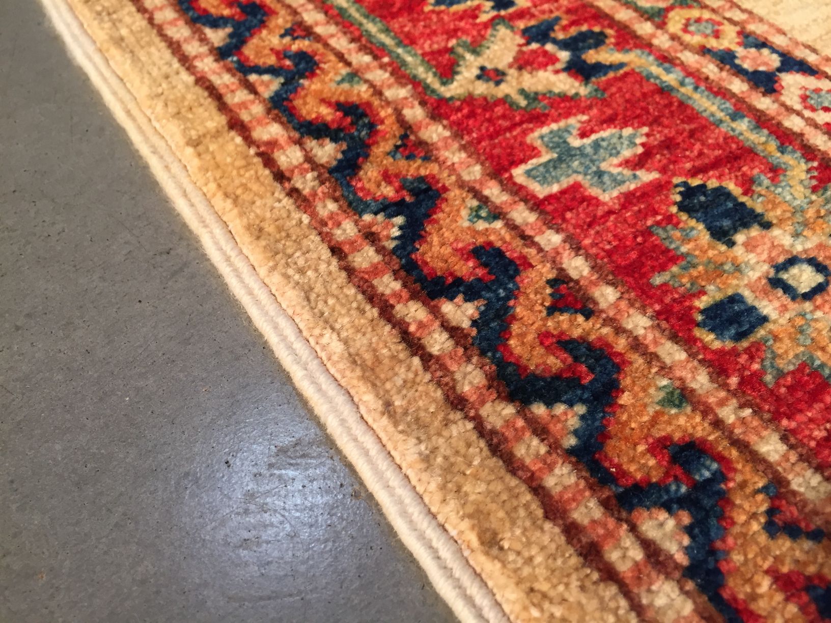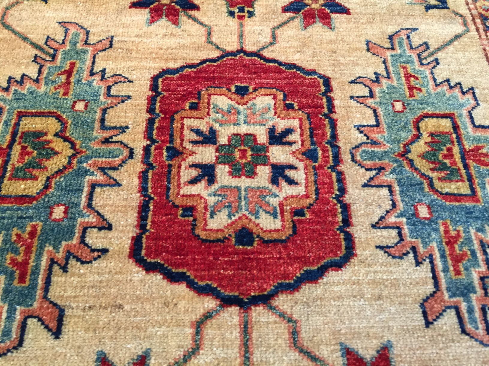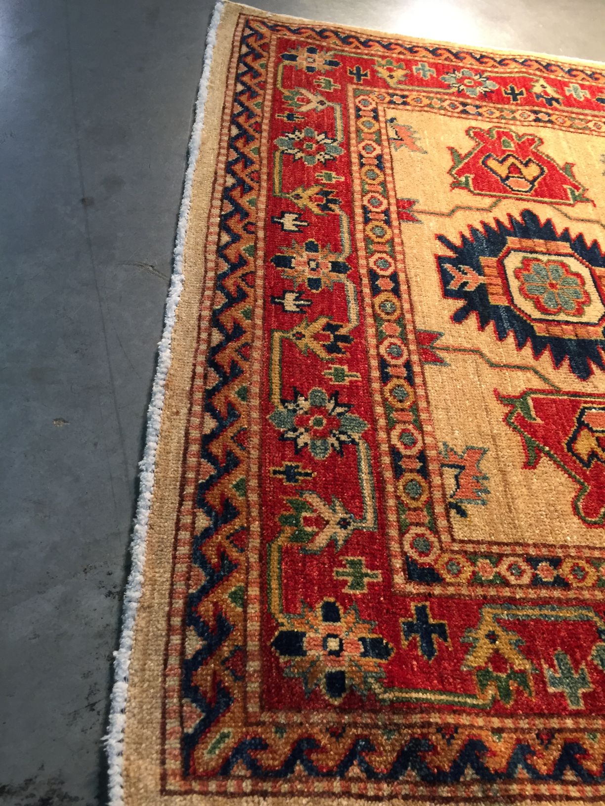 3'.2"X5'.0" Hand Knotted 100% Veggie Dye Natural wool Pile Geometric pattern Kazak rug in decorative Tan, Blue, red and multi accent colors Hand Knotted in Pakistan.