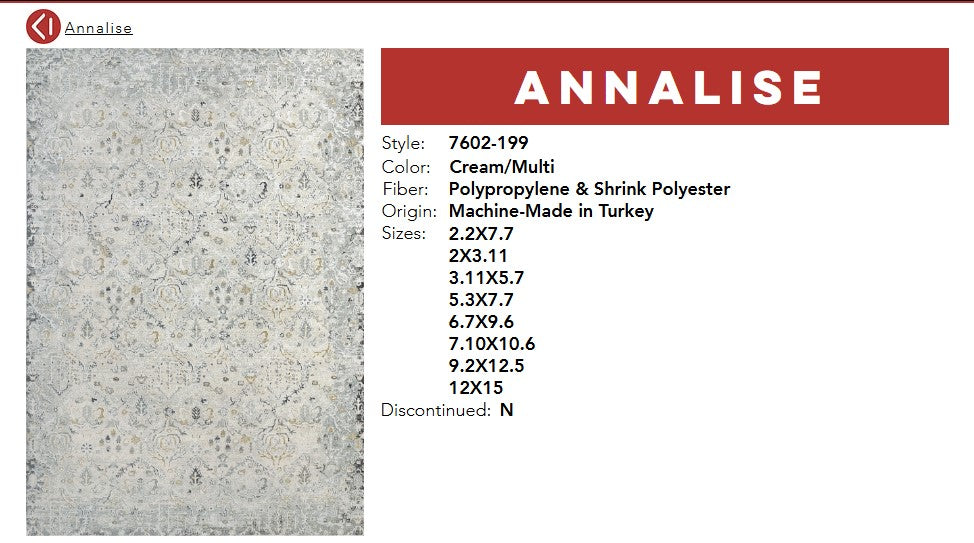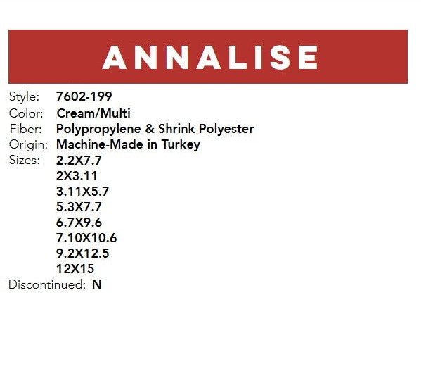 The Annalise collection is made of polypropylene and shrink polyester, machine-made in Turkey. The collection features traditional designs that add a layer of elegance to any room. The traditional look is combined with Cream and Multi Color that compliment a variety of home décor styles. Thanks to its composition, this rug is soft to the touch, but also holds up well in high-traffic areas.