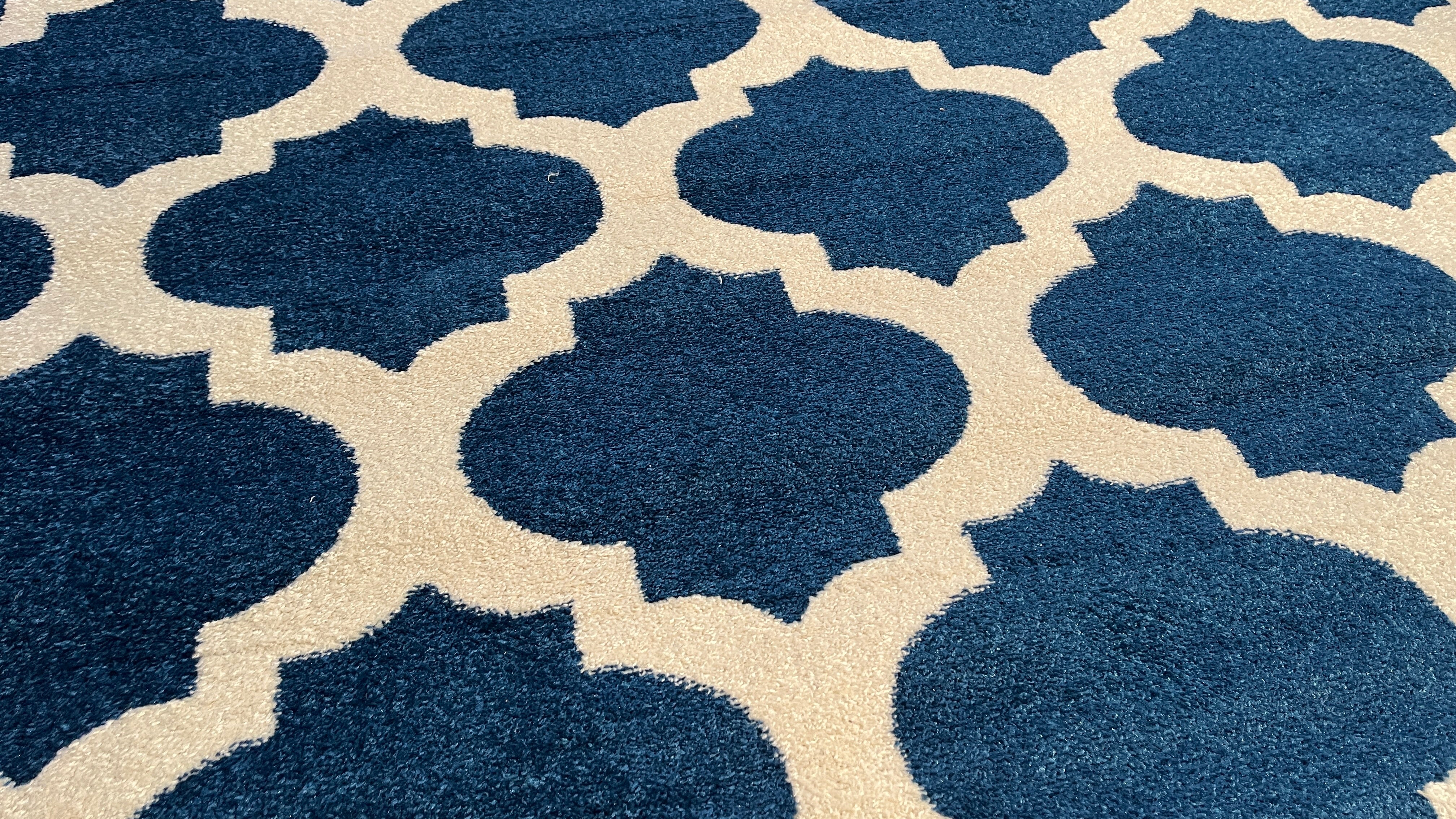 Decorative trendy style area rug in contemporary lattice moroccan design Navy Blue and Ivory colors, premium quality twisted ,textured machine made in turkey, made of durable and easy care wool like twisted yarn polypropylene pile, colorfast and stain resistant .
