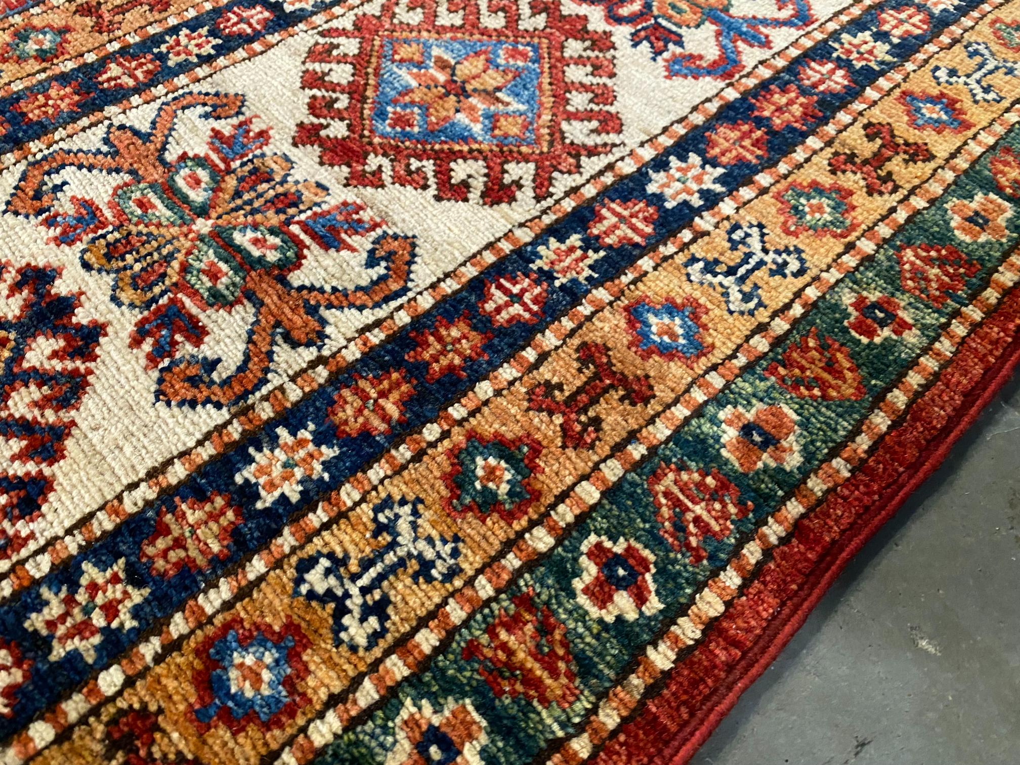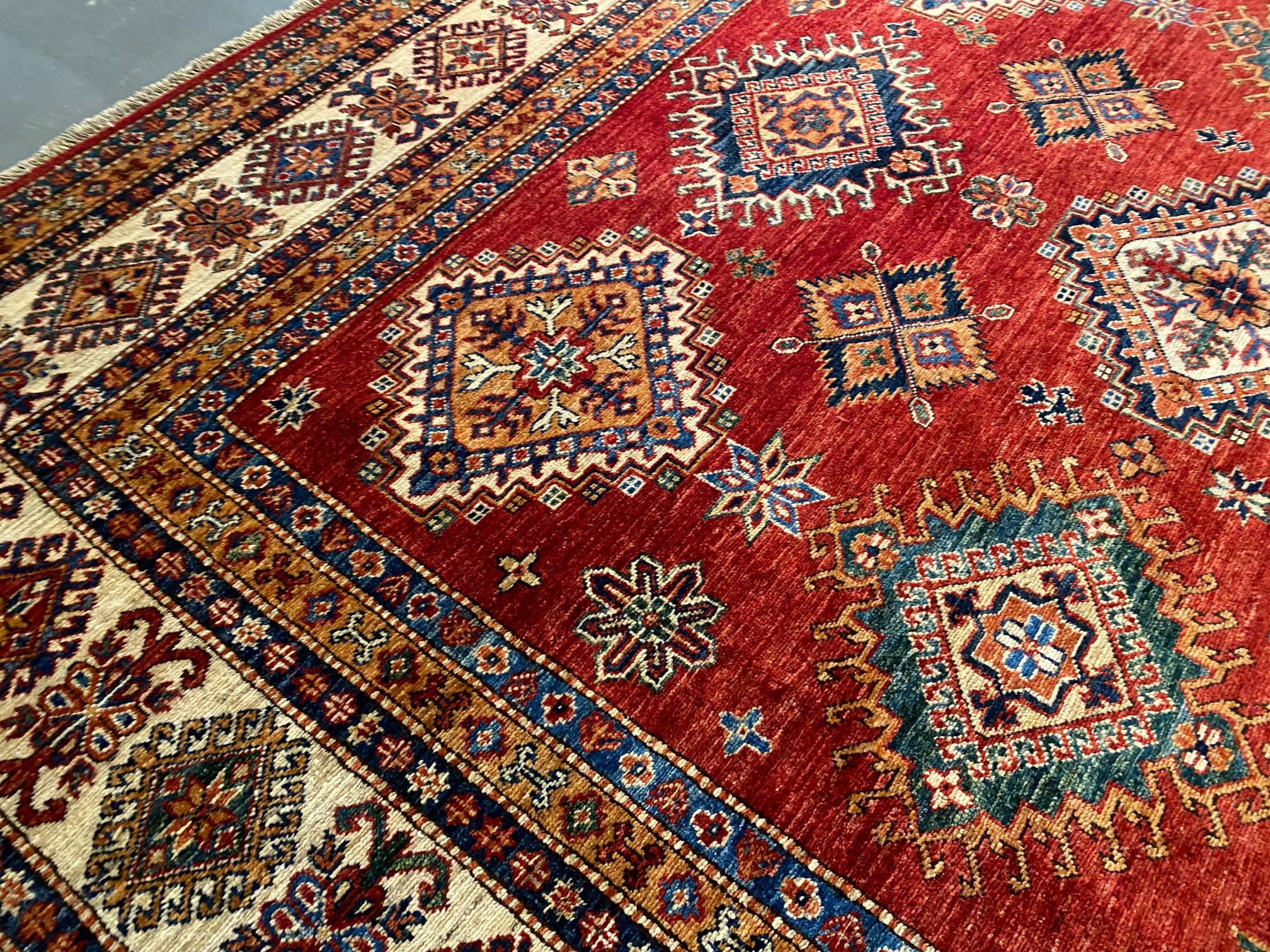 | 8'.2"x11'.2" Super quality Unique design Kazak Rug, hand spun and hand knotted rug in Pakistan 100% Vegge Dye natural wool with luxurious sheen Pile , in Vivid Red, Ivory and multi accent colors. |