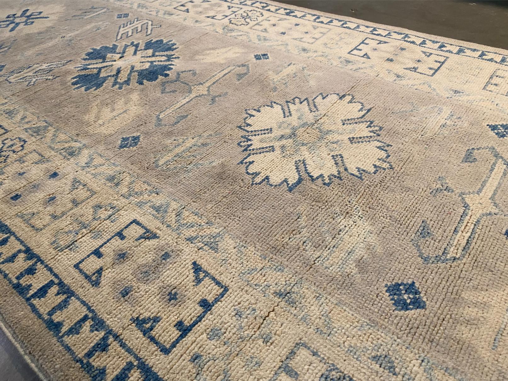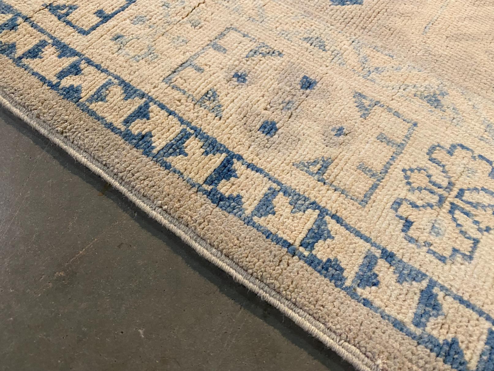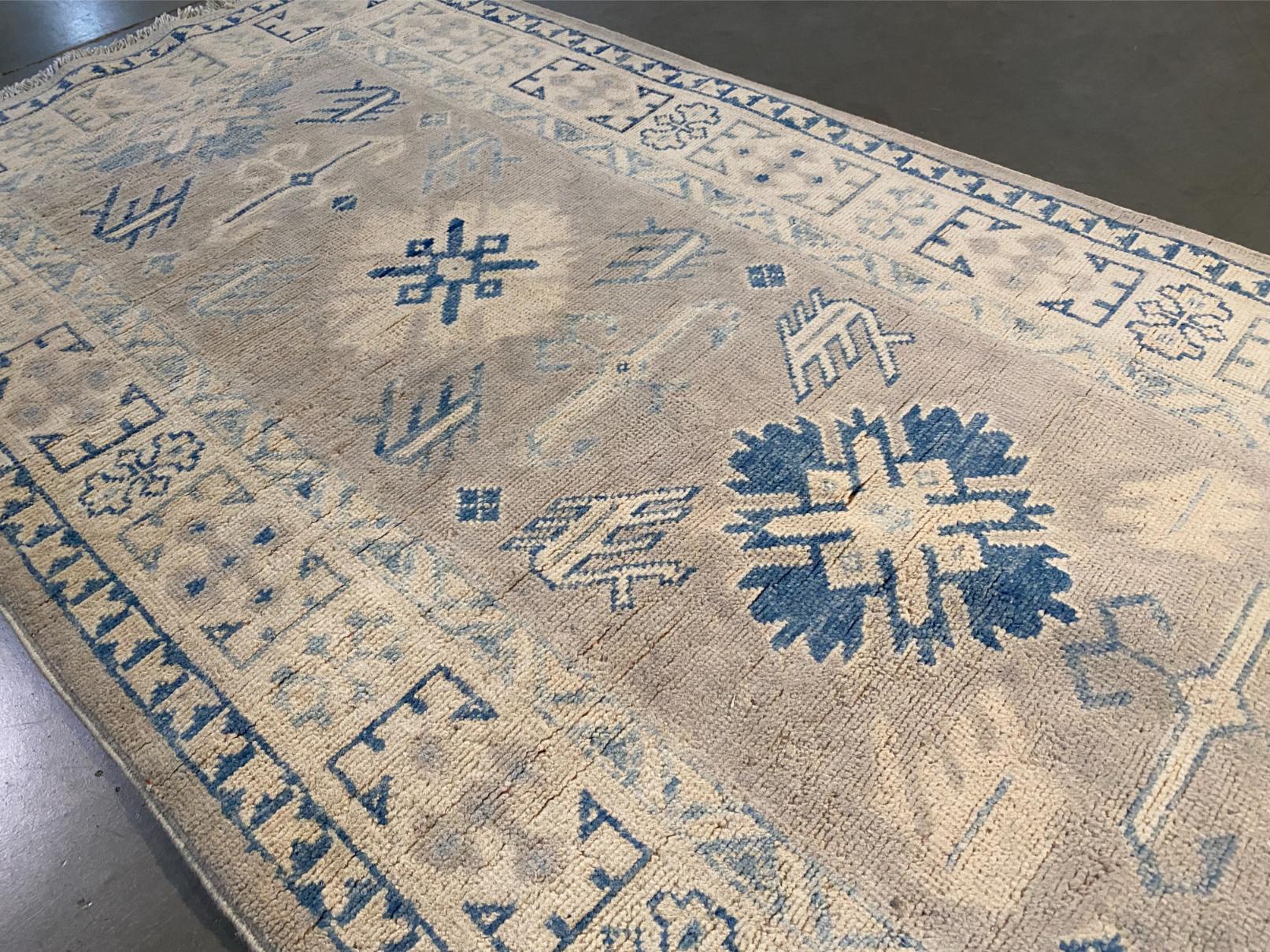 | 2'.8"x9'.9" Super quality Kazak Runner in Antique finish , hand spun and hand knotted in Pakistan 100% natural Veggey Dye wool Pile , in Antique muted Taupe, Ivory and shades of blue multi accent colors. |