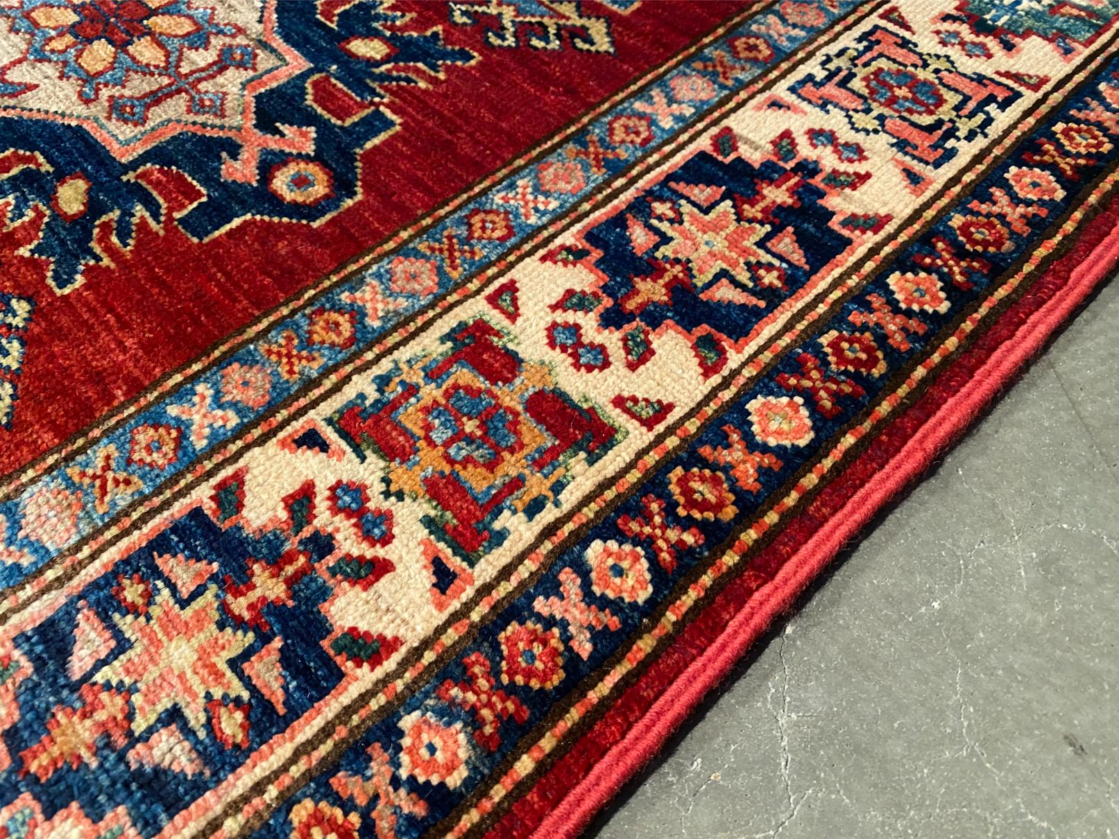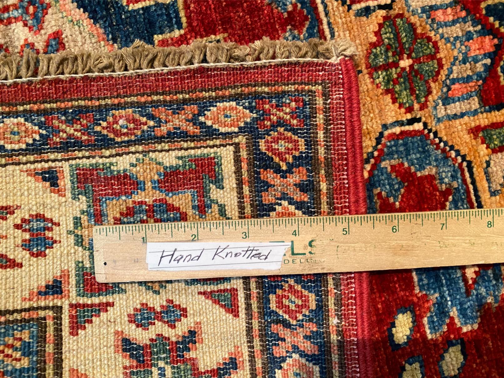 | 2'.7"x9'.8" Super quality Unique design Kazak Runner, hand spun and hand knotted in Pakistan 100% Vegge Dye natural wool Pile, in Vivid Red,Ivory and multi accent colors. |