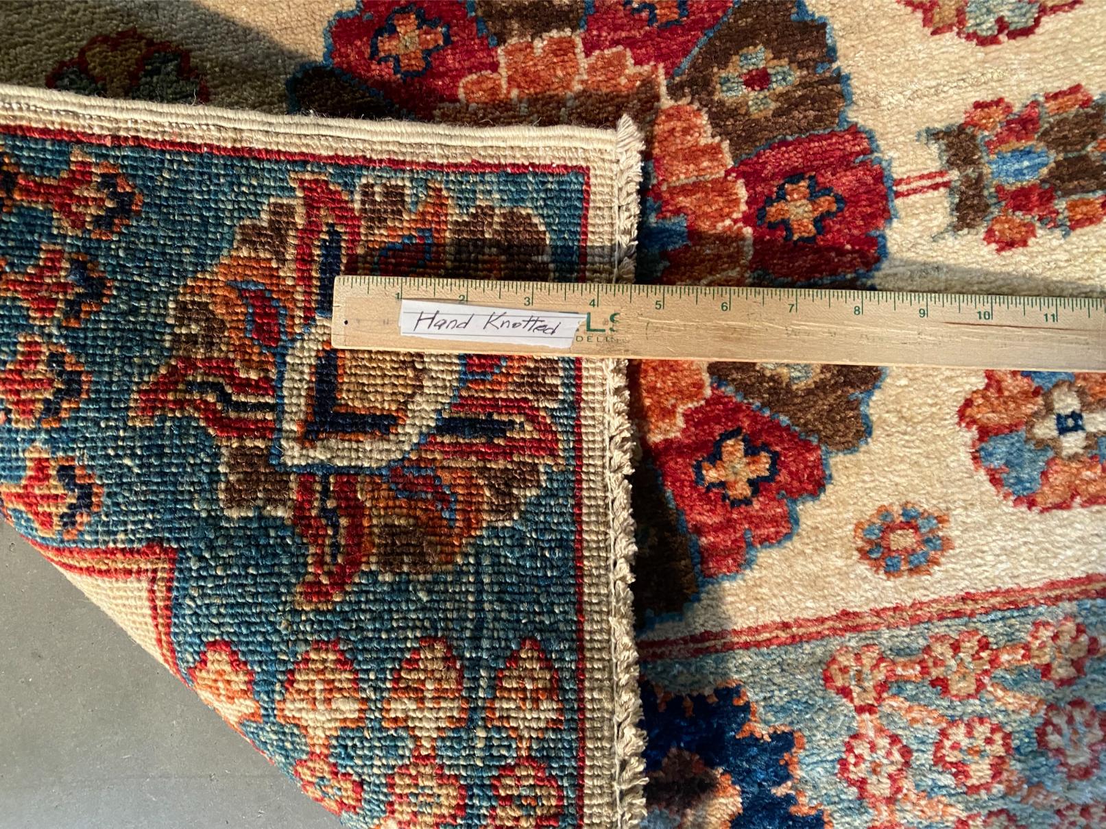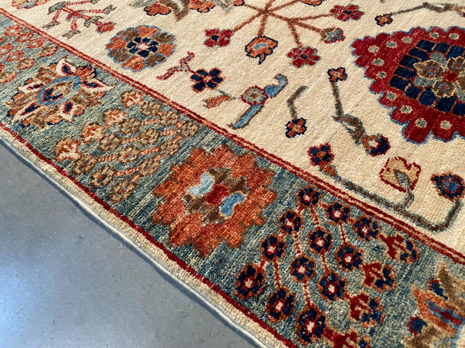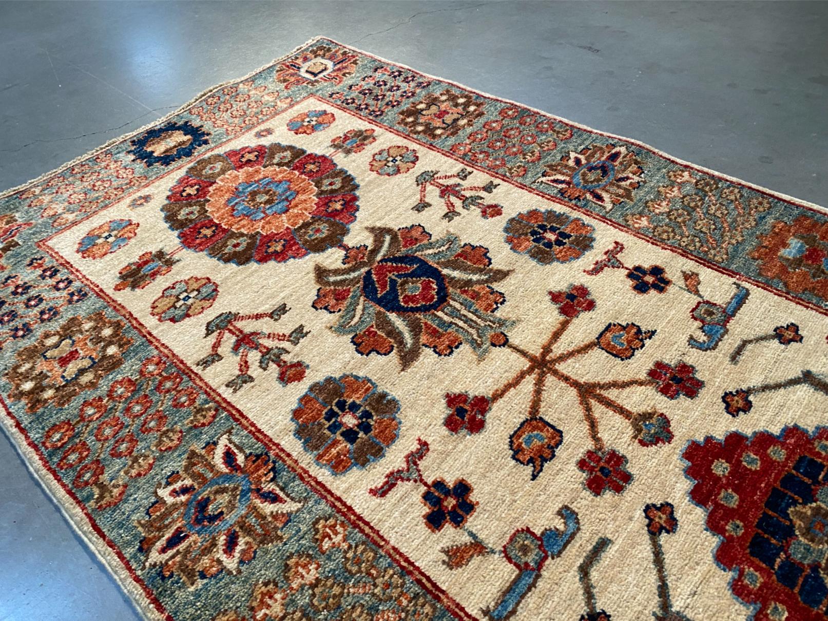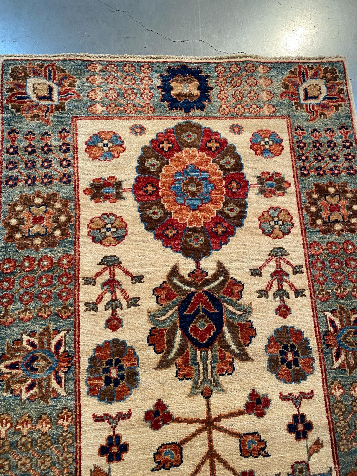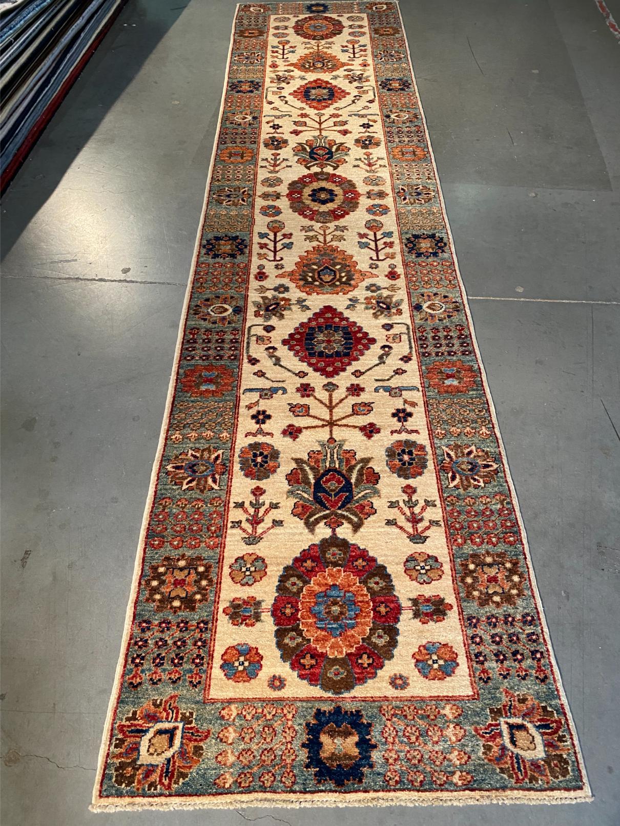 | 2'.8"x11'.8" Super quality Unique Tribal design Aryana Runner, hand spun and hand knotted in Pakistan 100% Vegge Dye natural wool in amazing softs happy colors , Ivory , blue and multi accent colors. |