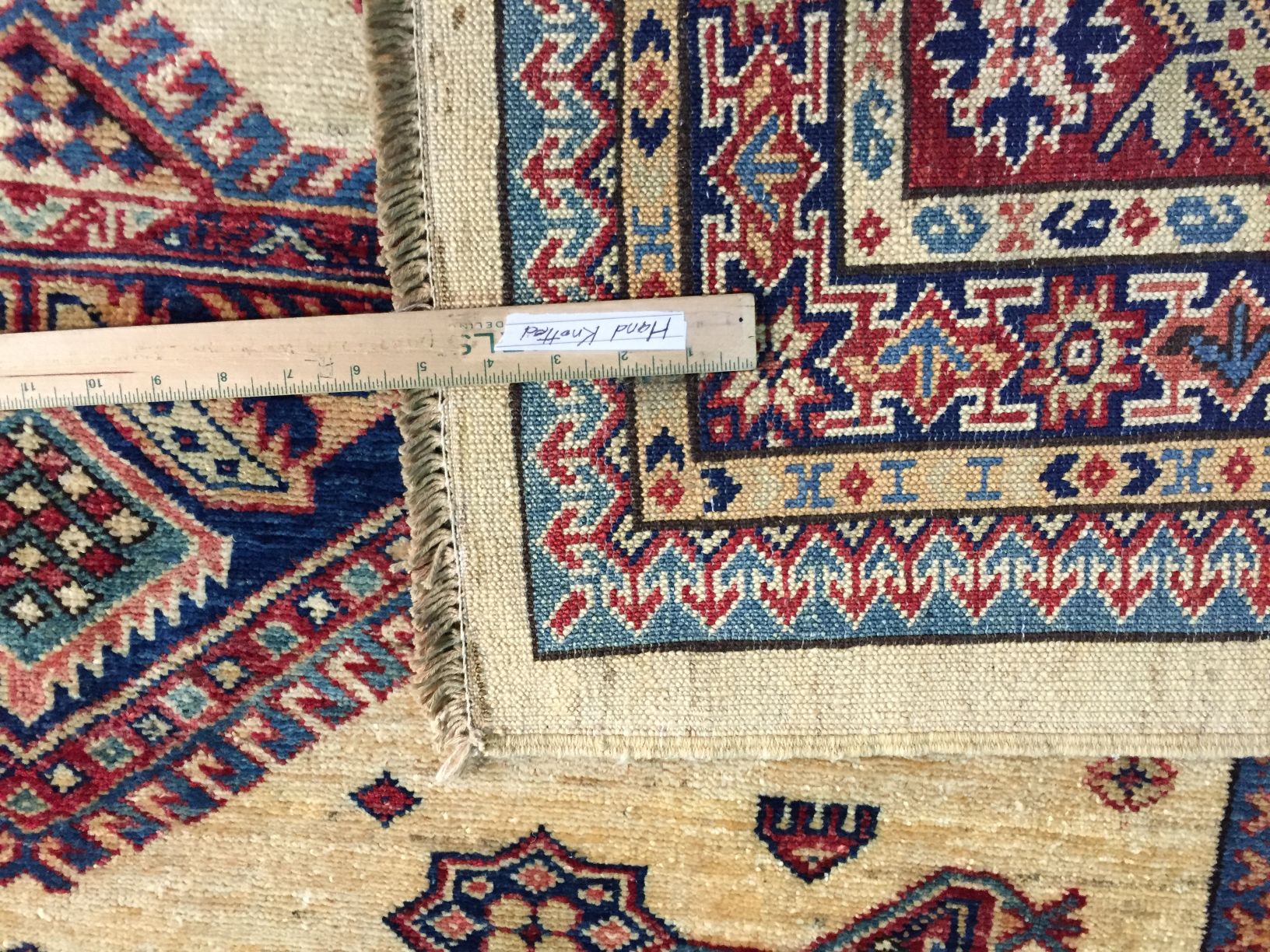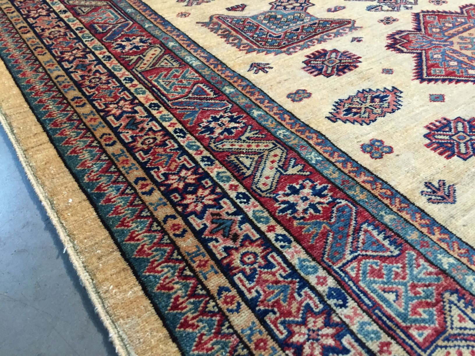 5.7 x8.1 Authentic Hand Knotted 100% Veggie Dye Natural hand spun wool Pile Geometric pattern super Kazak rug high sheen in decorative Ivory and multi accent colors Hand Knotted in Pakistan.