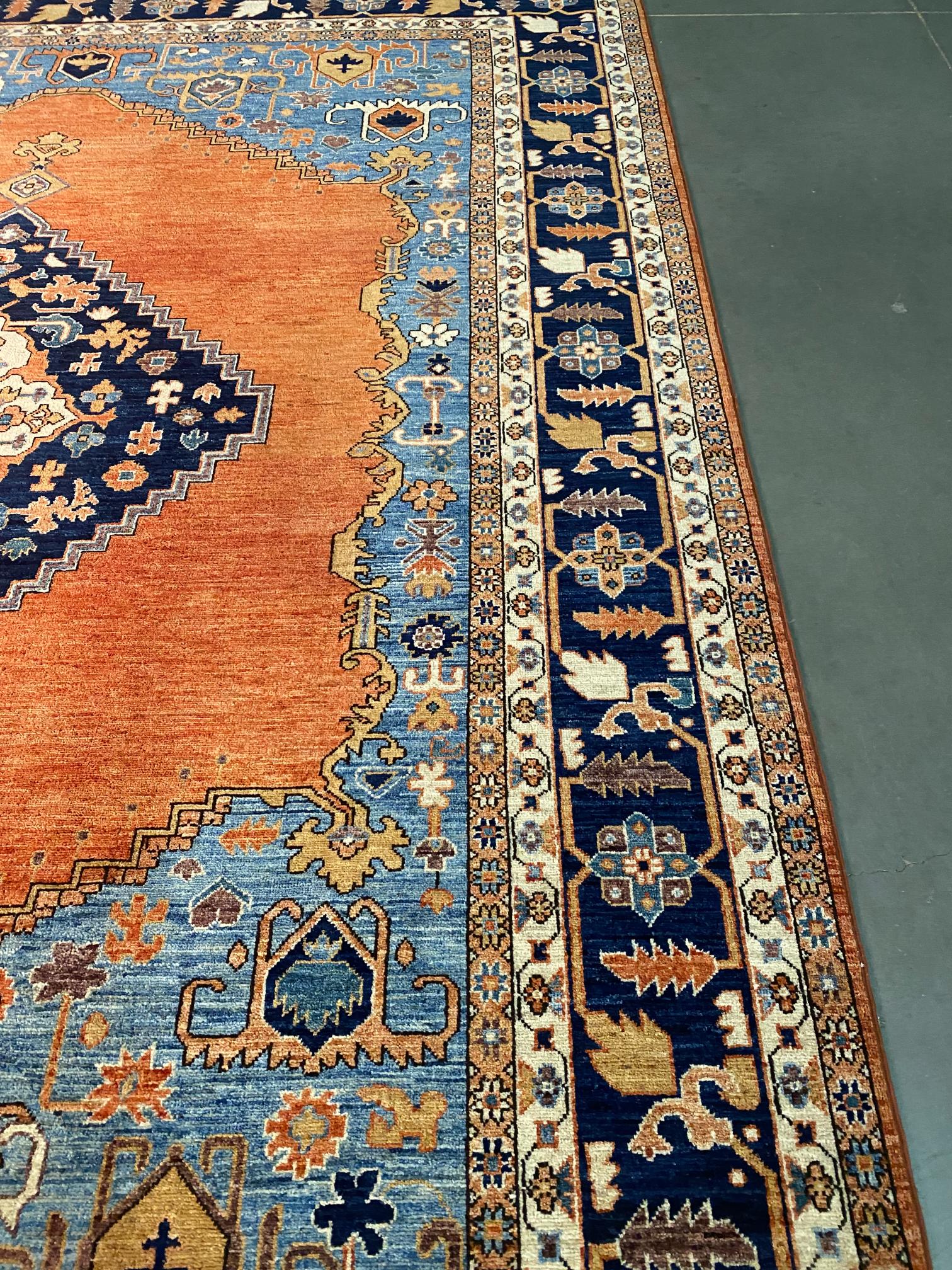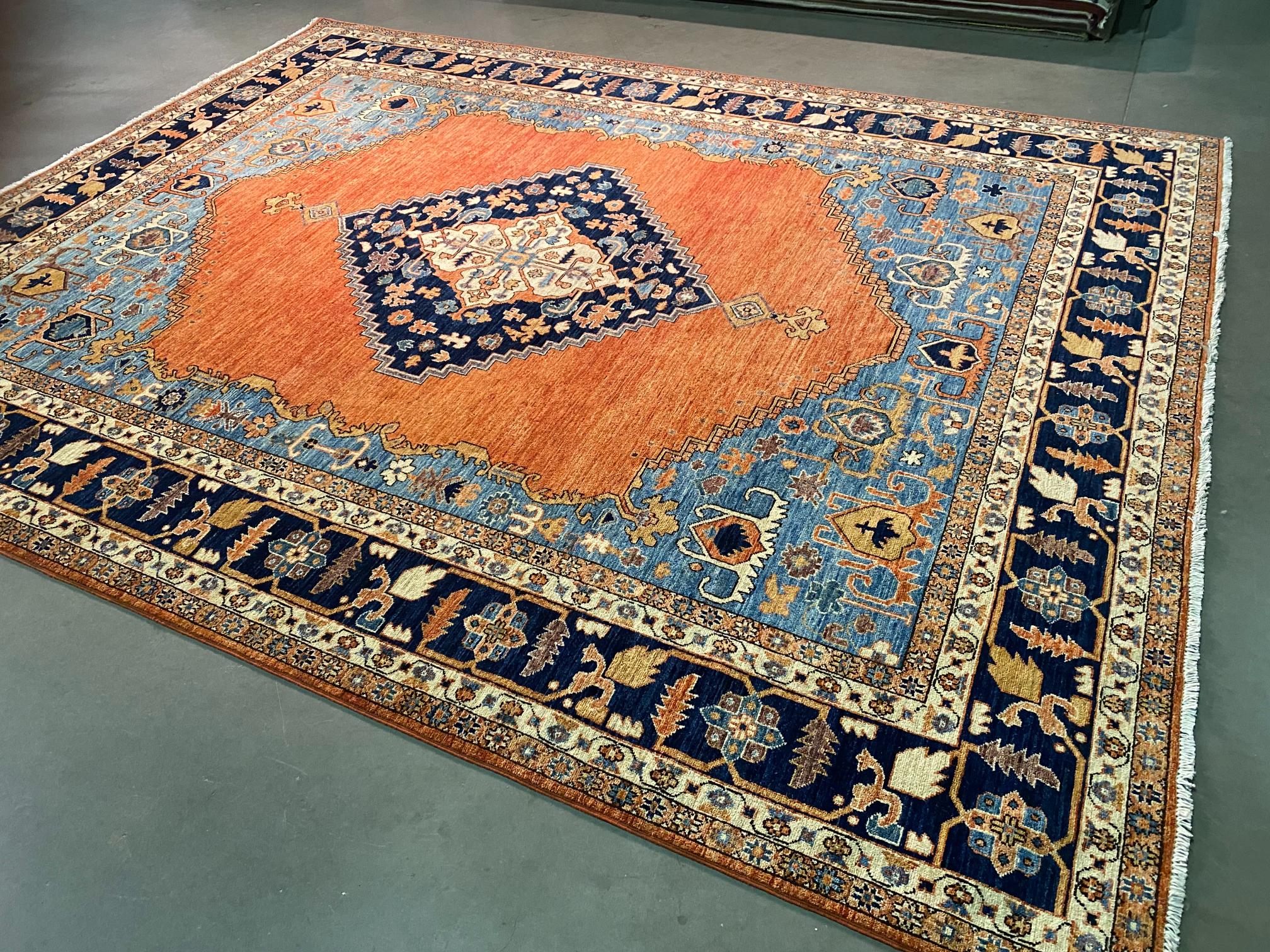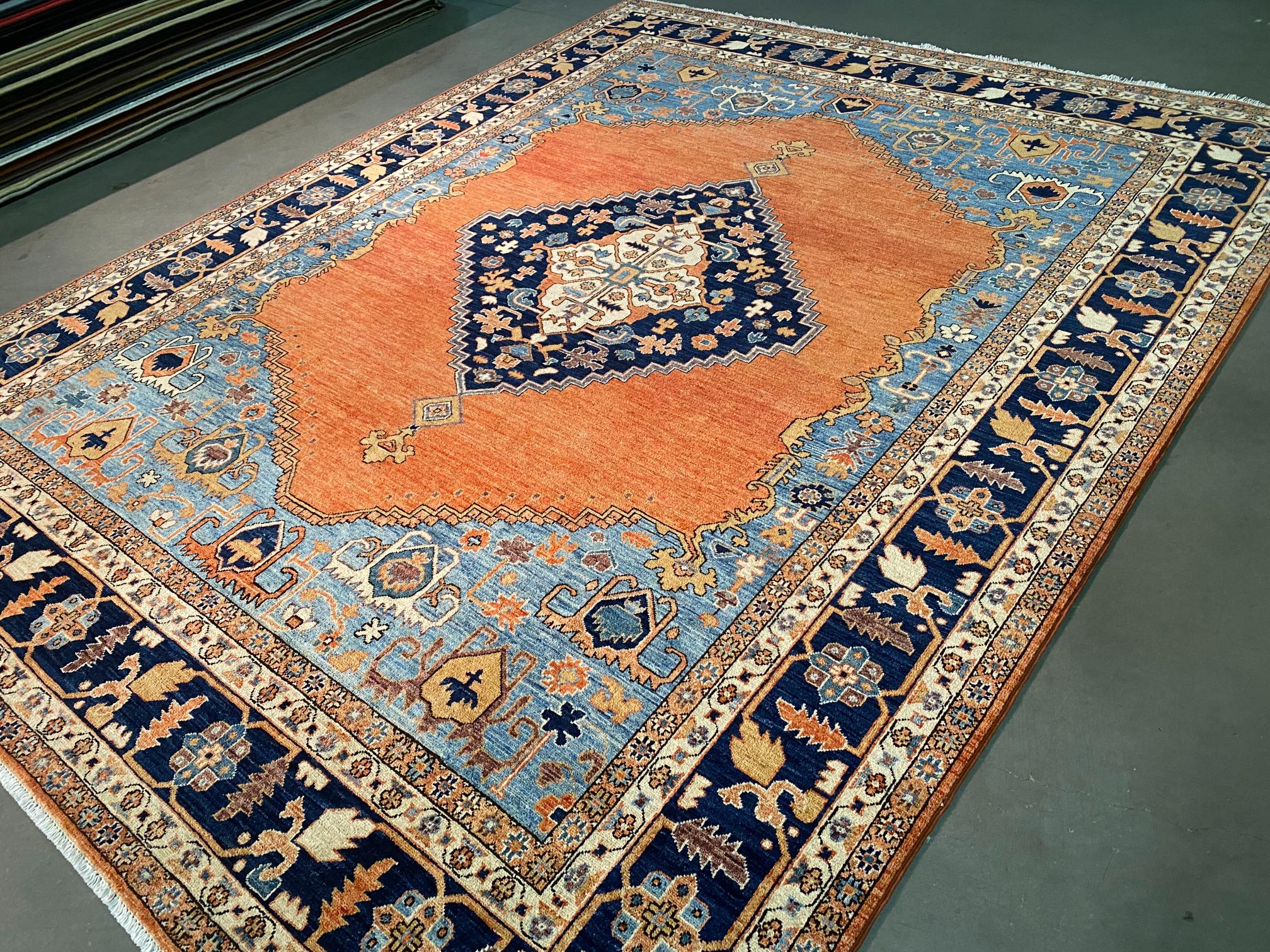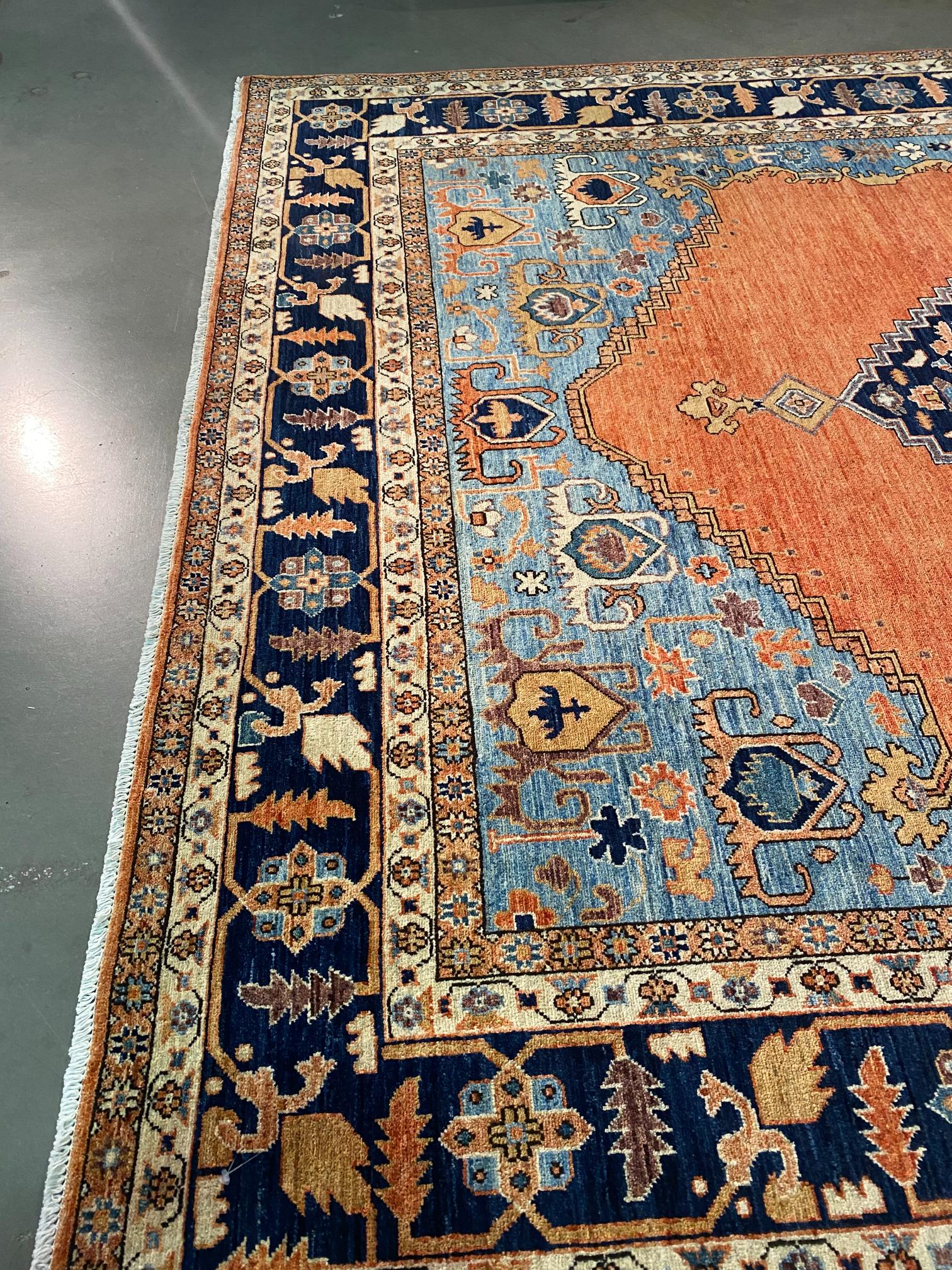 | 8'.2" X10'.6" Super quality and weave Serapi Medallion Design Rug, hand spun and hand knotted in Pakistan 100% Vegge Dye natural wool pile with luxurious sheen , in Orange rust , Dark and light blue, Ivory and multi accent colors. |