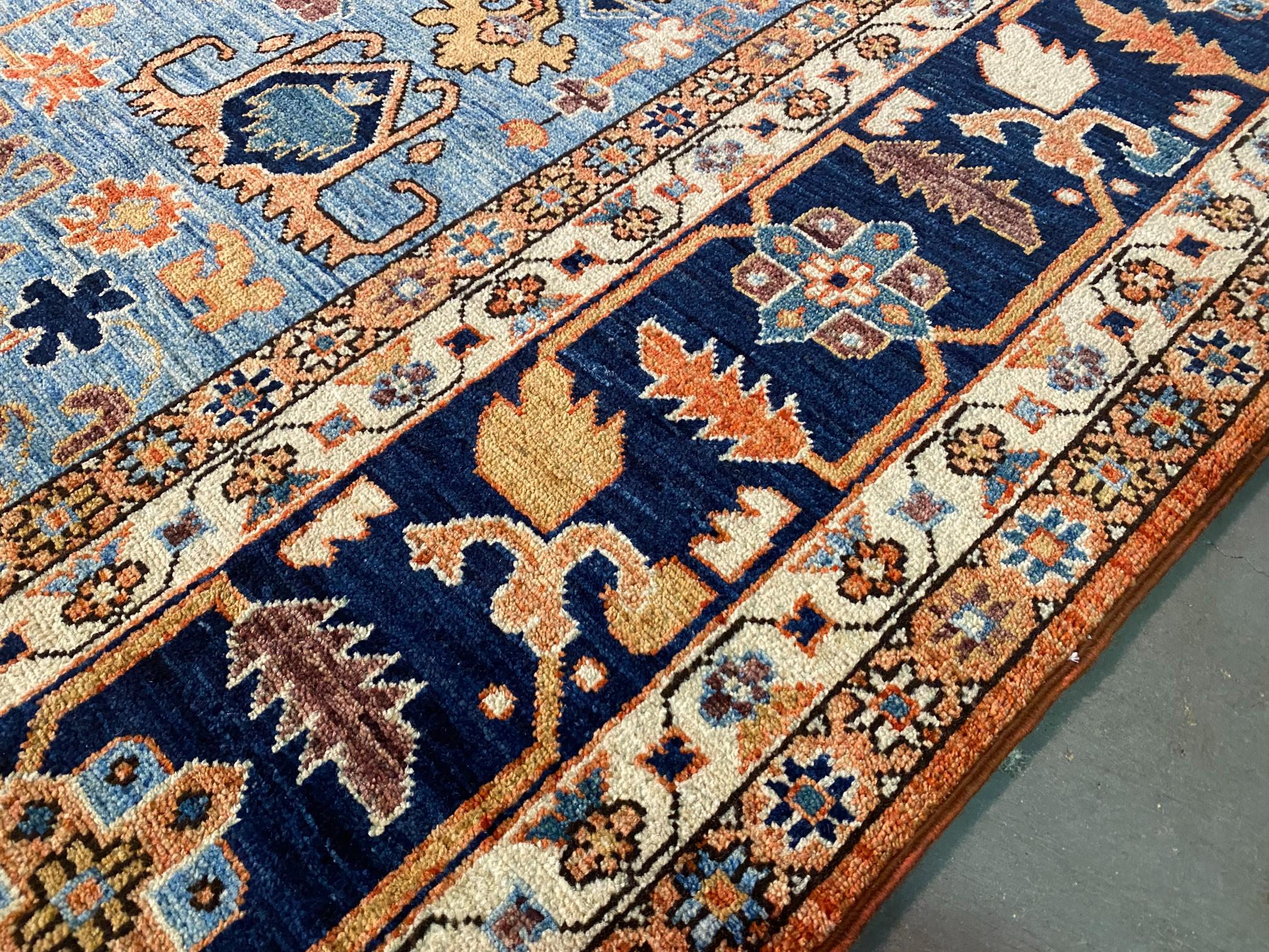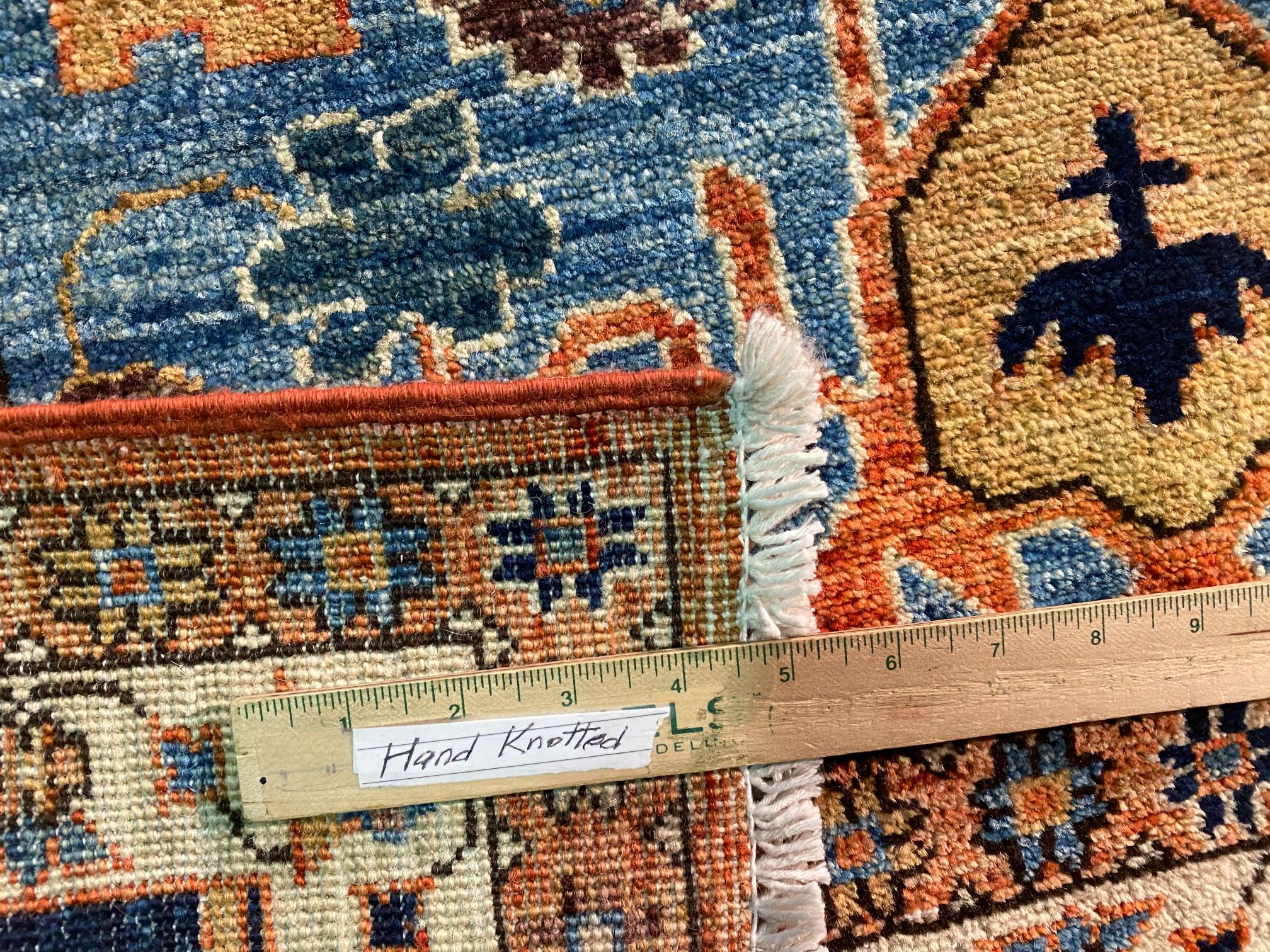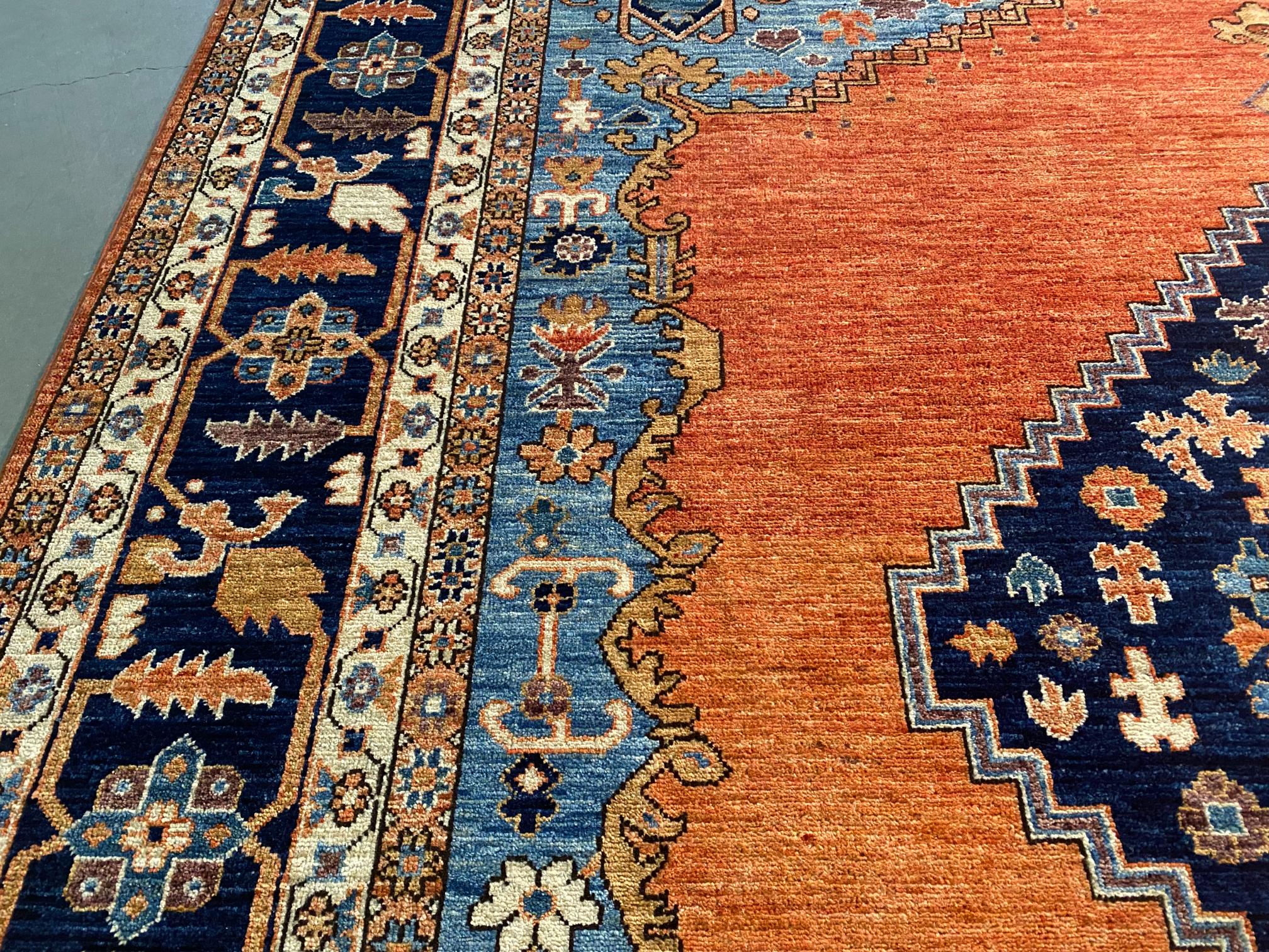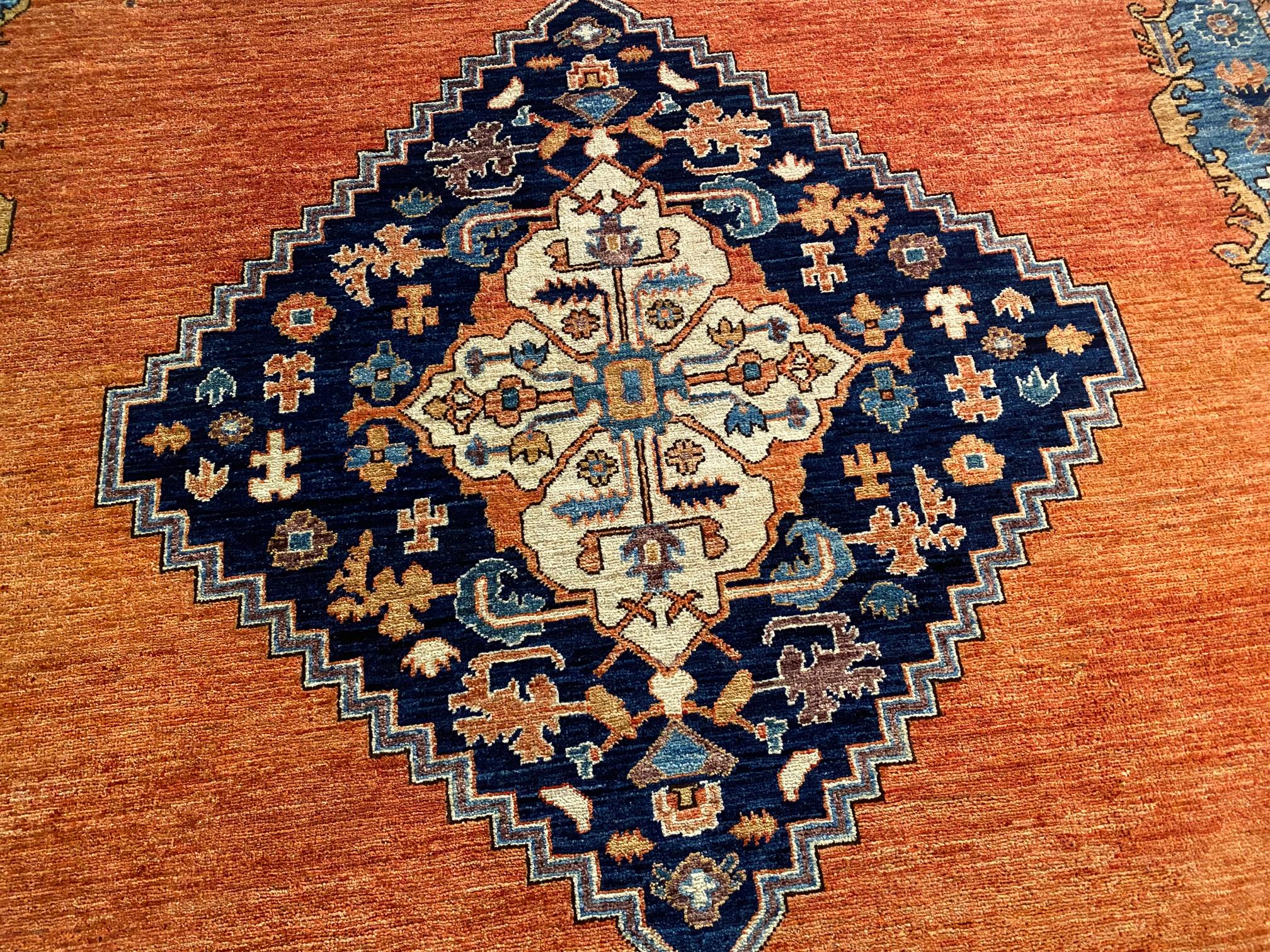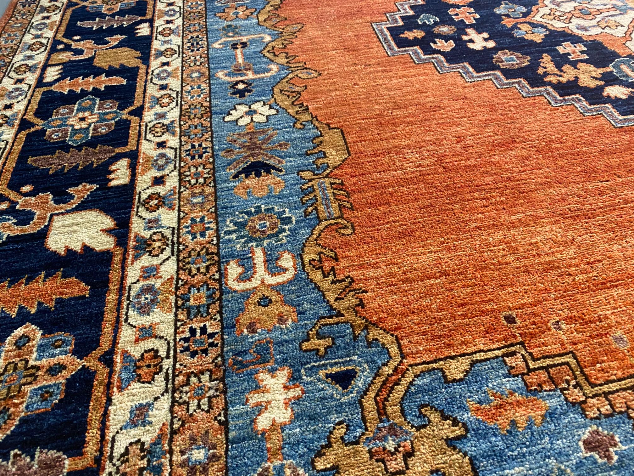 | 8'.2" X10'.6" Super quality and weave Serapi Medallion Design Rug, hand spun and hand knotted in Pakistan 100% Vegge Dye natural wool pile with luxurious sheen , in Orange rust , Dark and light blue, Ivory and multi accent colors. |
