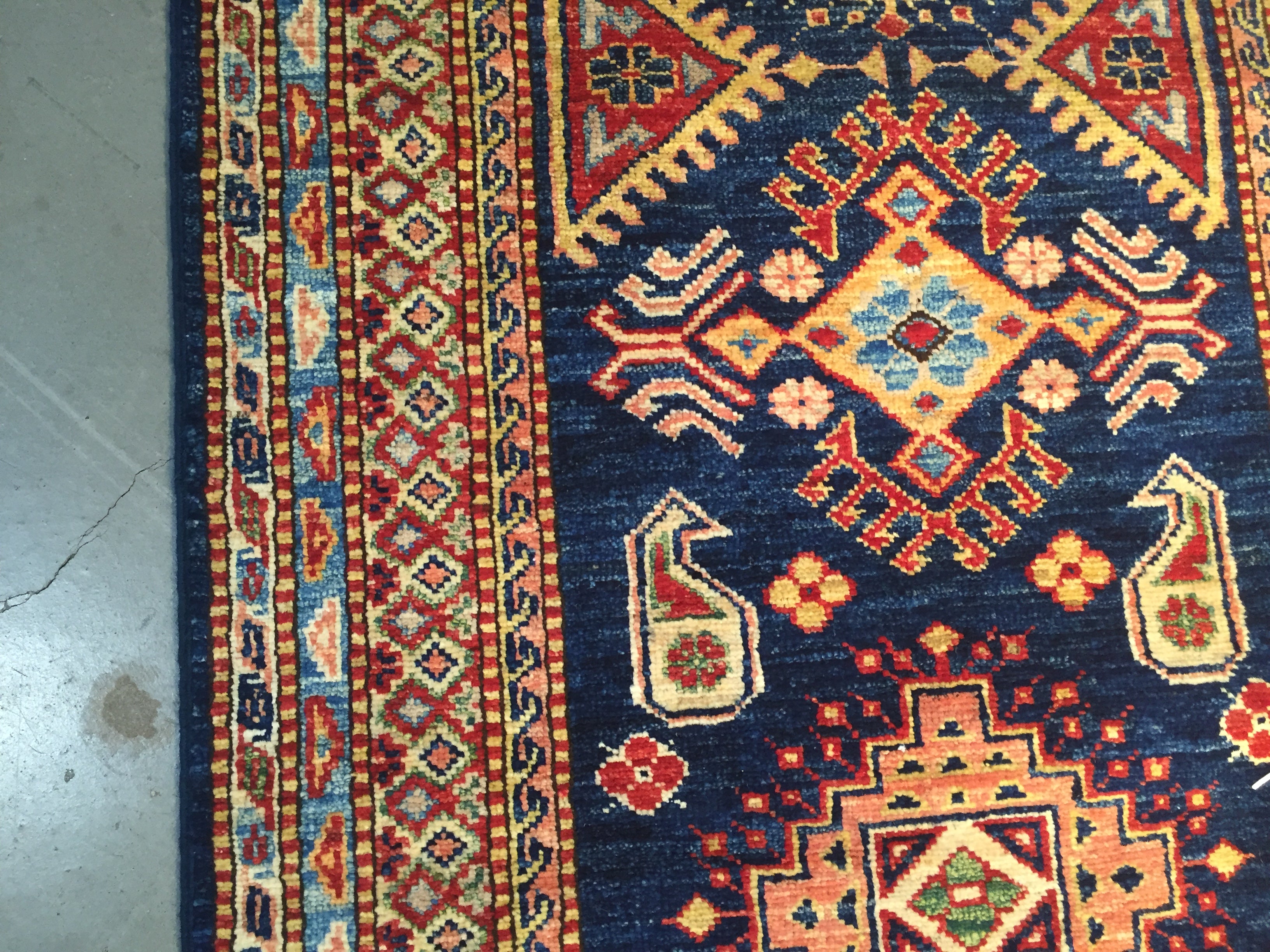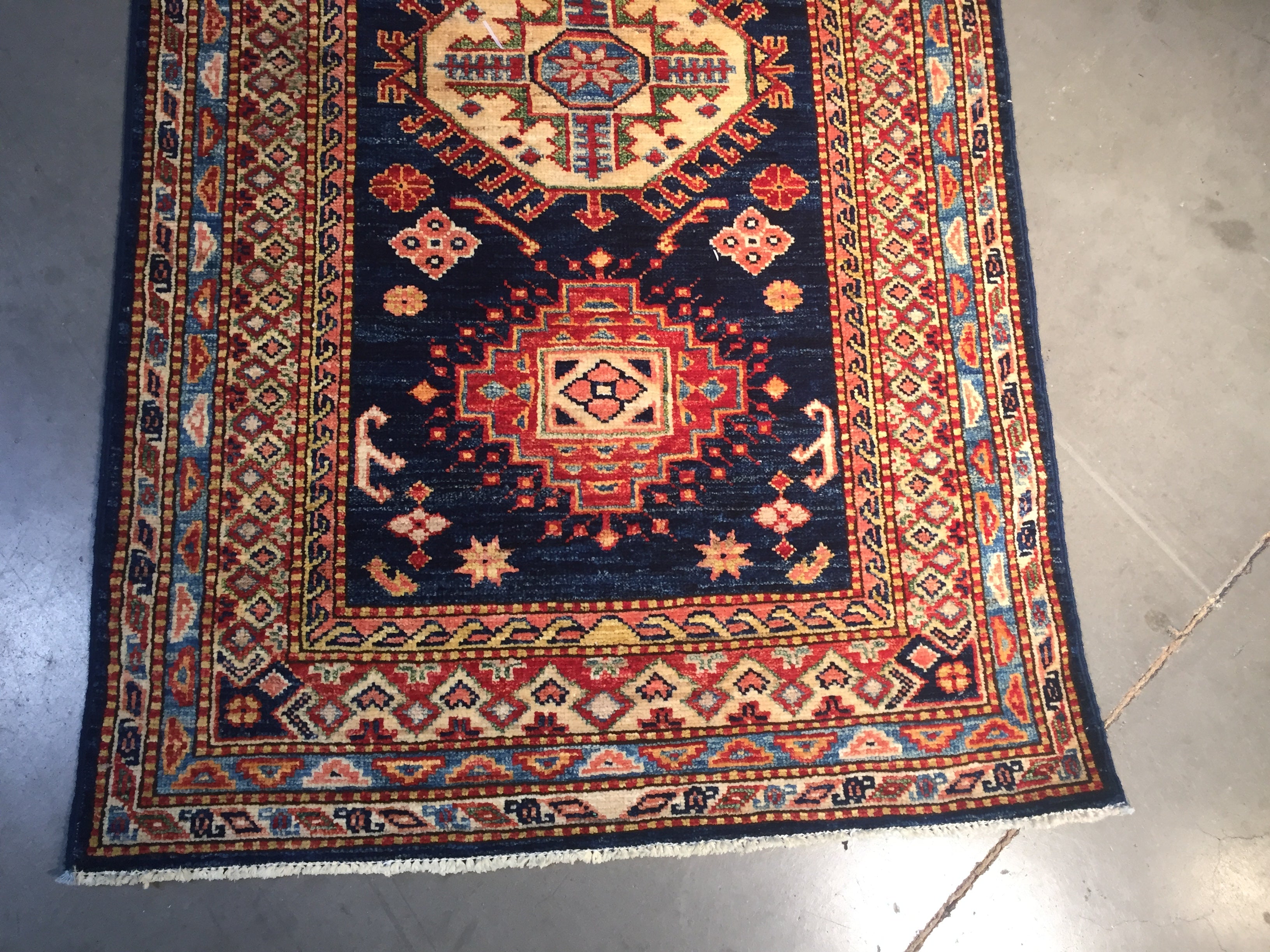 2.7x10.5 Super Kazak Hand Knotted 100% Veggie Dye Natural hand spun wool Pile Geometric in Navy blue, Ivory and multi accent colors Hand Knotted in Pakistan.